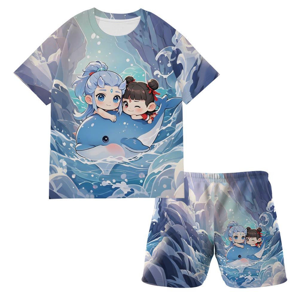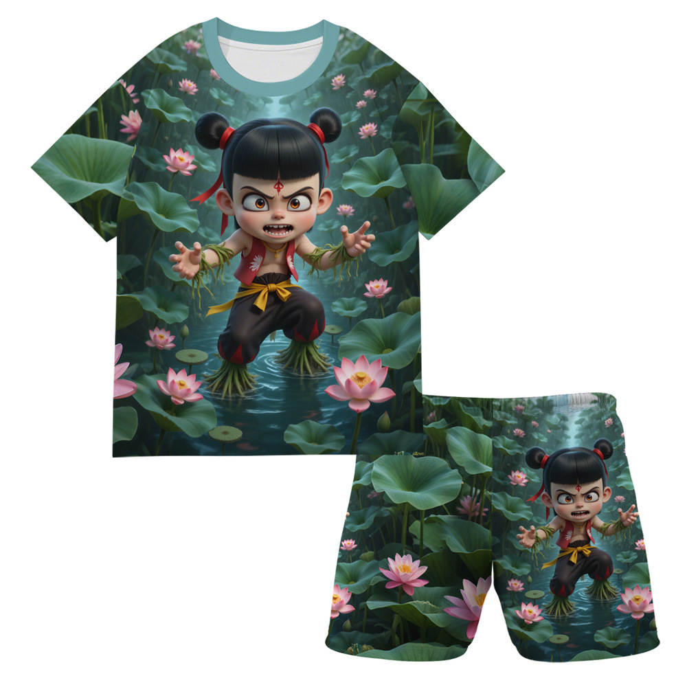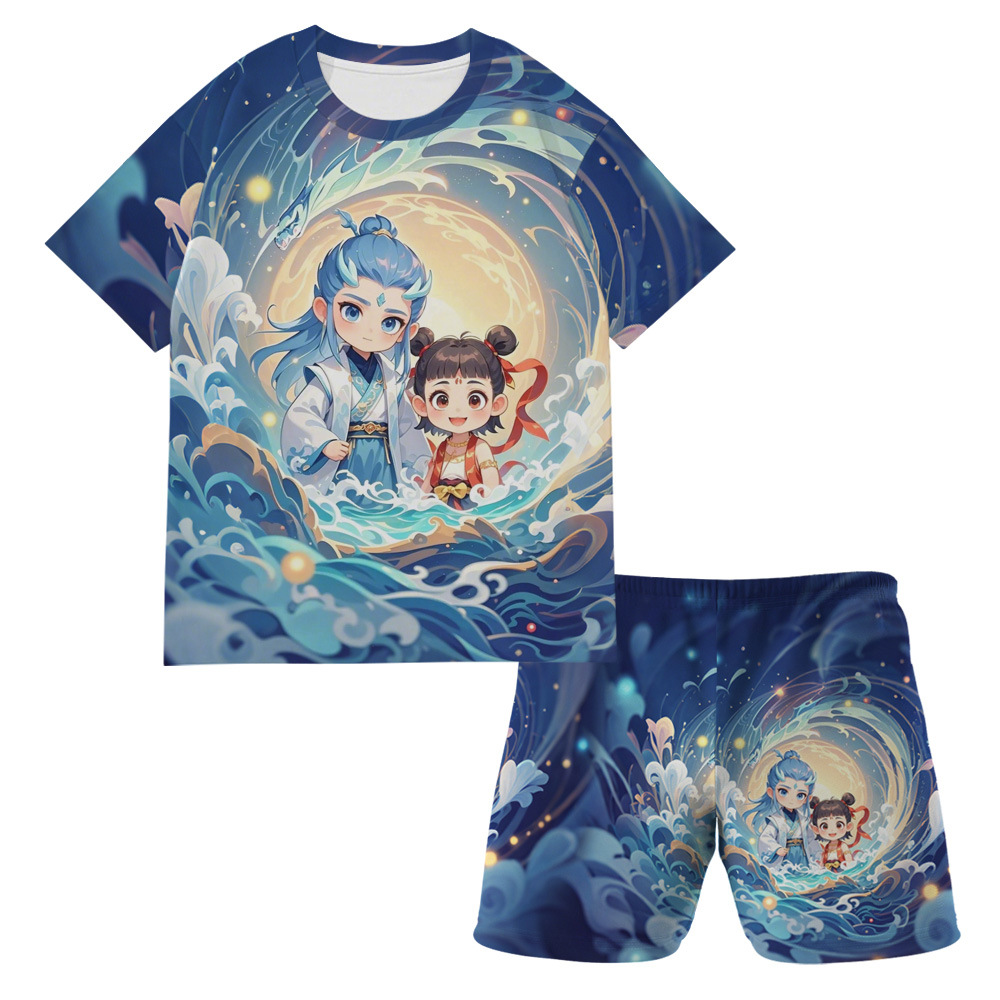 디지털 인쇄 여름 반바지 반팔 정장 캐주얼 티셔츠 패션 만화 인쇄 Nezha 아동 의류 시원하고 통기성스토어 가기