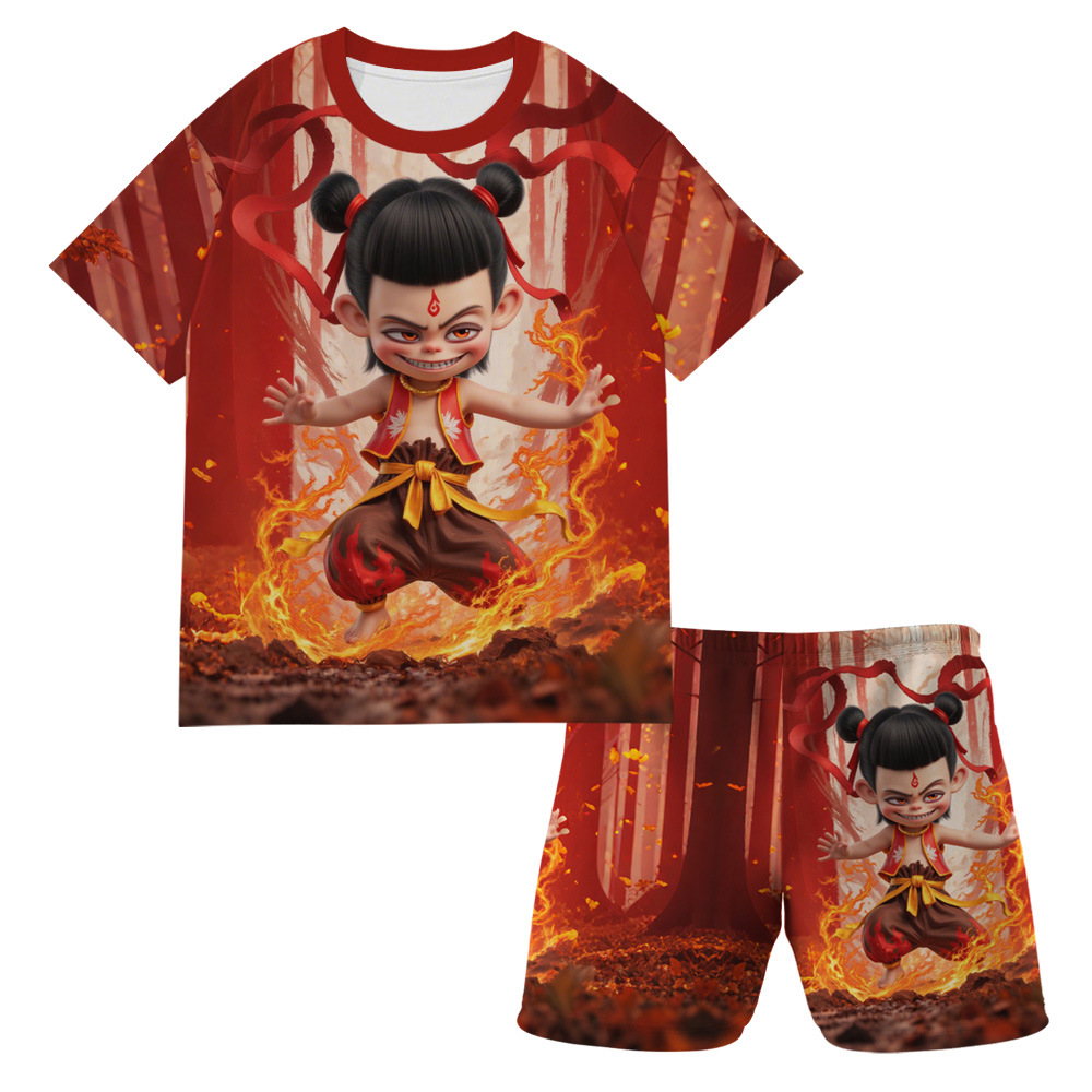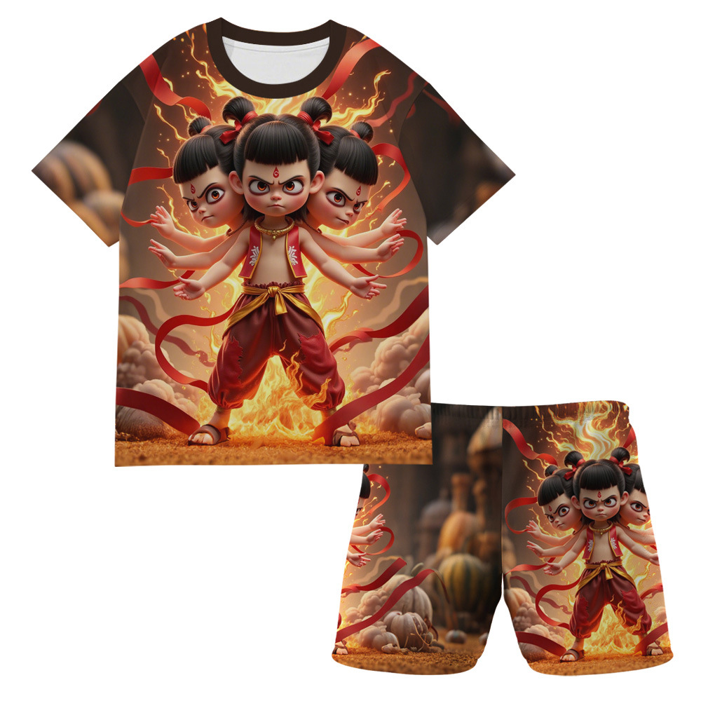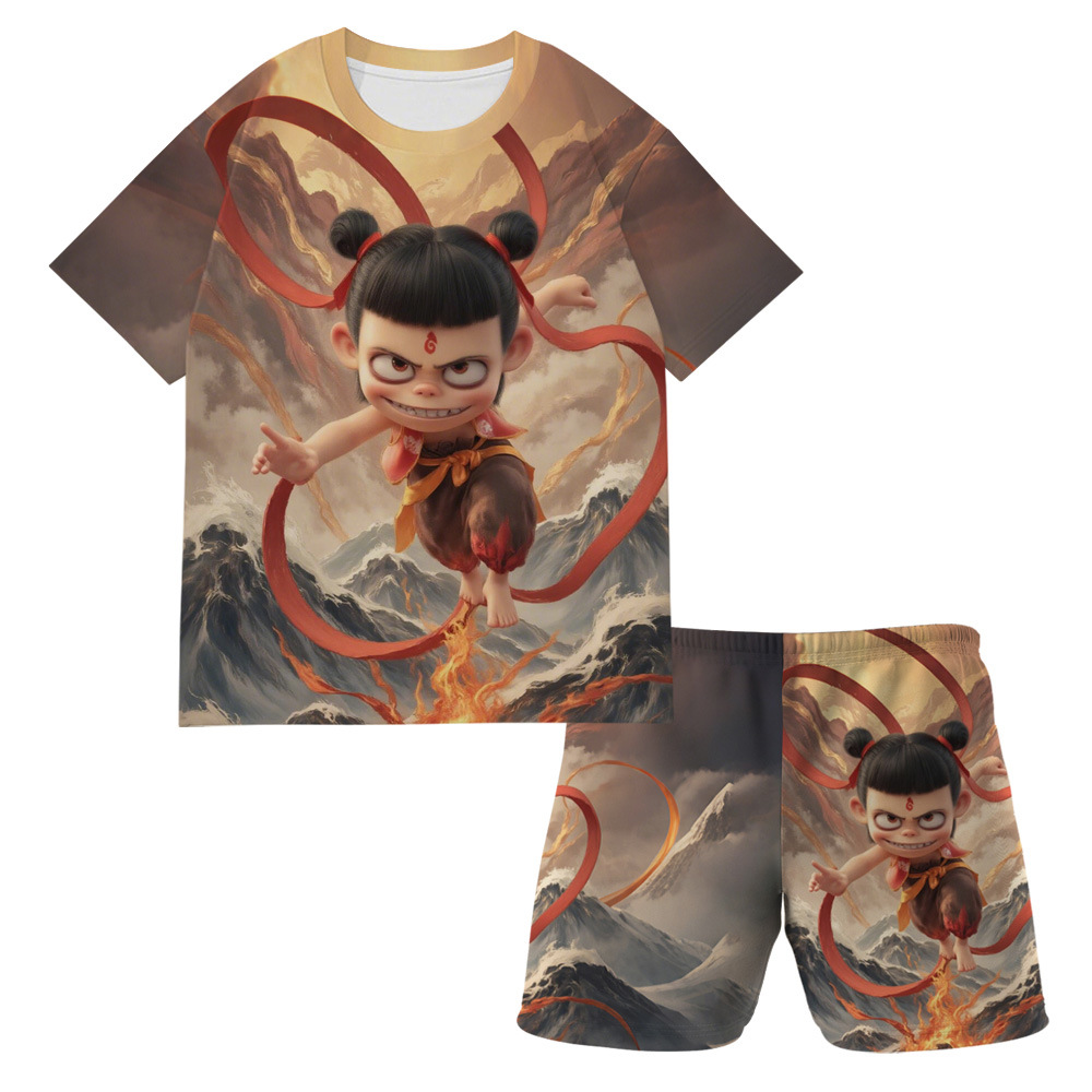 디지털 인쇄 여름 반바지 반팔 정장 캐주얼 티셔츠 패션 만화 인쇄 Nezha 아동 의류 시원하고 통기성