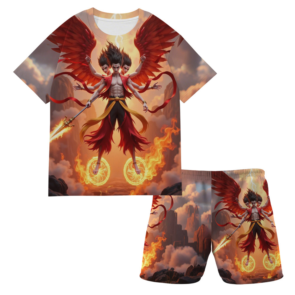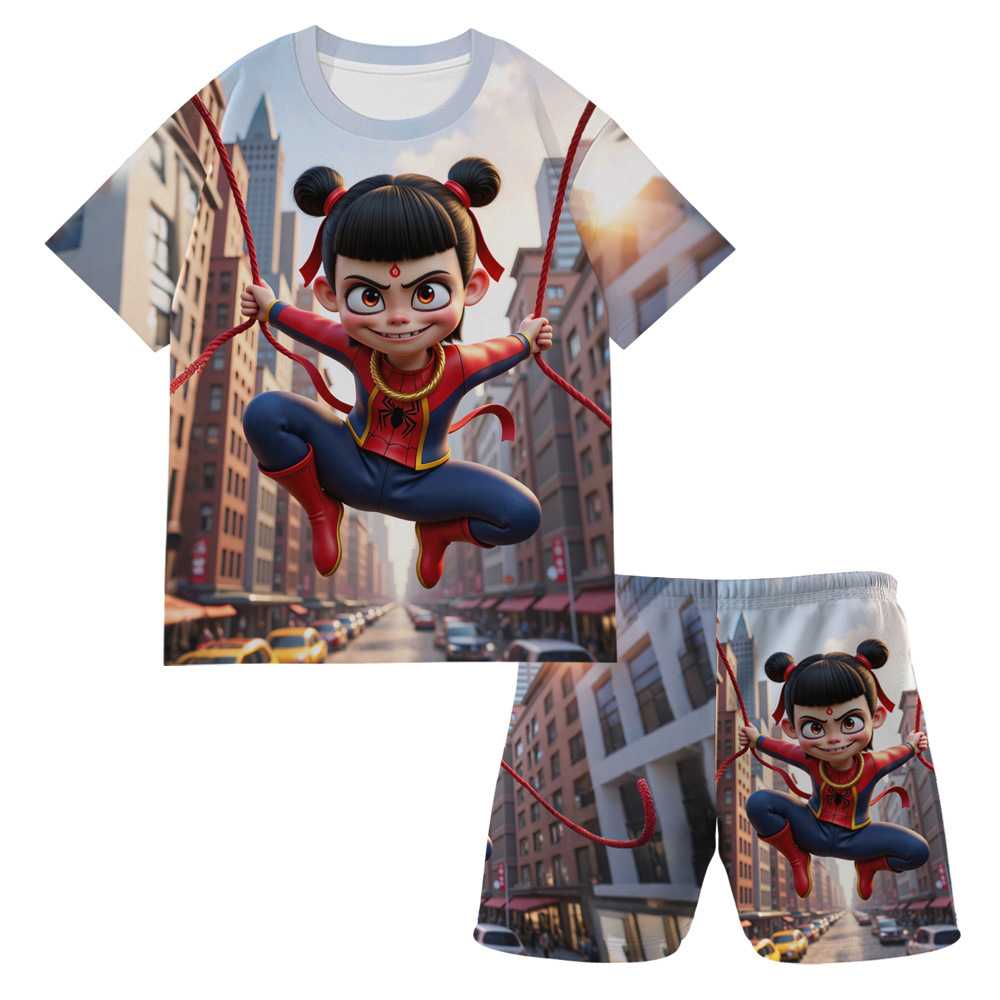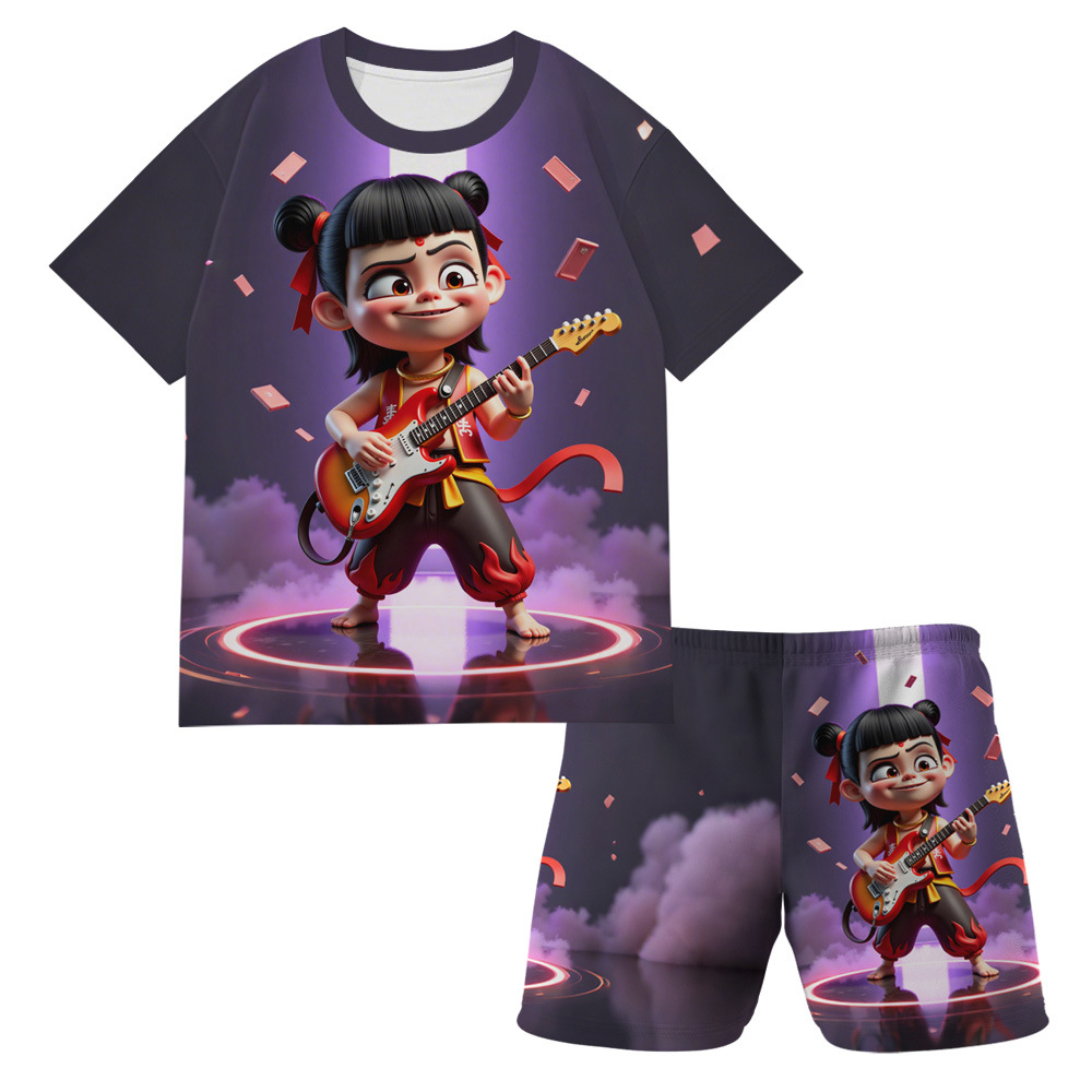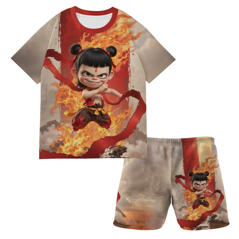 디지털 인쇄 여름 반바지 반팔 정장 캐주얼 티셔츠 패션 만화 인쇄 Nezha 아동 의류 시원하고 통기성