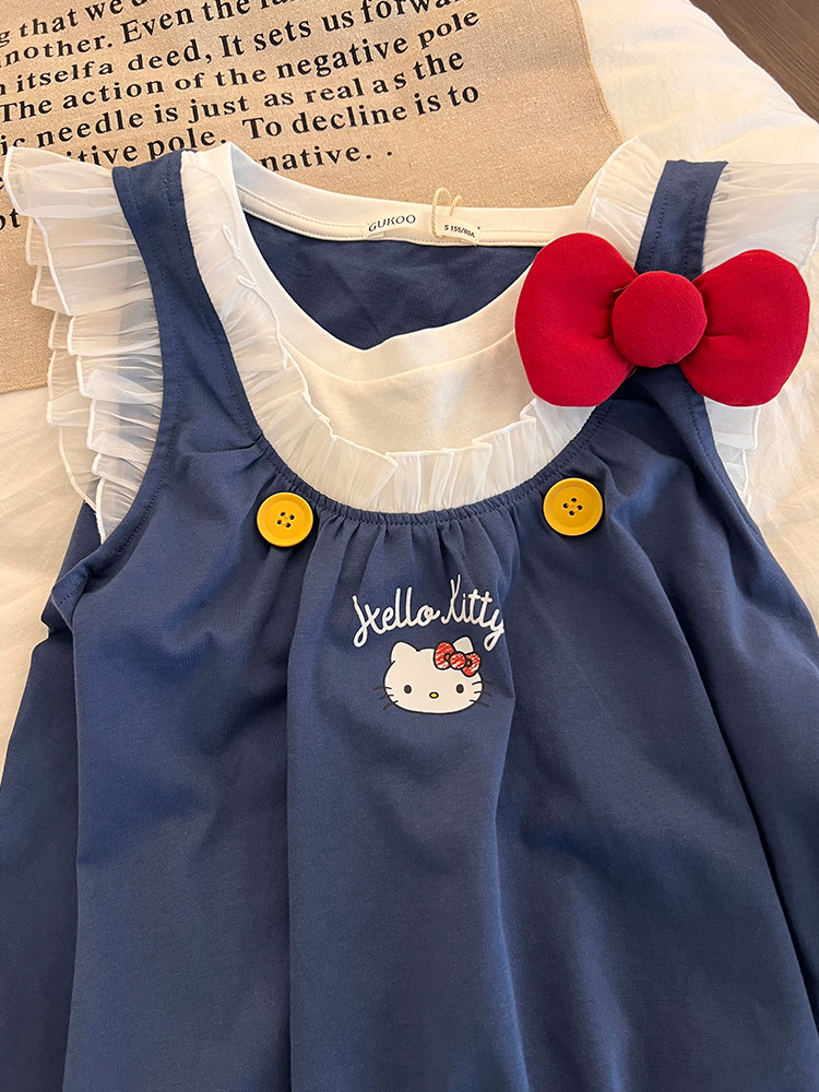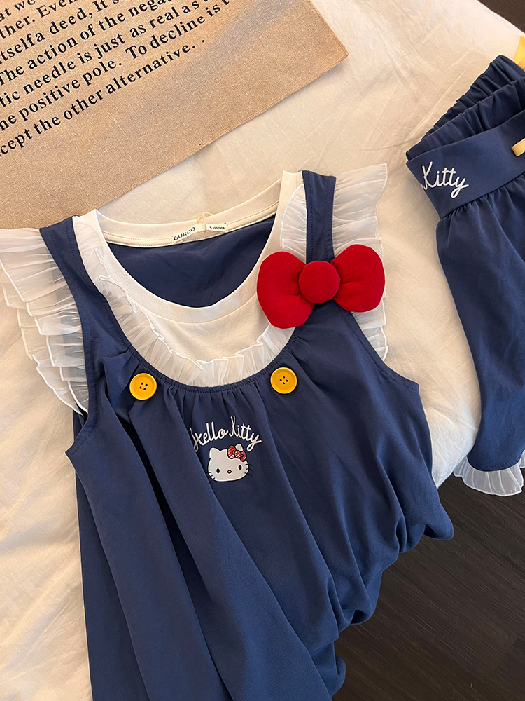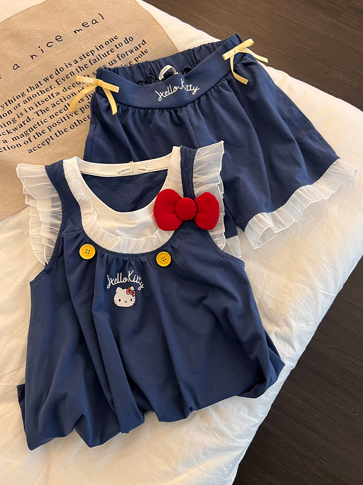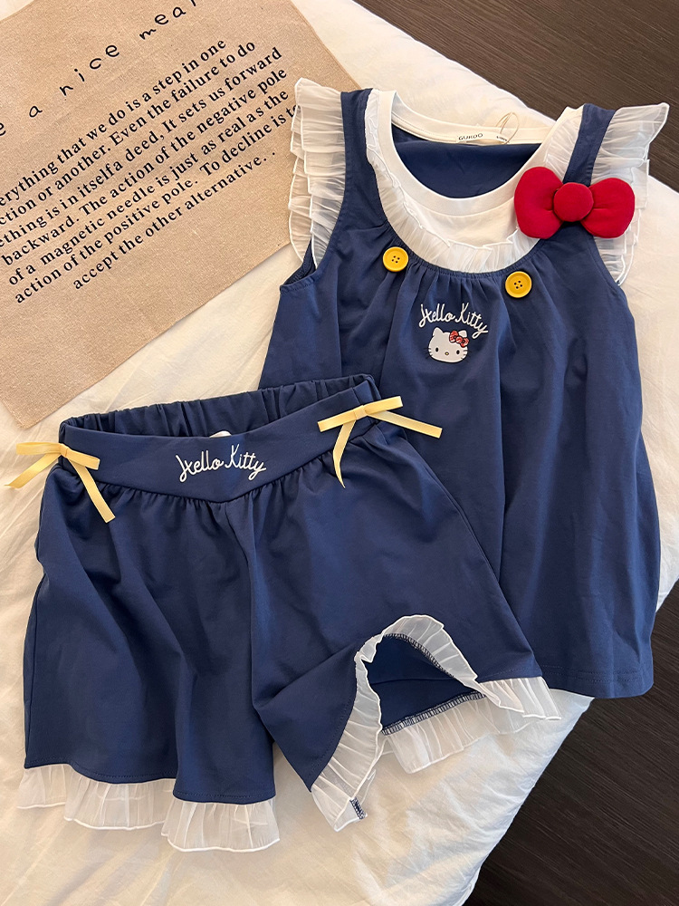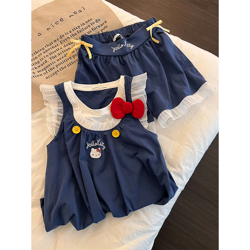 달콤하고 귀여운 헬로 키티 프린트 플라잉 슬리브 잠옷 여성 여름 새 레이스 반바지 홈웨어 세트스토어 가기