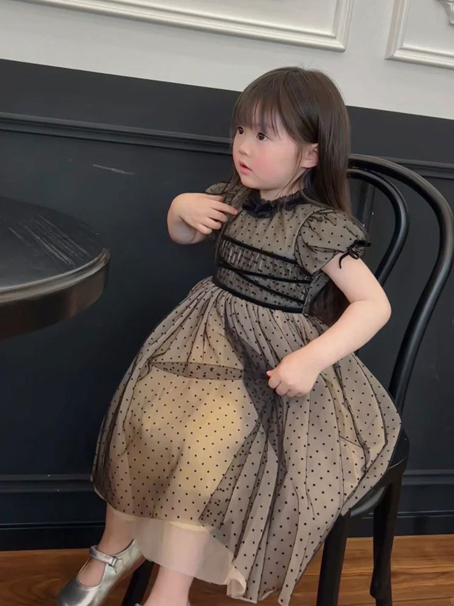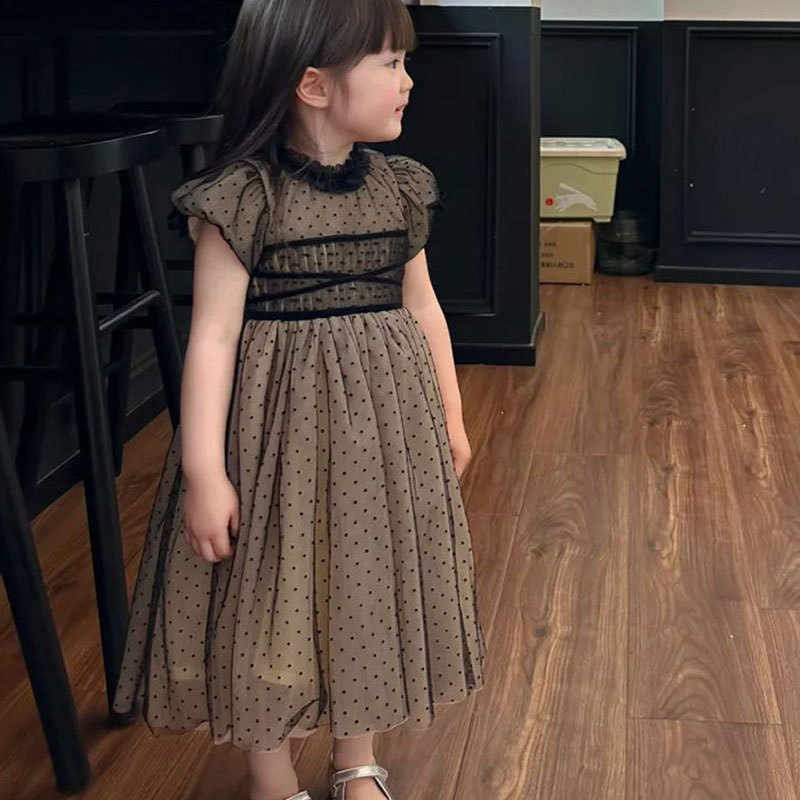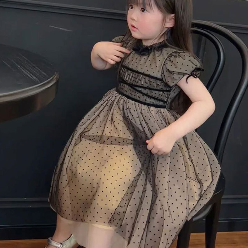 여자 드레스 여름 드레스 2025 새로운 어린이 스커트 여자 검은 도트 공주 드레스 유행 메쉬 스커트 유행스토어 가기