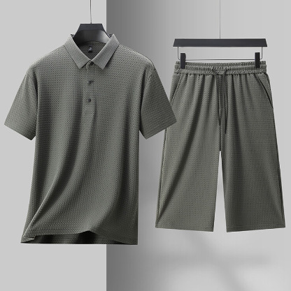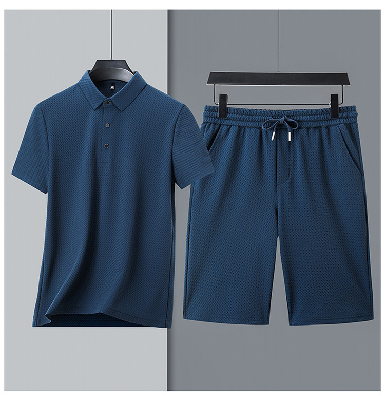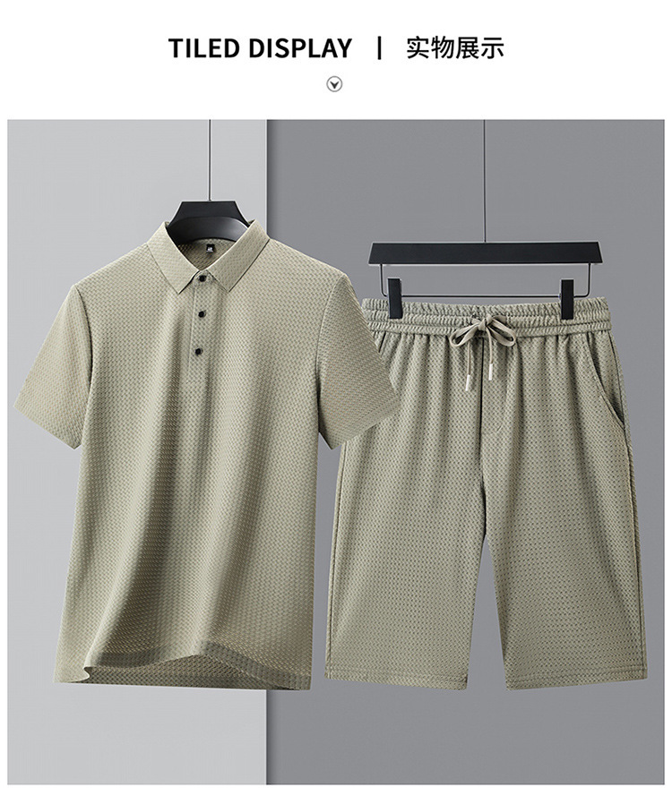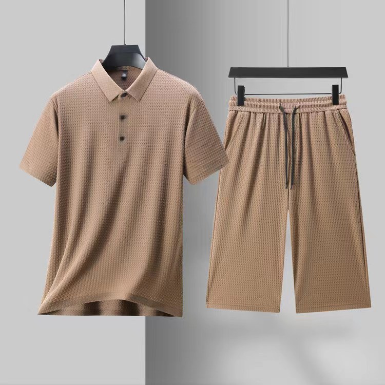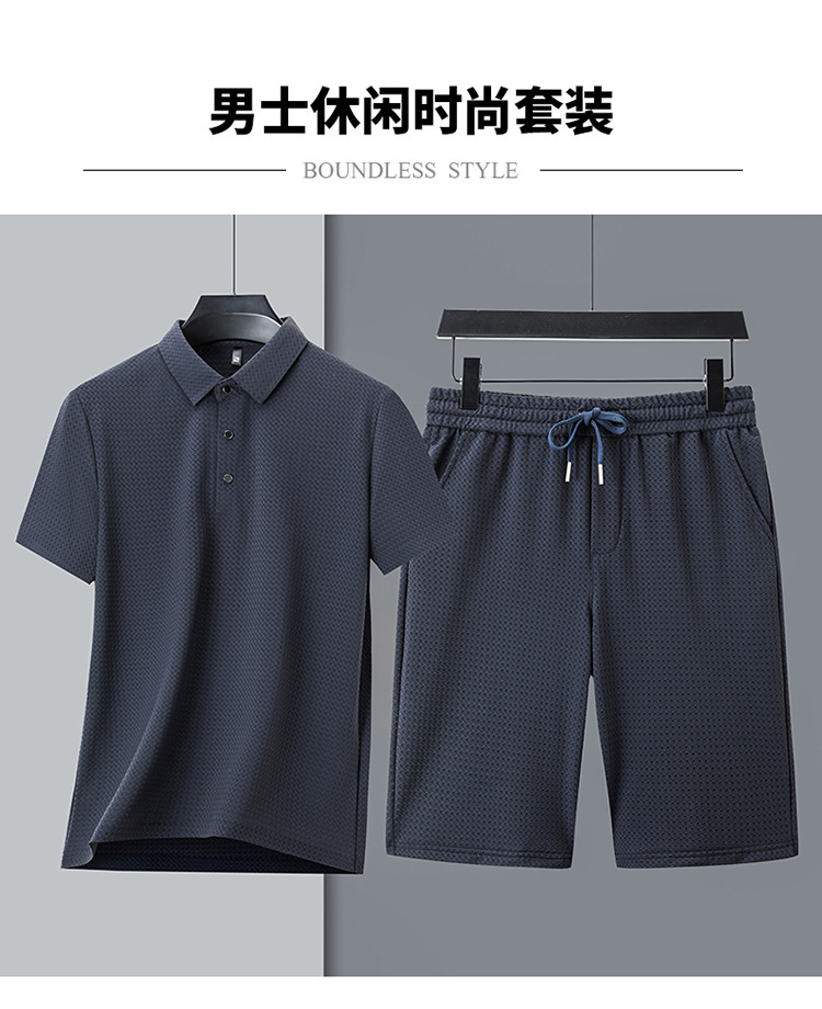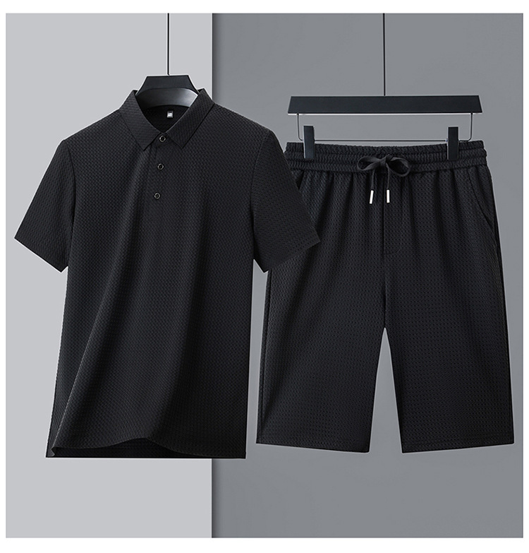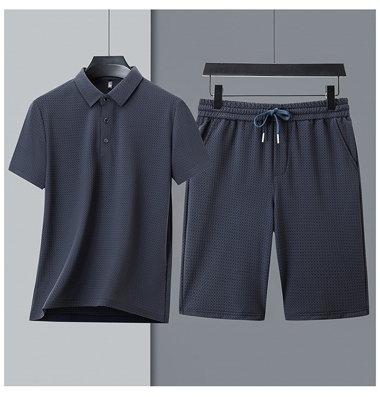 여름 남성 캐주얼 스포츠 정장 솔리드 컬러 젊은 및 중년 얼음 실크 통기성 반팔 티셔츠 반바지 투피스 세트