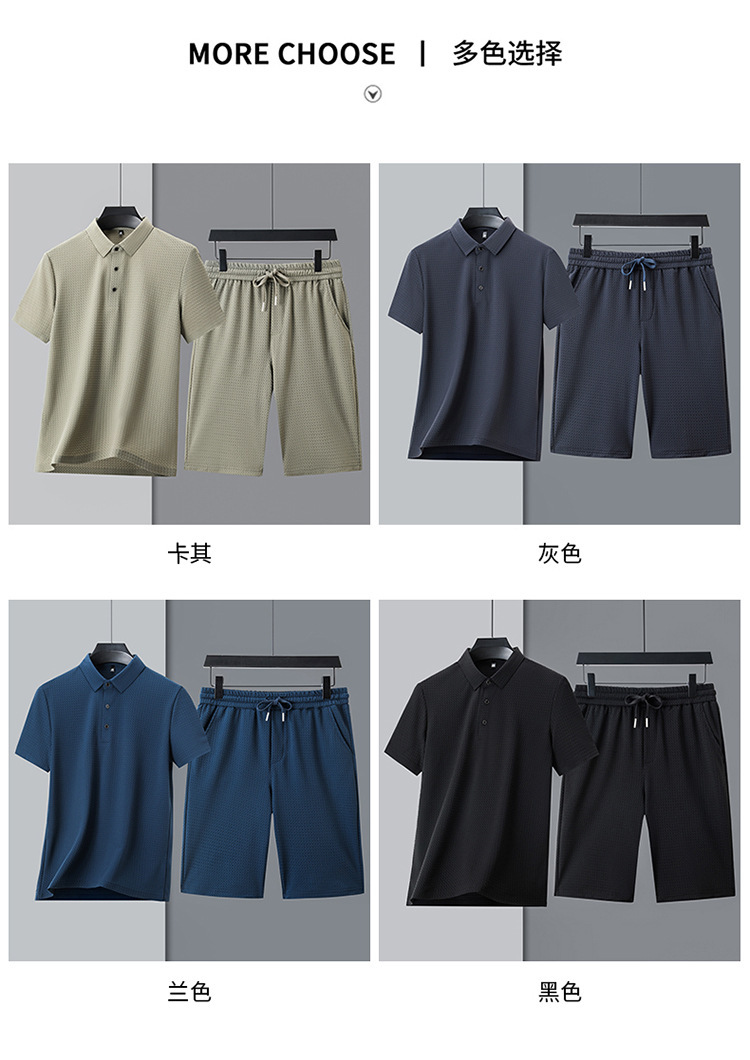 여름 남성 캐주얼 스포츠 정장 솔리드 컬러 젊은 및 중년 얼음 실크 통기성 반팔 티셔츠 반바지 투피스 세트스토어 가기