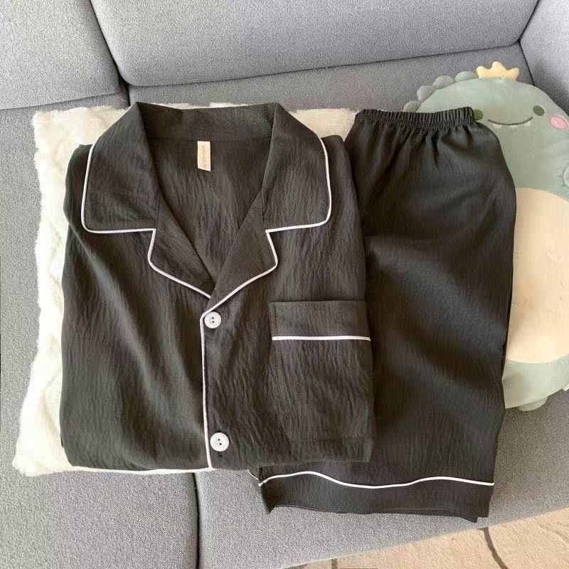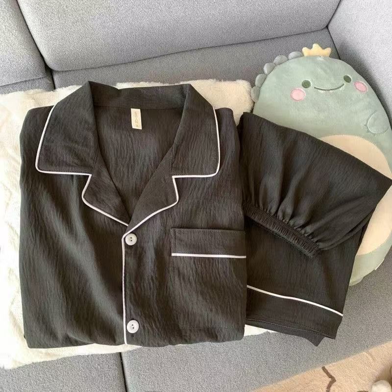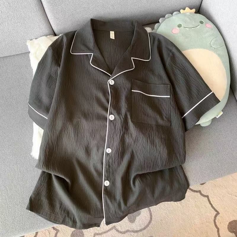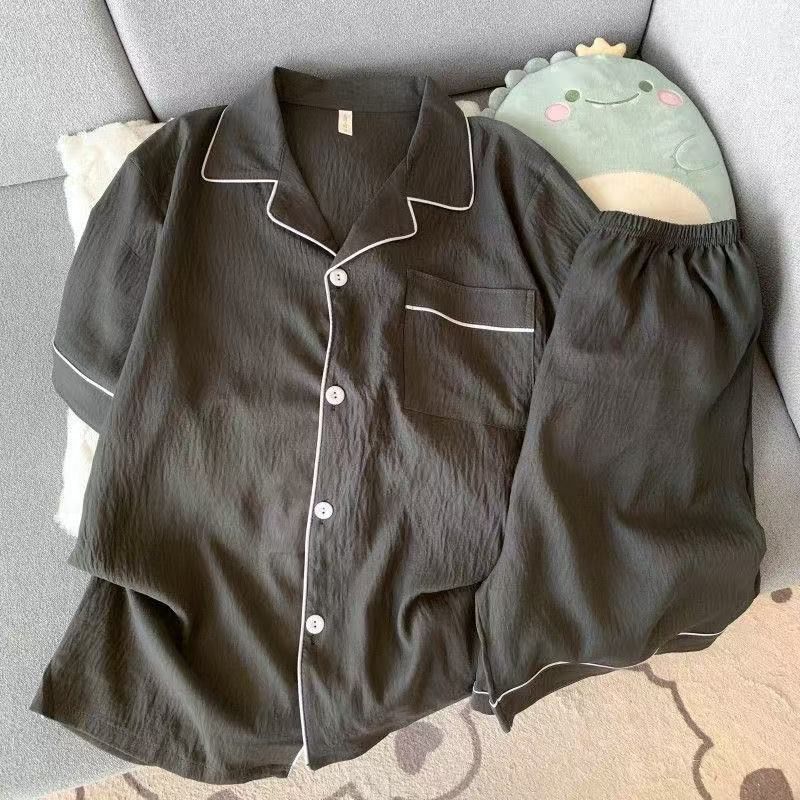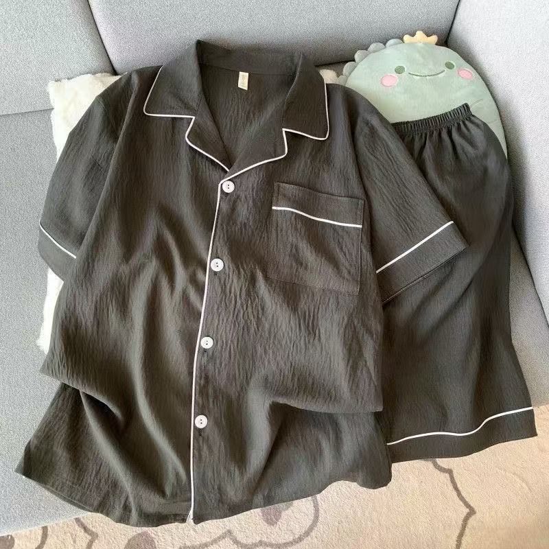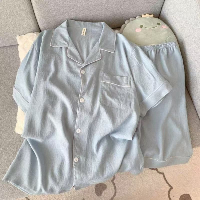 여름 남성용 클라우드 코튼 더블 쇼트 투피스 파자마, 심플한 솔리드 컬러 라펠 가디건, 홈웨어, 얇은 스타일로 야외에서 착용 가능스토어 가기