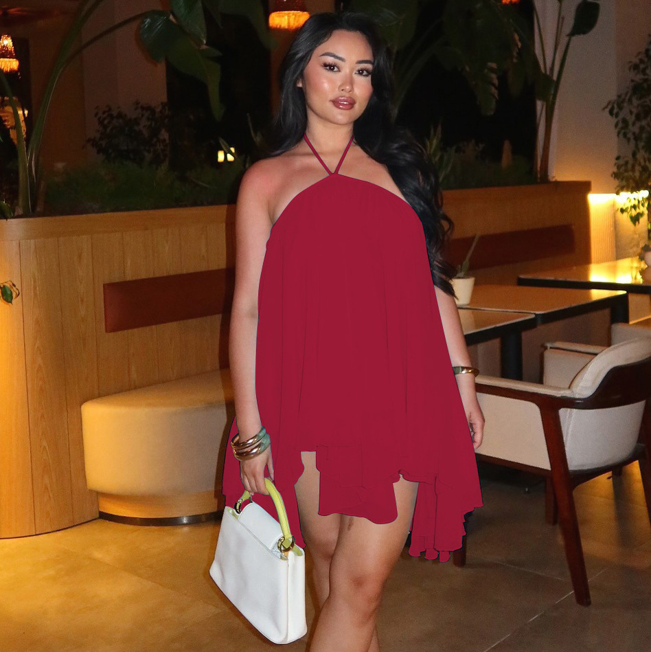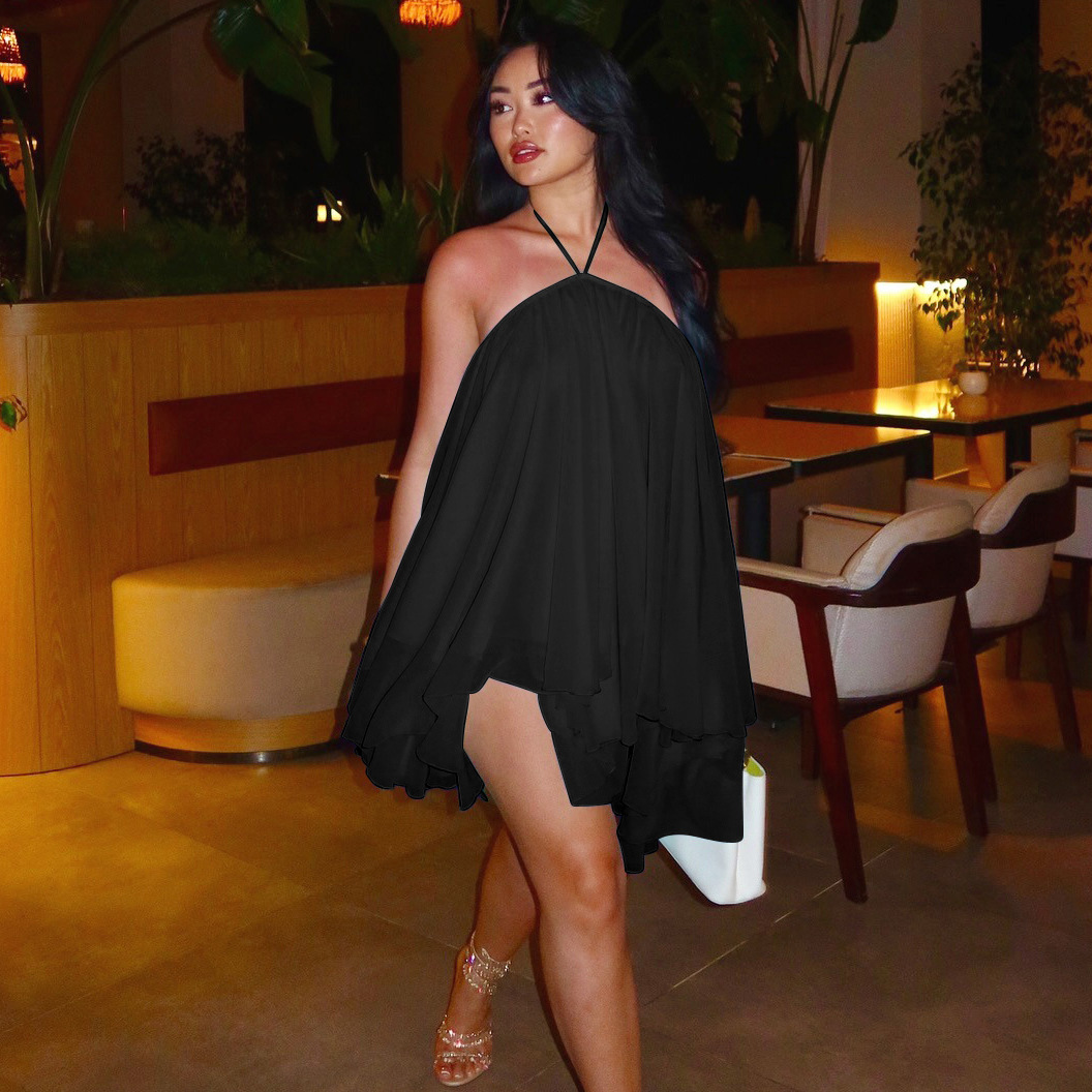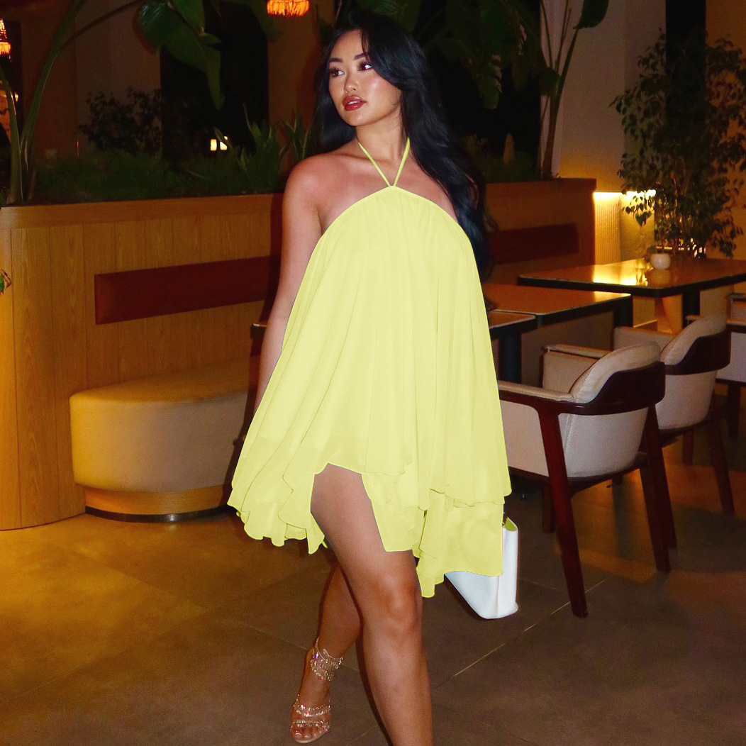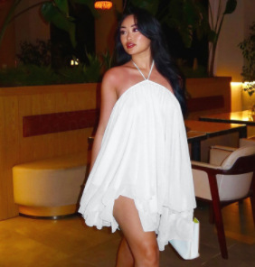 跨境新款挂脖春夏连衣裙欧美女装性感开叉系带露背褶皱包臀长裙女