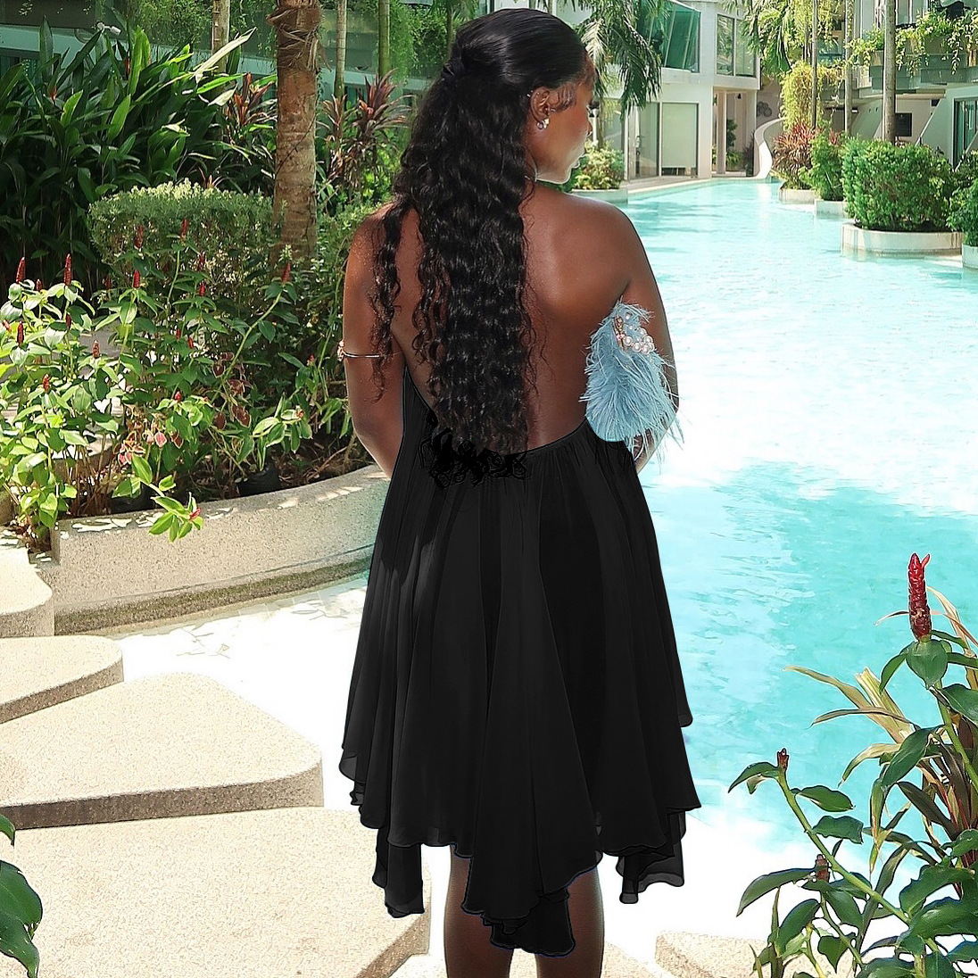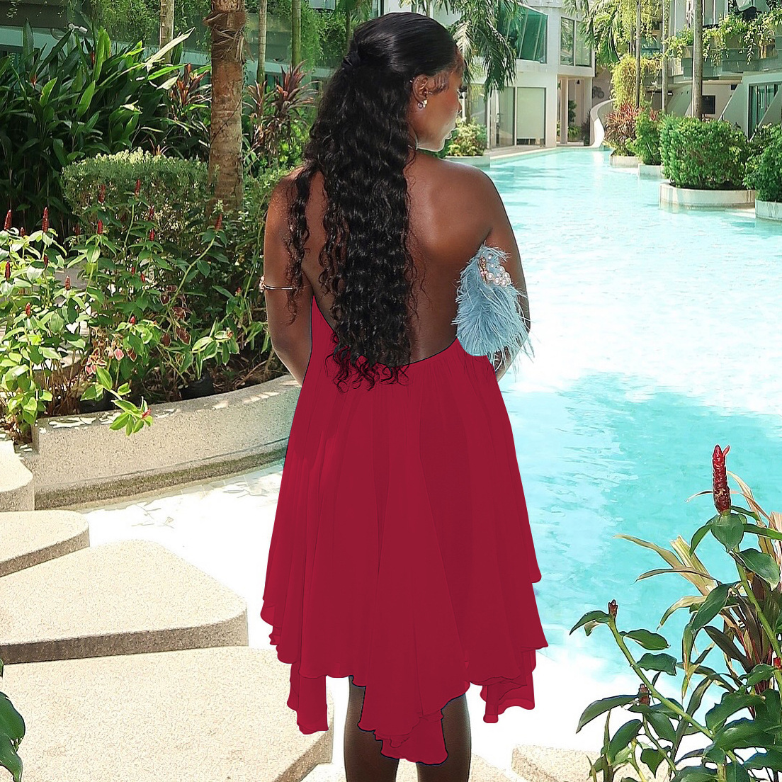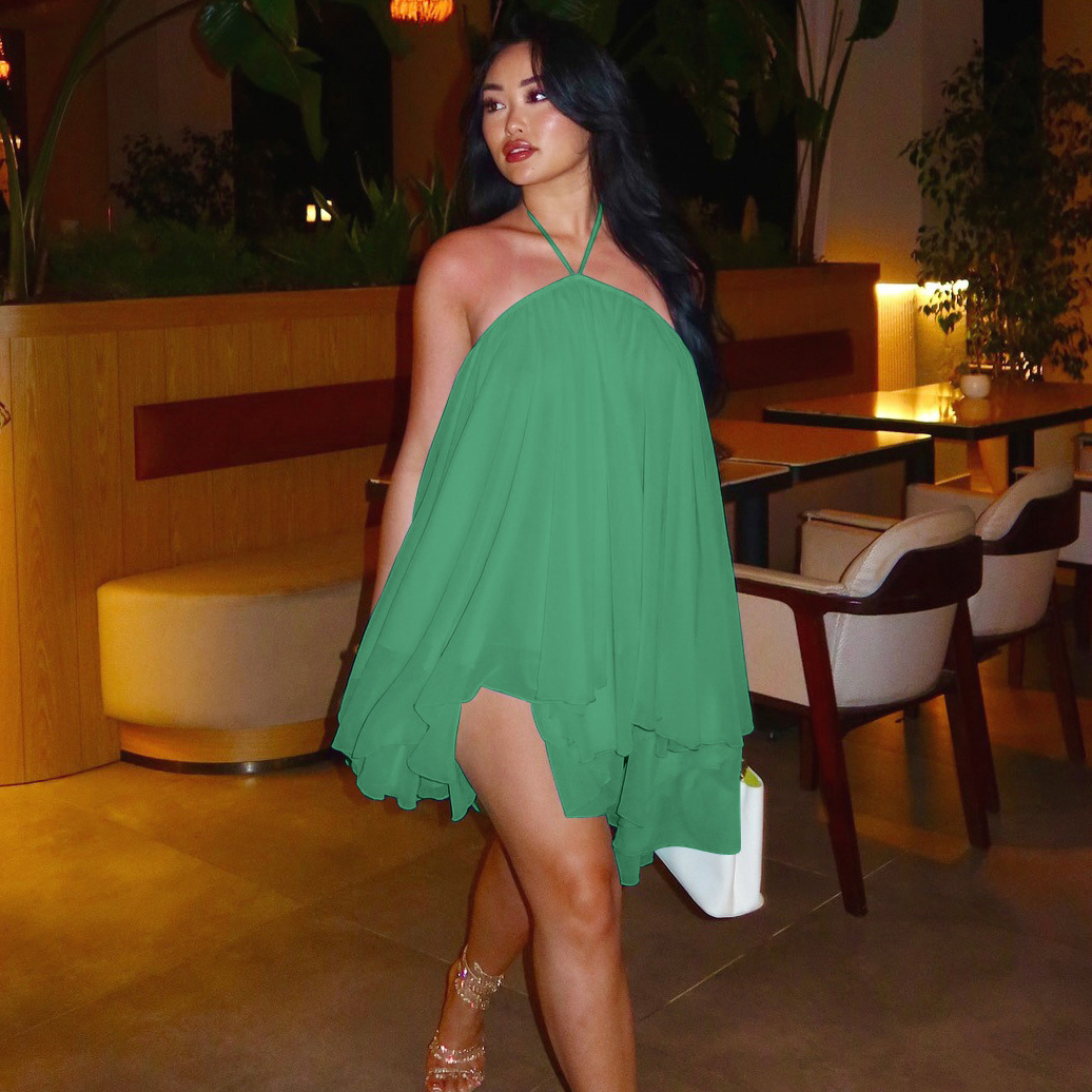 跨境新款挂脖春夏连衣裙欧美女装性感开叉系带露背褶皱包臀长裙女