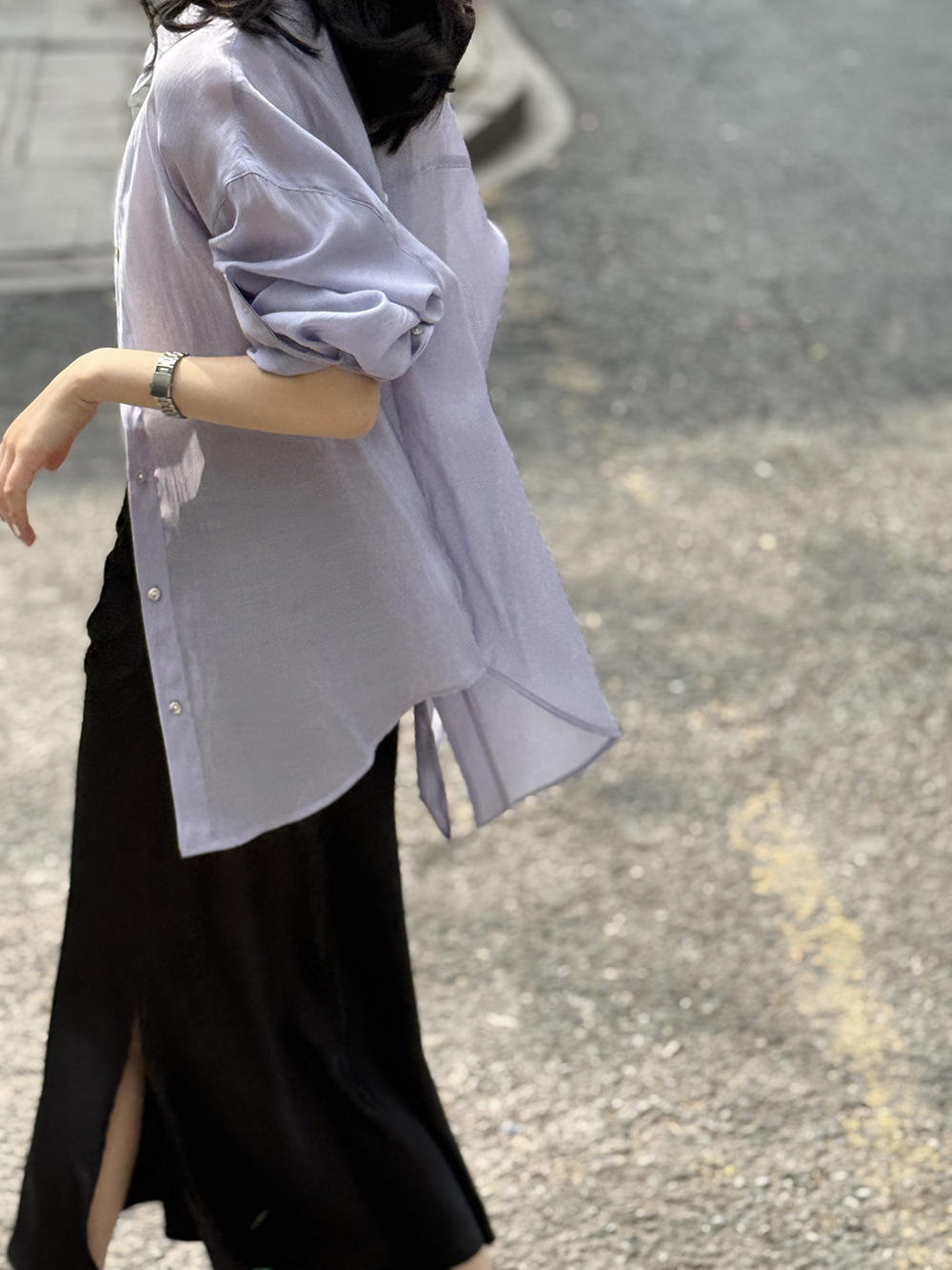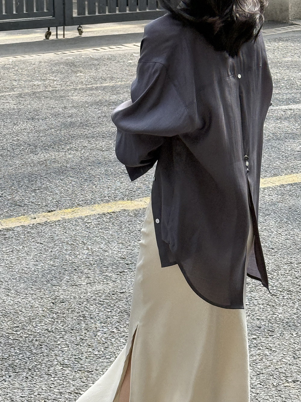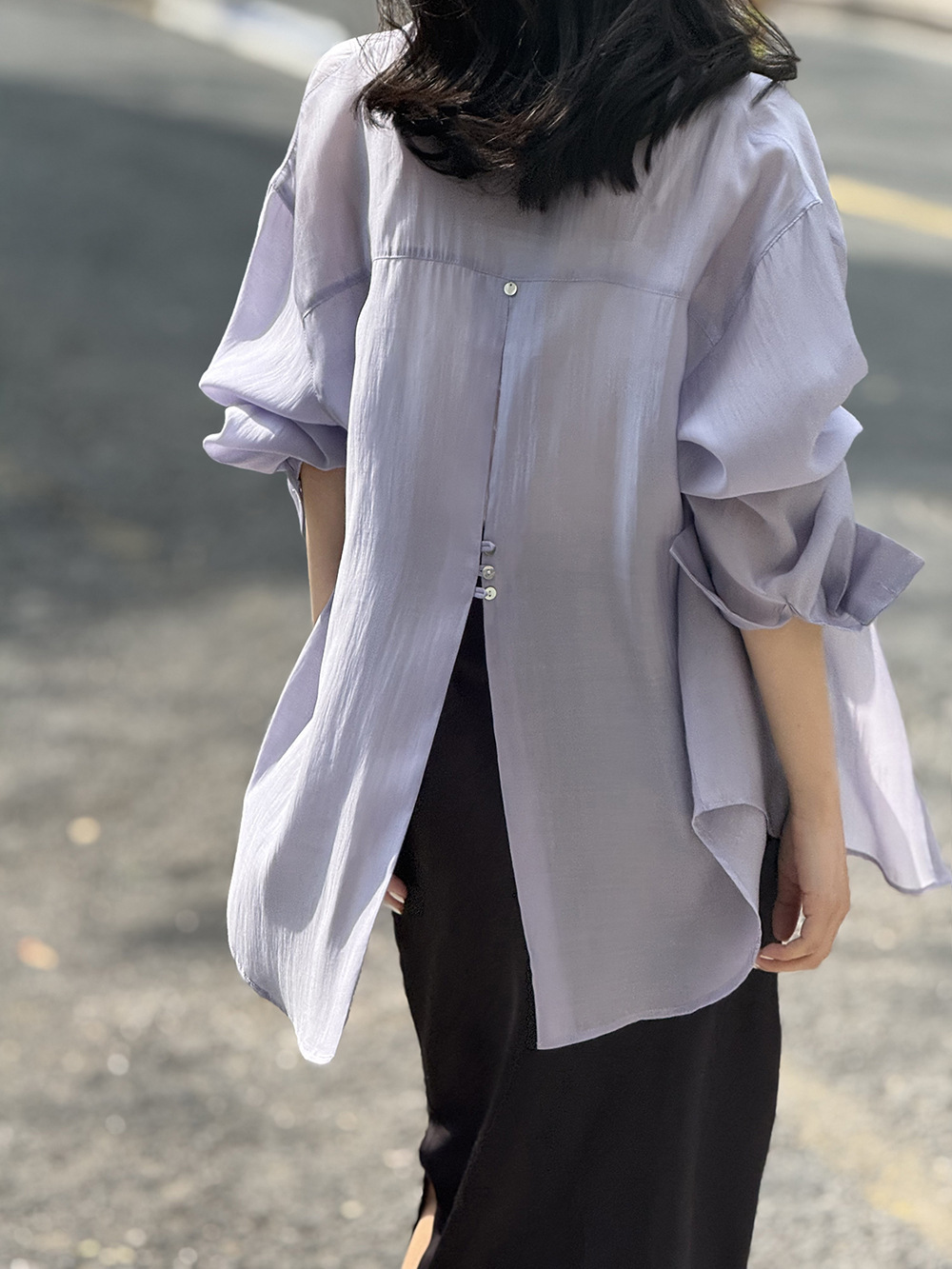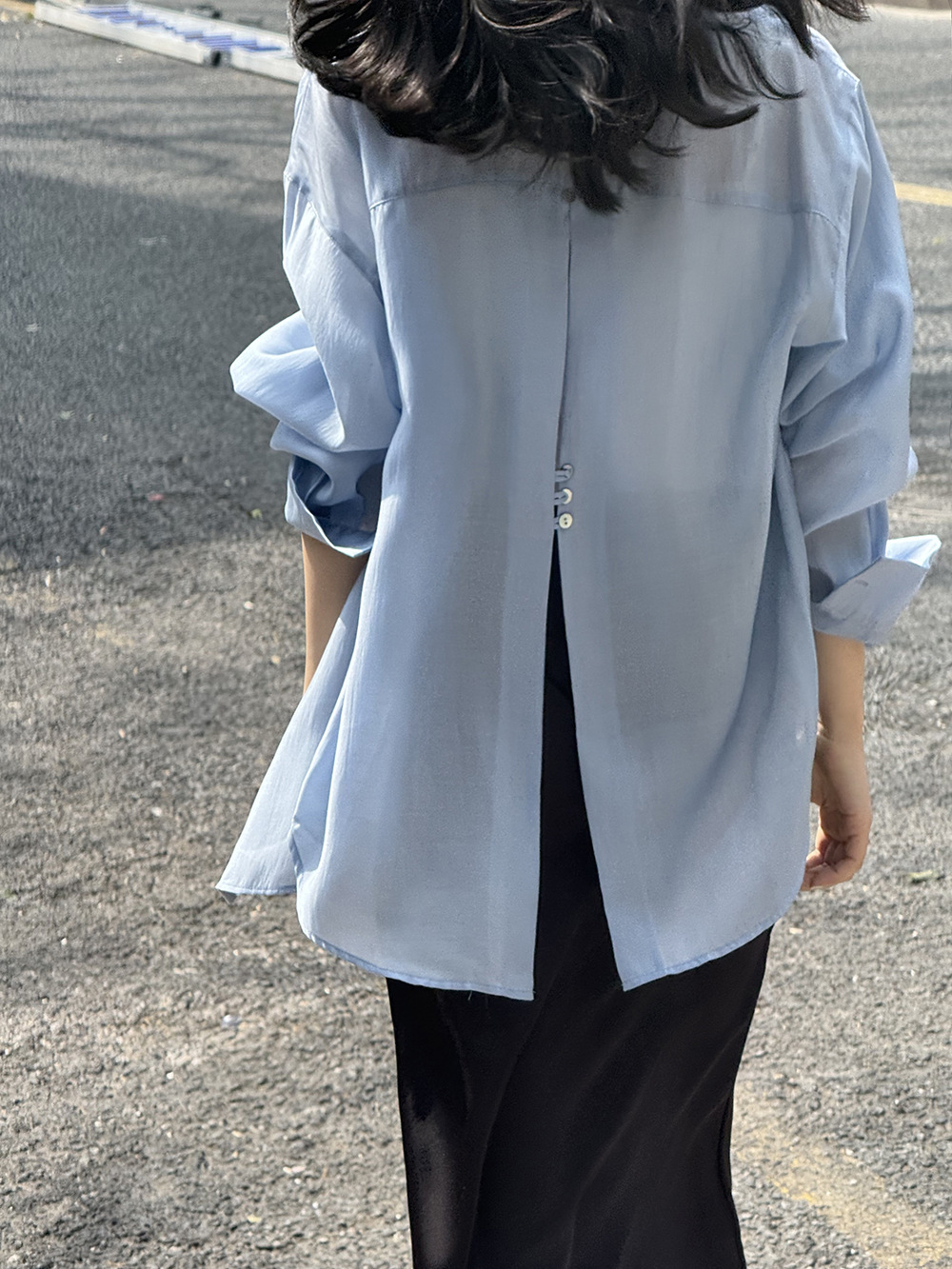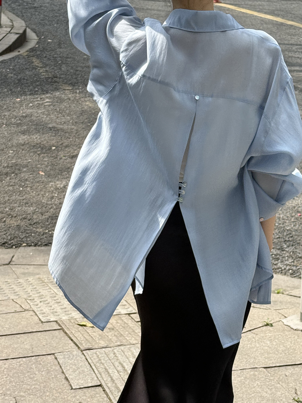 여성용 백 슬릿 텐셀 셔츠 여름 얇은 디자인 틈새 아우터 블라우스 탑 루즈한 자외선 차단 재킷