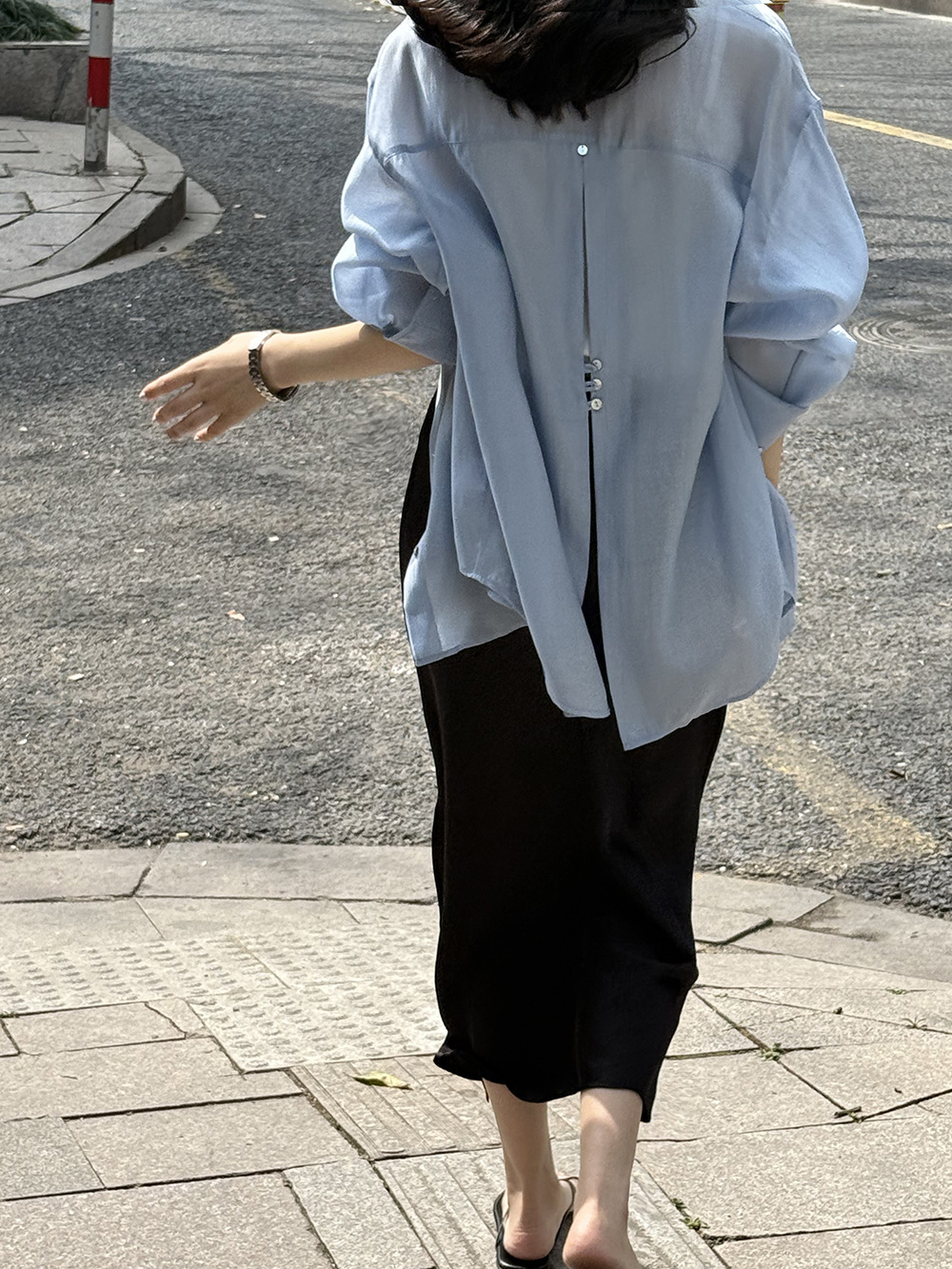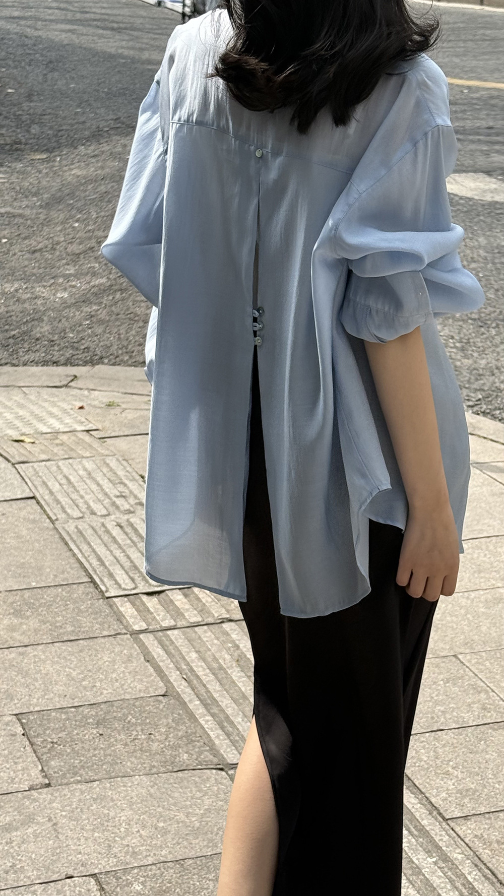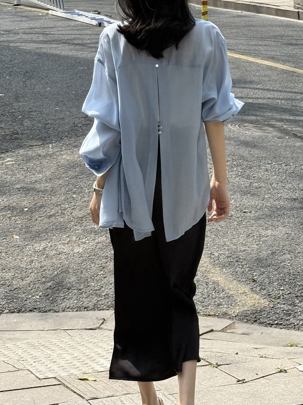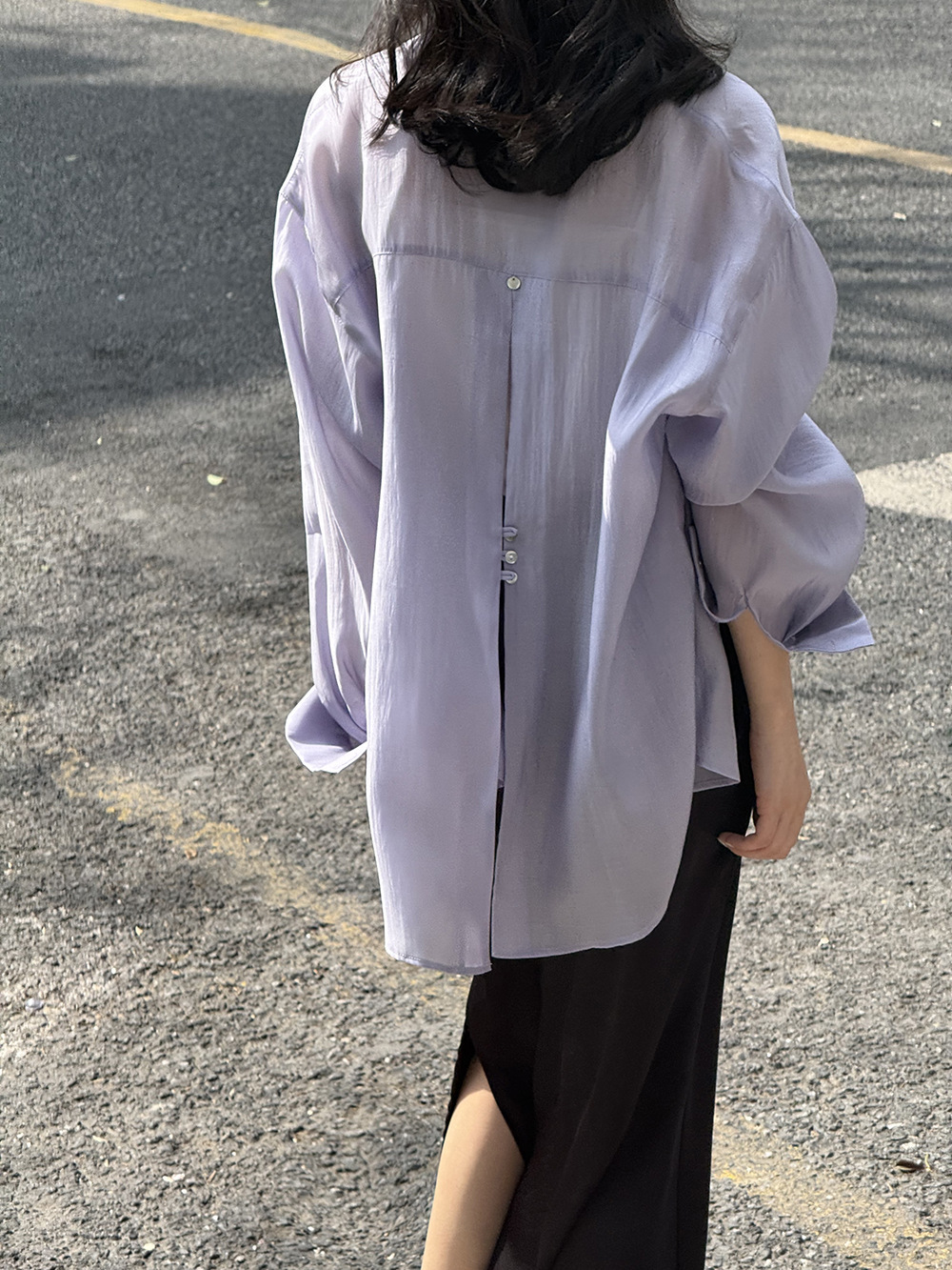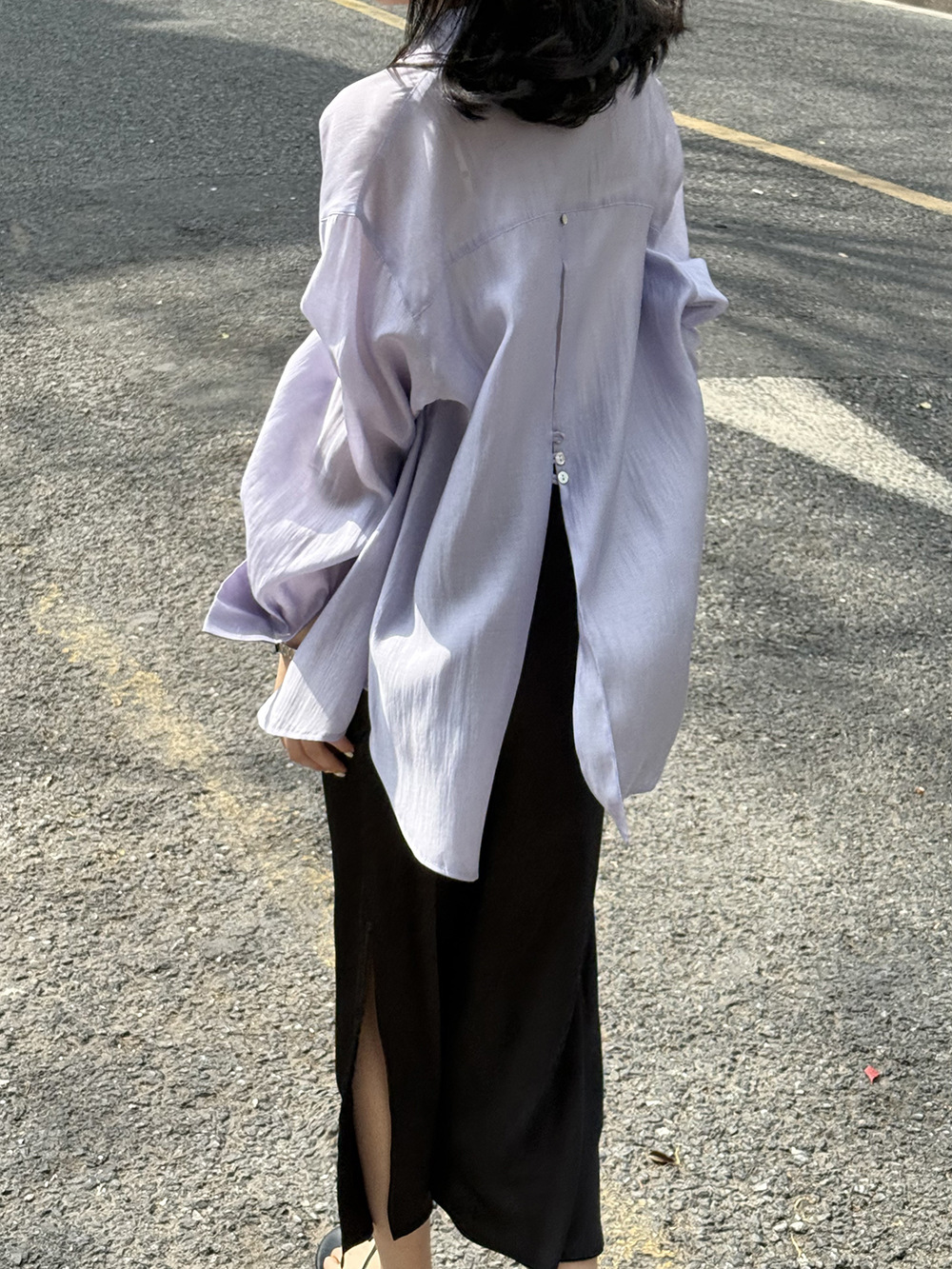 여성용 백 슬릿 텐셀 셔츠 여름 얇은 디자인 틈새 아우터 블라우스 탑 루즈한 자외선 차단 재킷