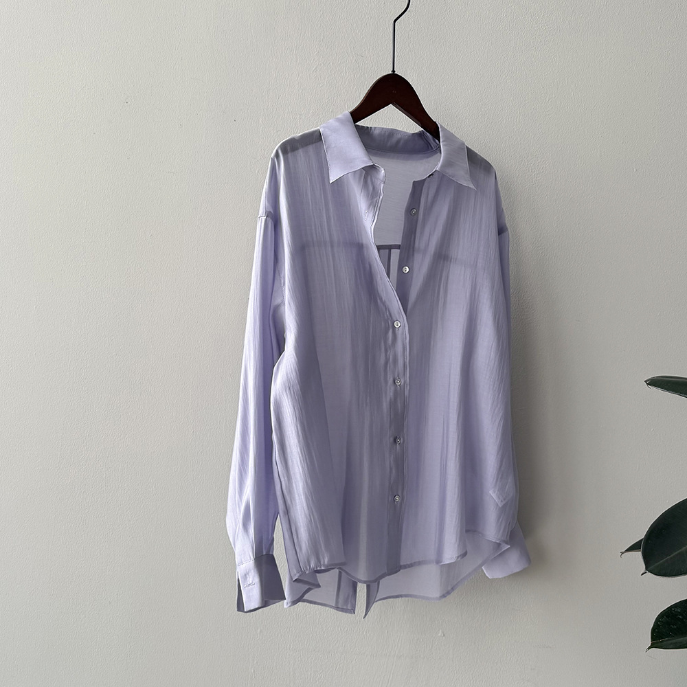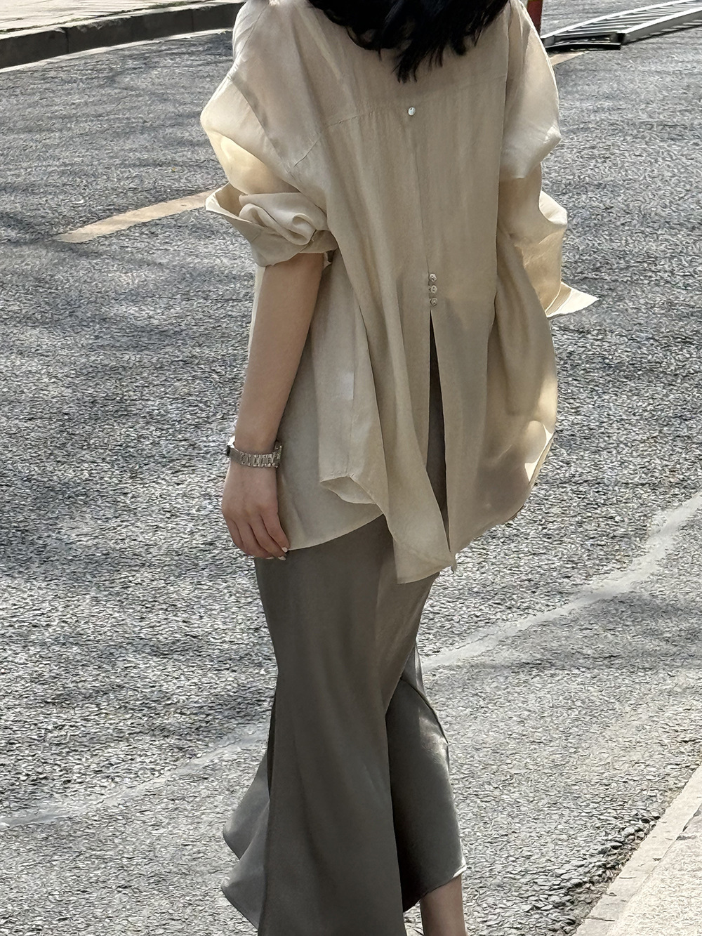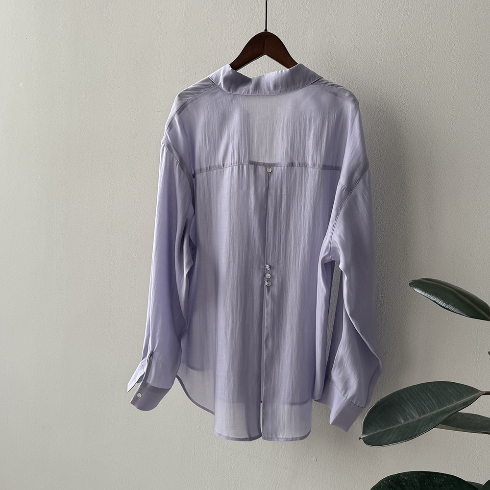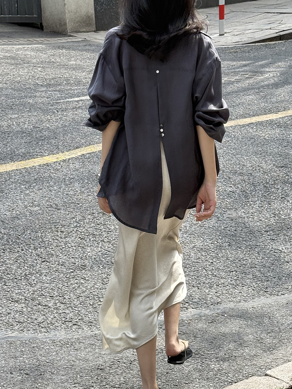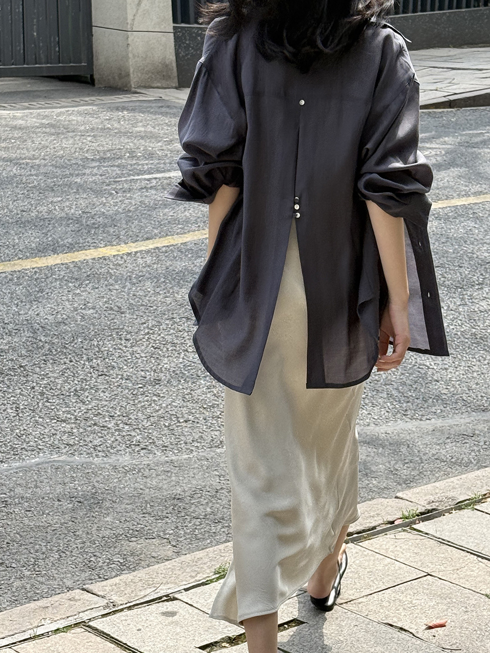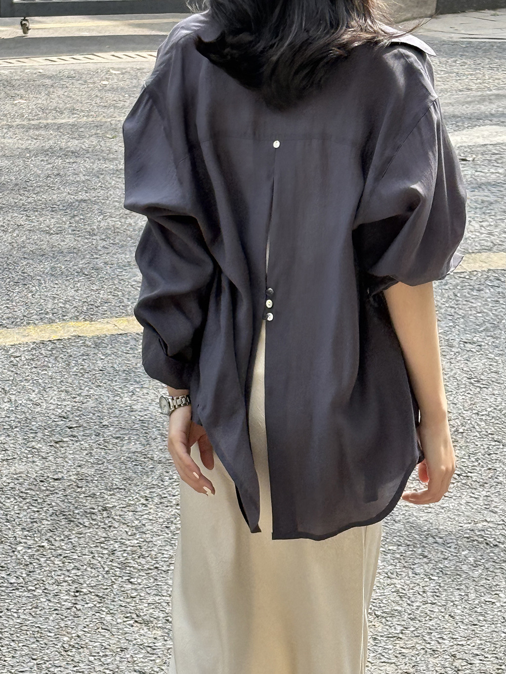여성용 백 슬릿 텐셀 셔츠 여름 얇은 디자인 틈새 아우터 블라우스 탑 루즈한 자외선 차단 재킷