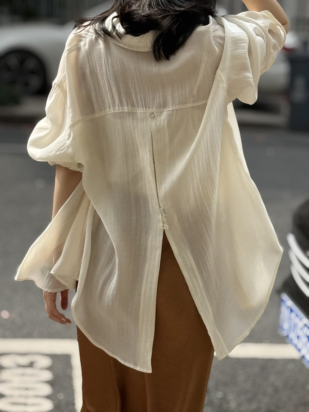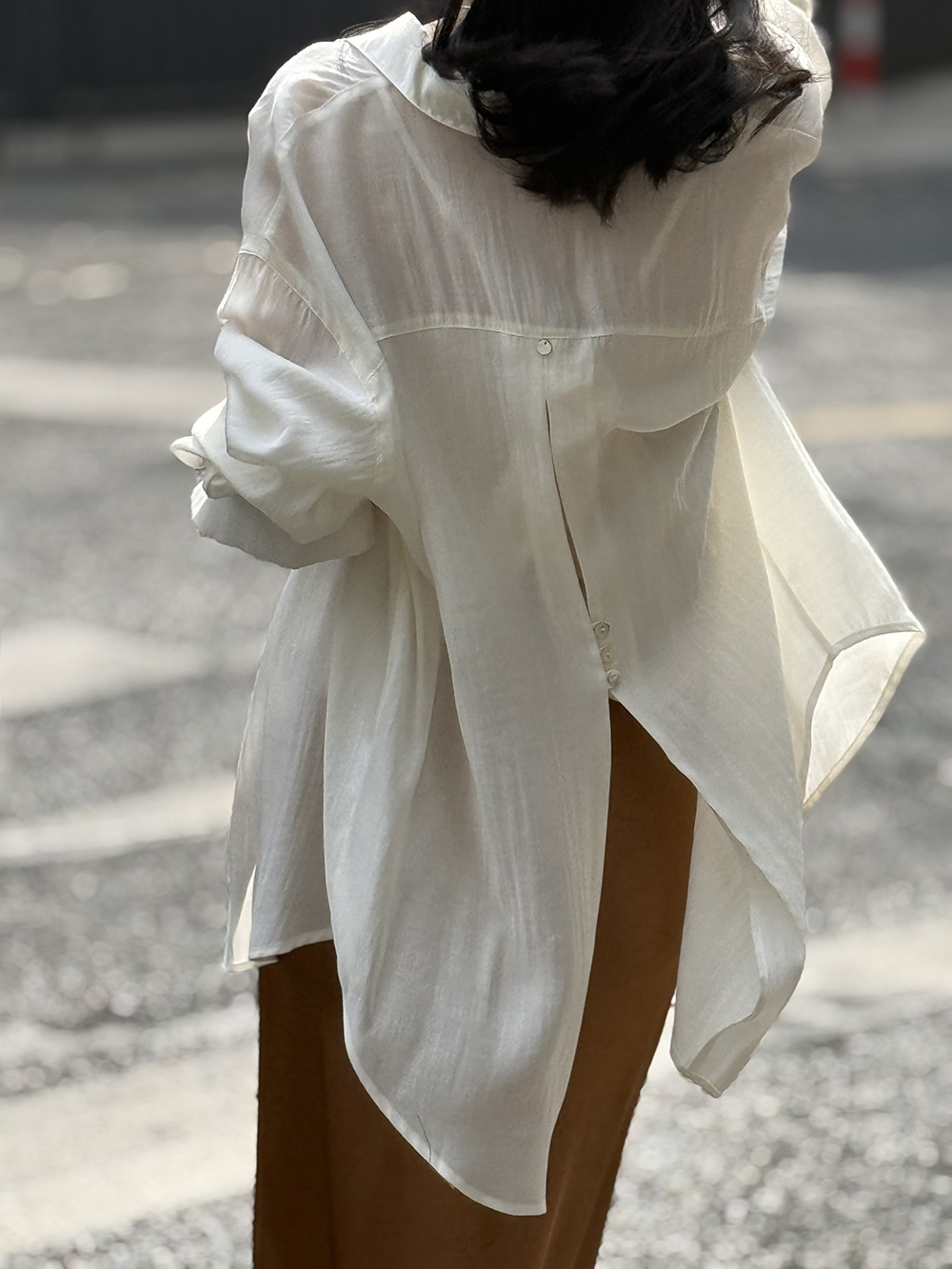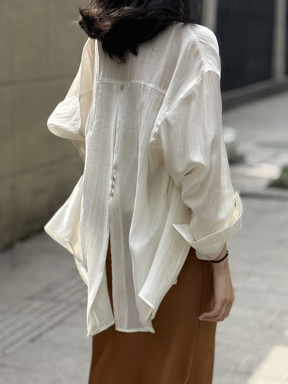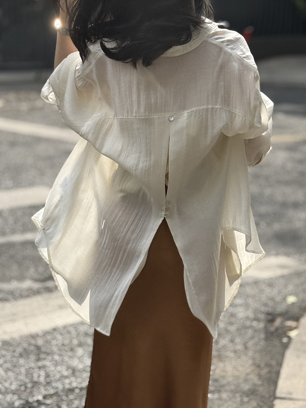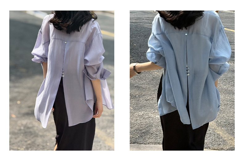 여성용 백 슬릿 텐셀 셔츠 여름 얇은 디자인 틈새 아우터 블라우스 탑 루즈한 자외선 차단 재킷