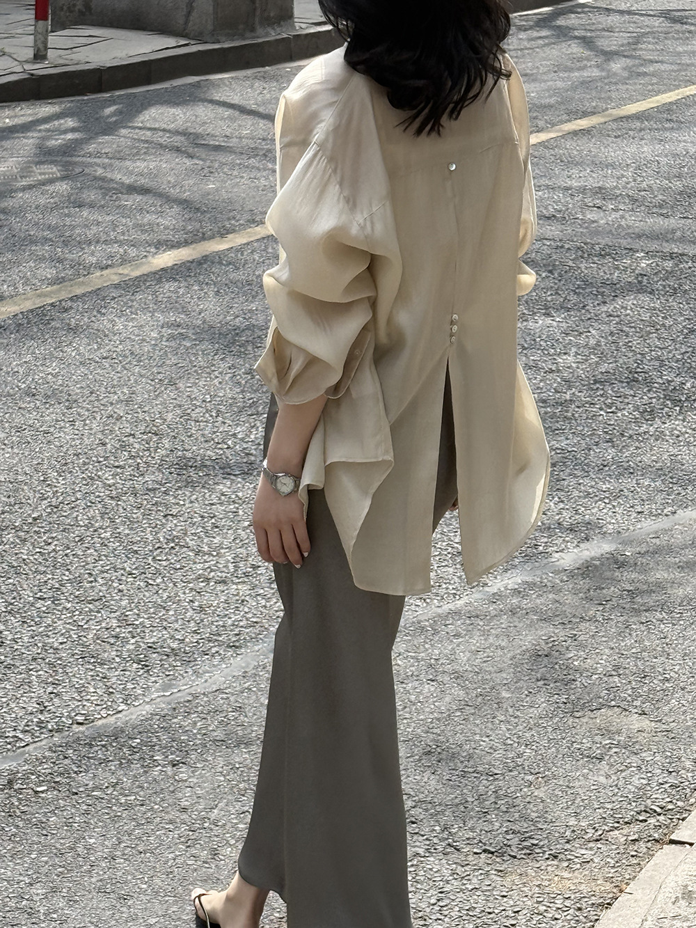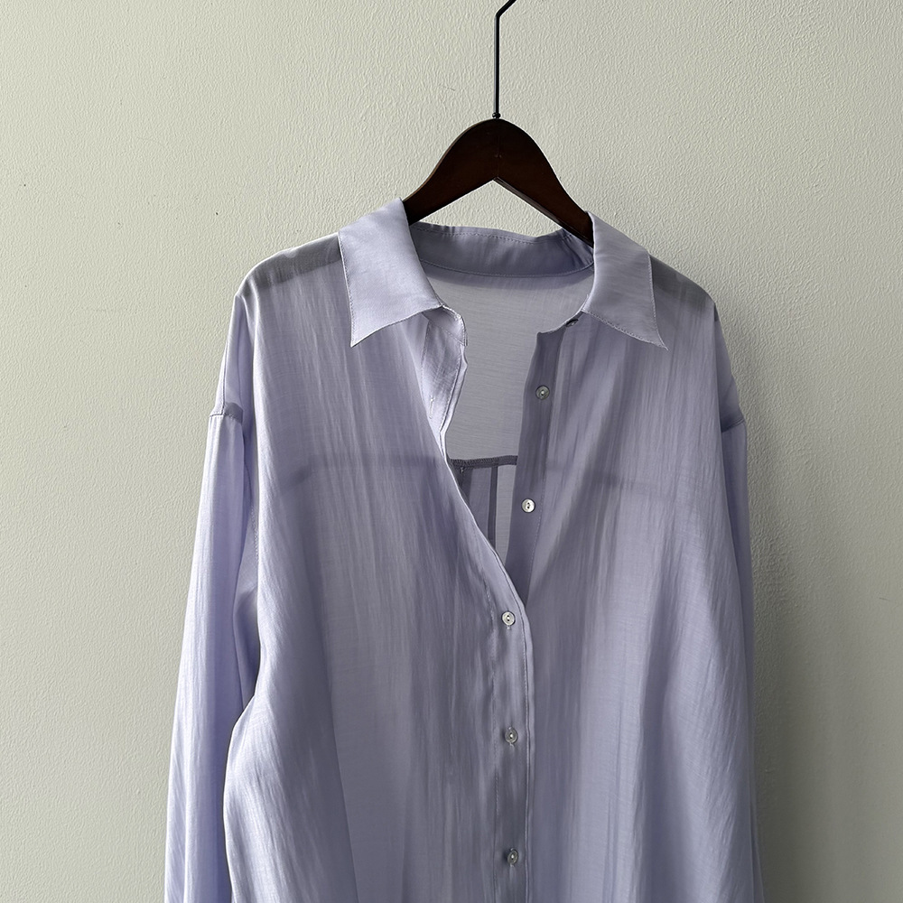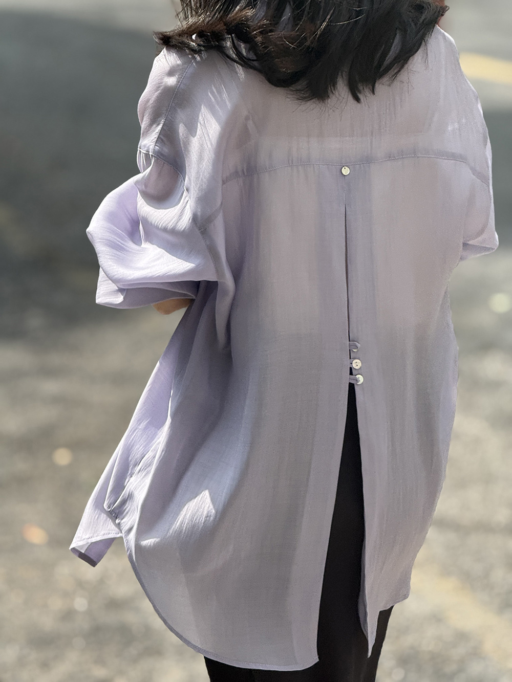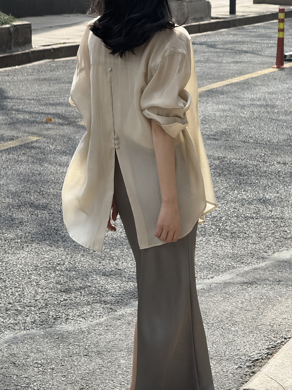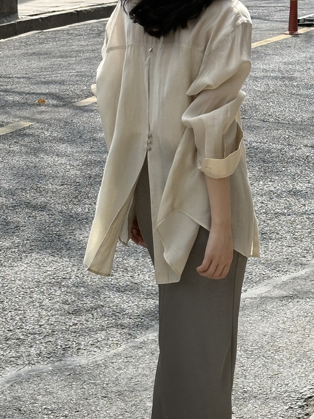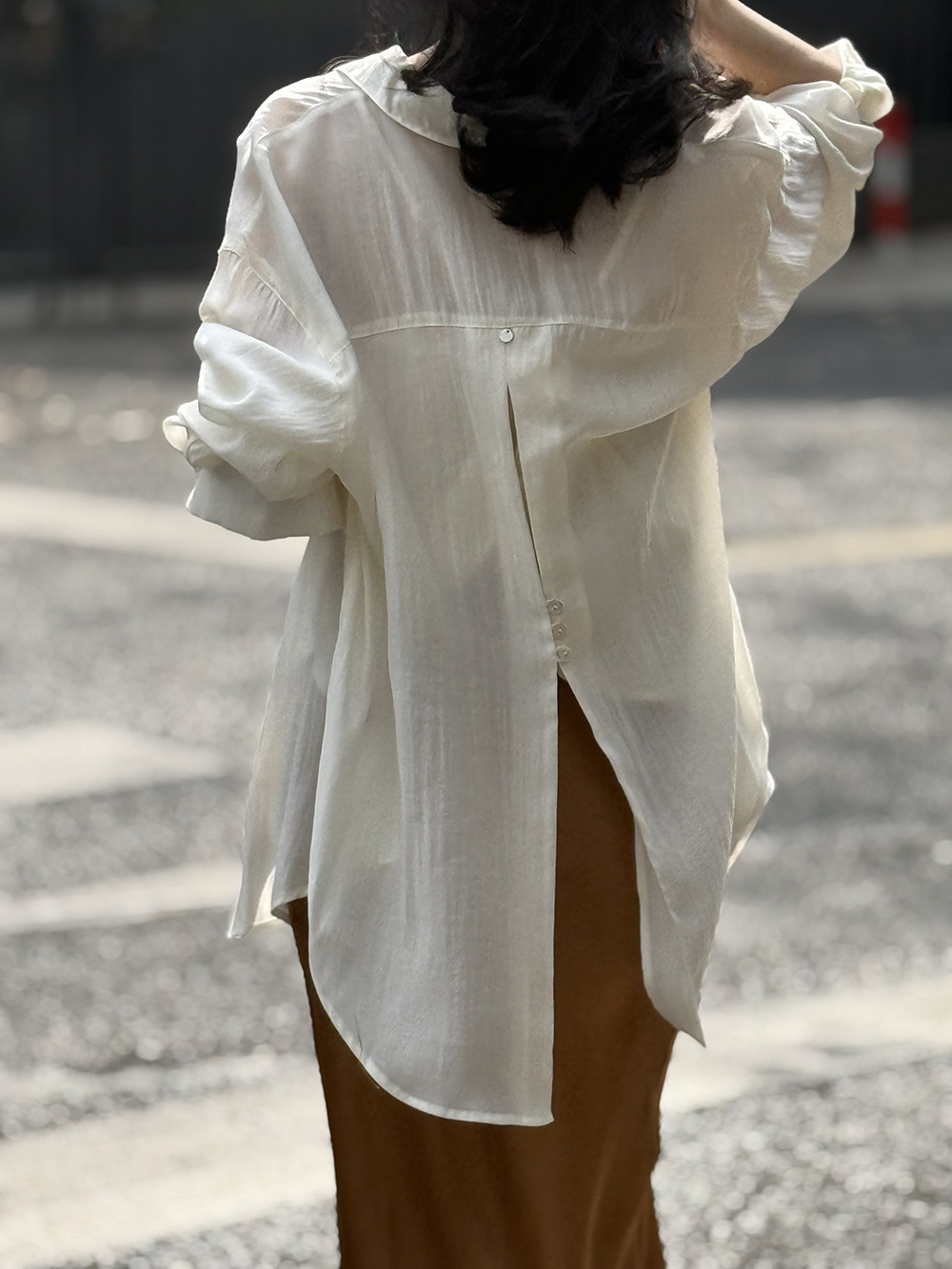 여성용 백 슬릿 텐셀 셔츠 여름 얇은 디자인 틈새 아우터 블라우스 탑 루즈한 자외선 차단 재킷