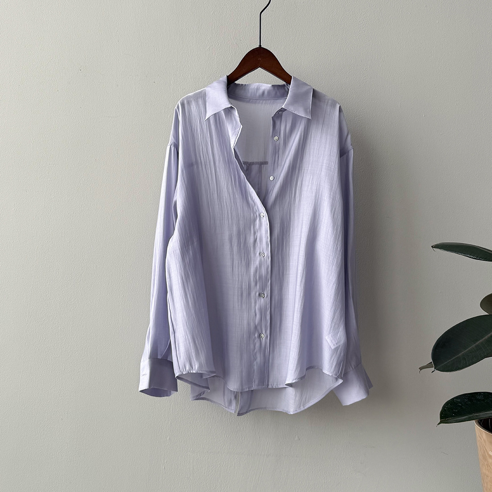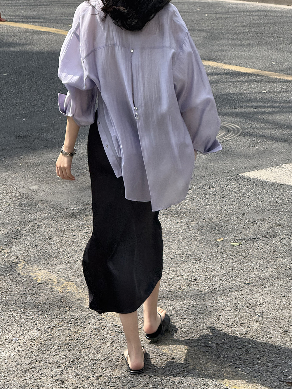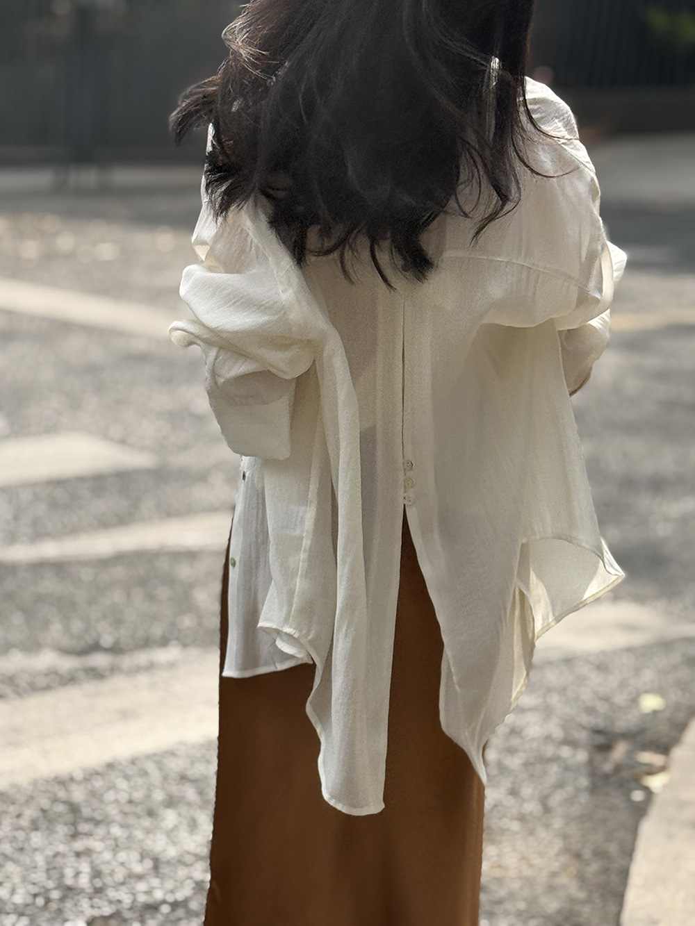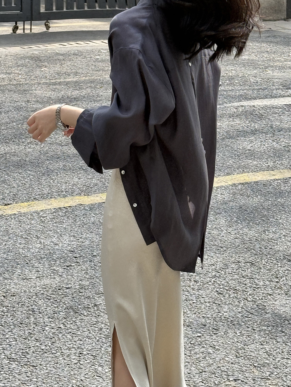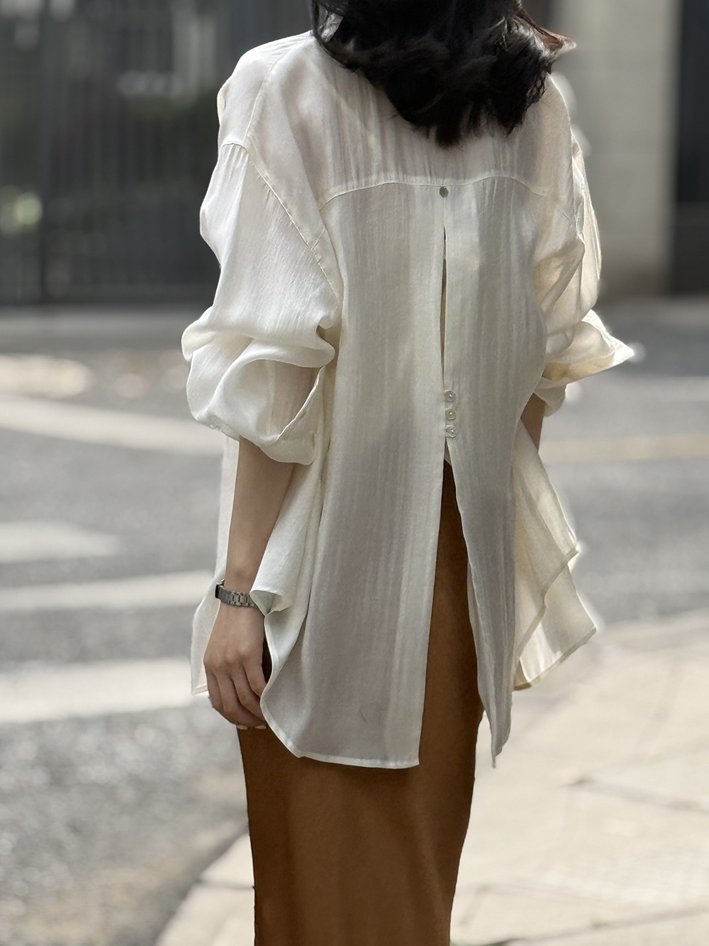 여성용 백 슬릿 텐셀 셔츠 여름 얇은 디자인 틈새 아우터 블라우스 탑 루즈한 자외선 차단 재킷