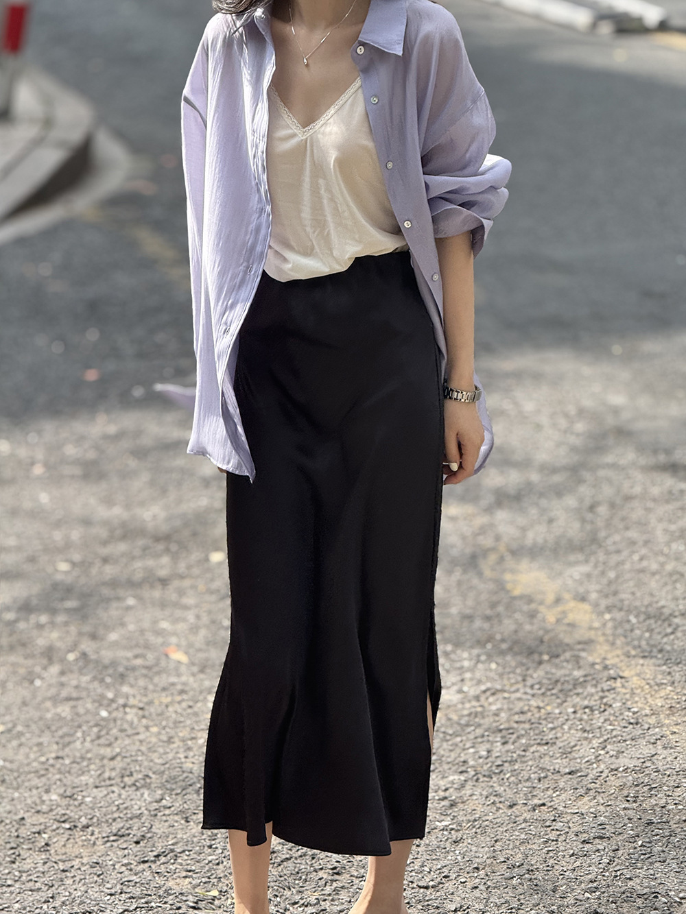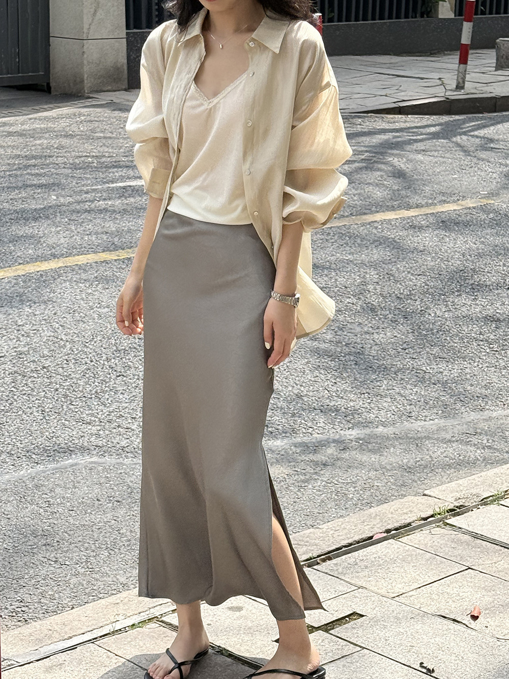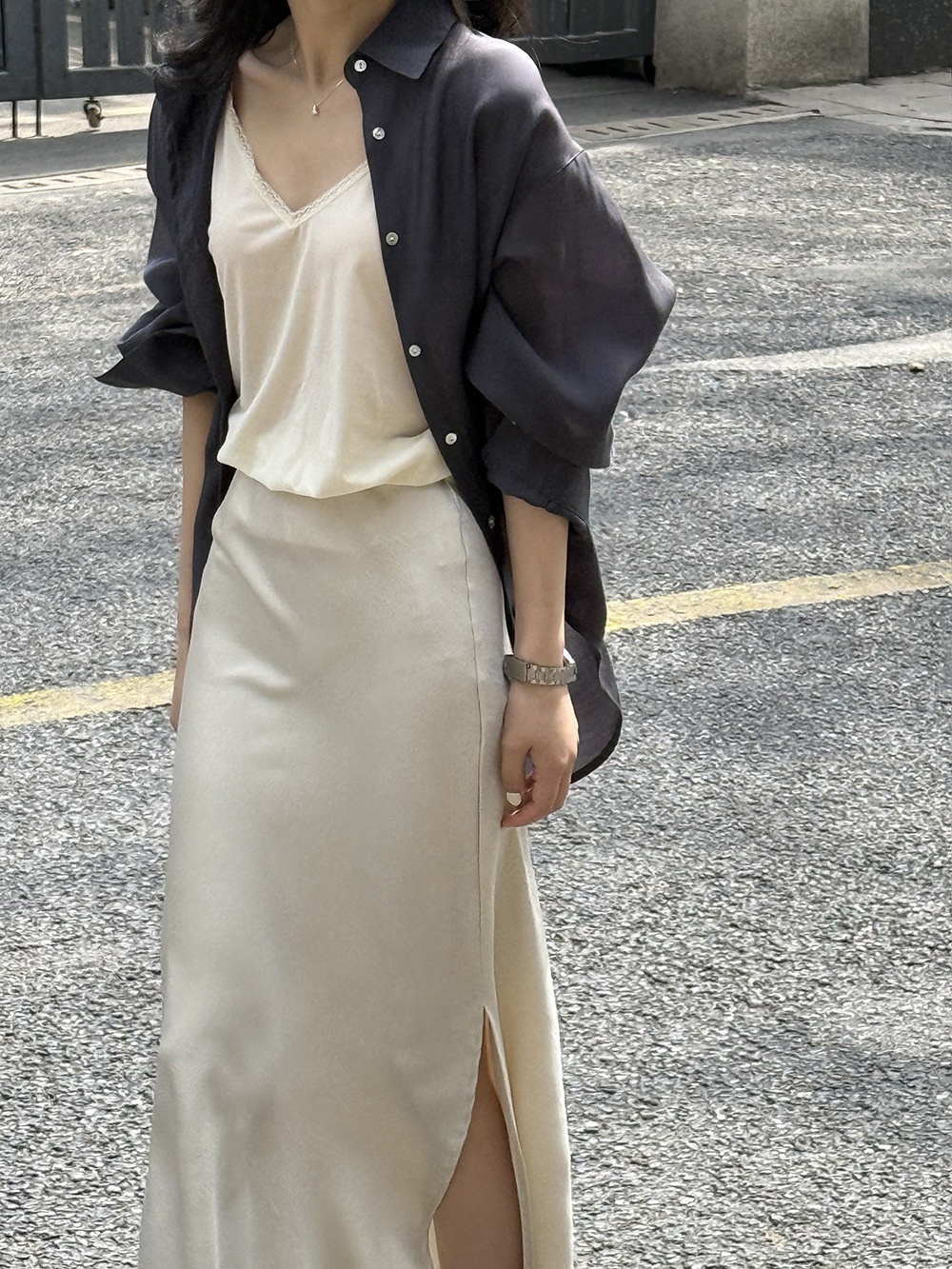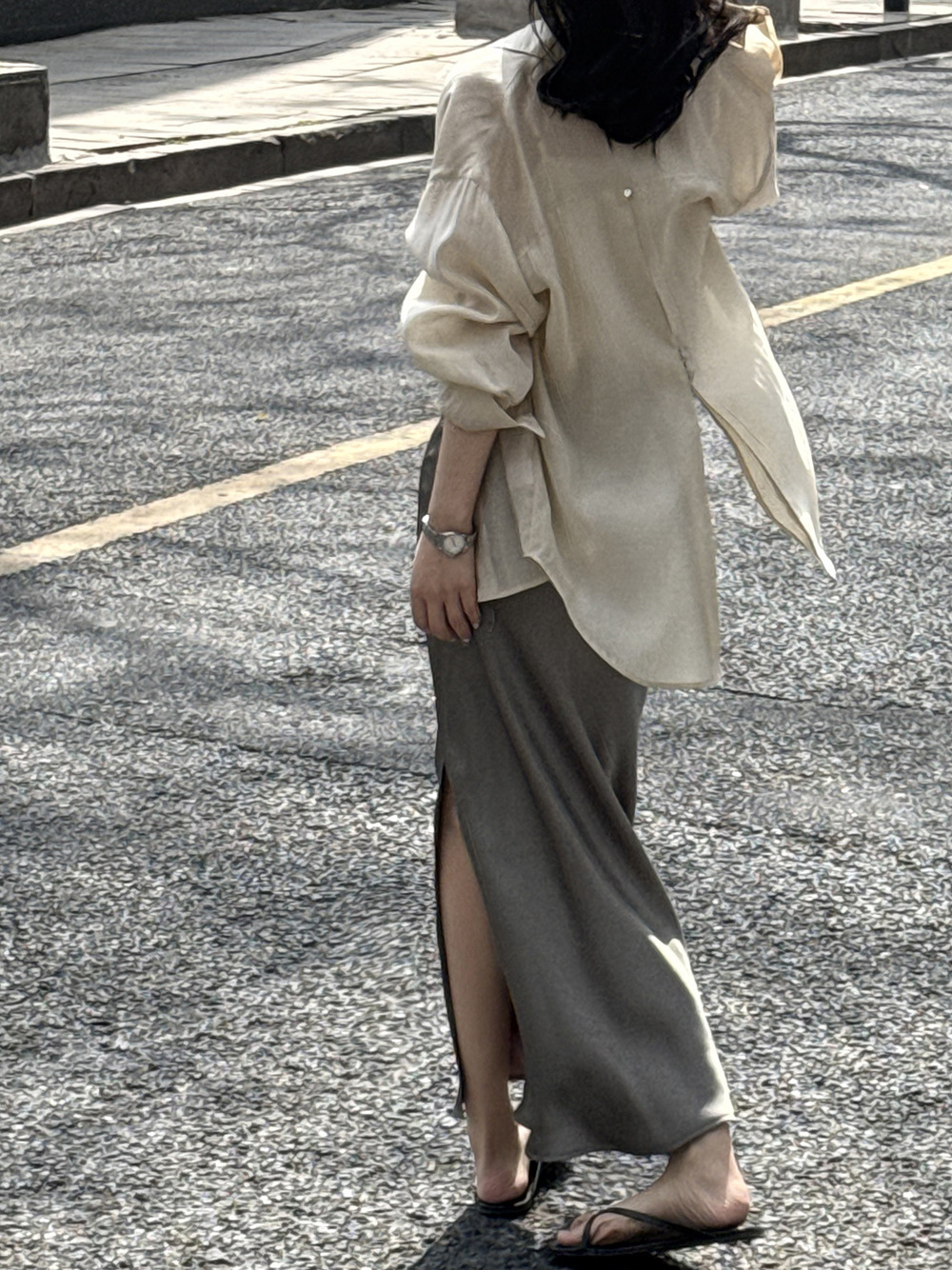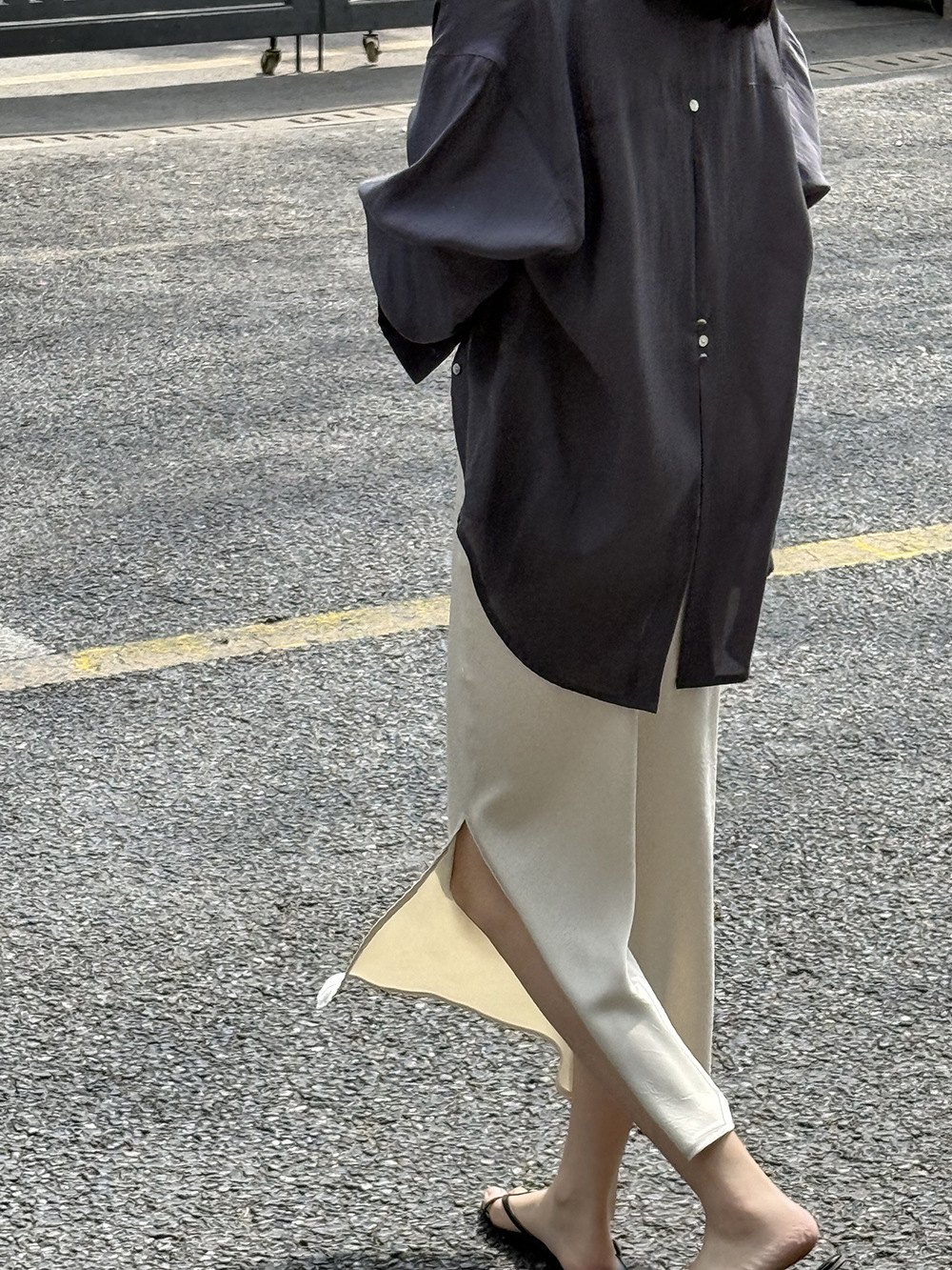 여성용 백 슬릿 텐셀 셔츠 여름 얇은 디자인 틈새 아우터 블라우스 탑 루즈한 자외선 차단 재킷