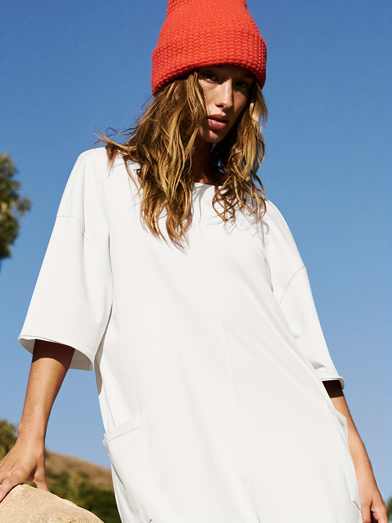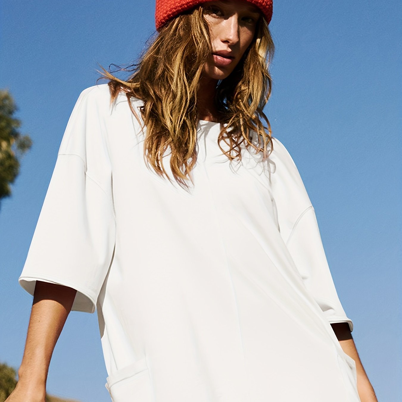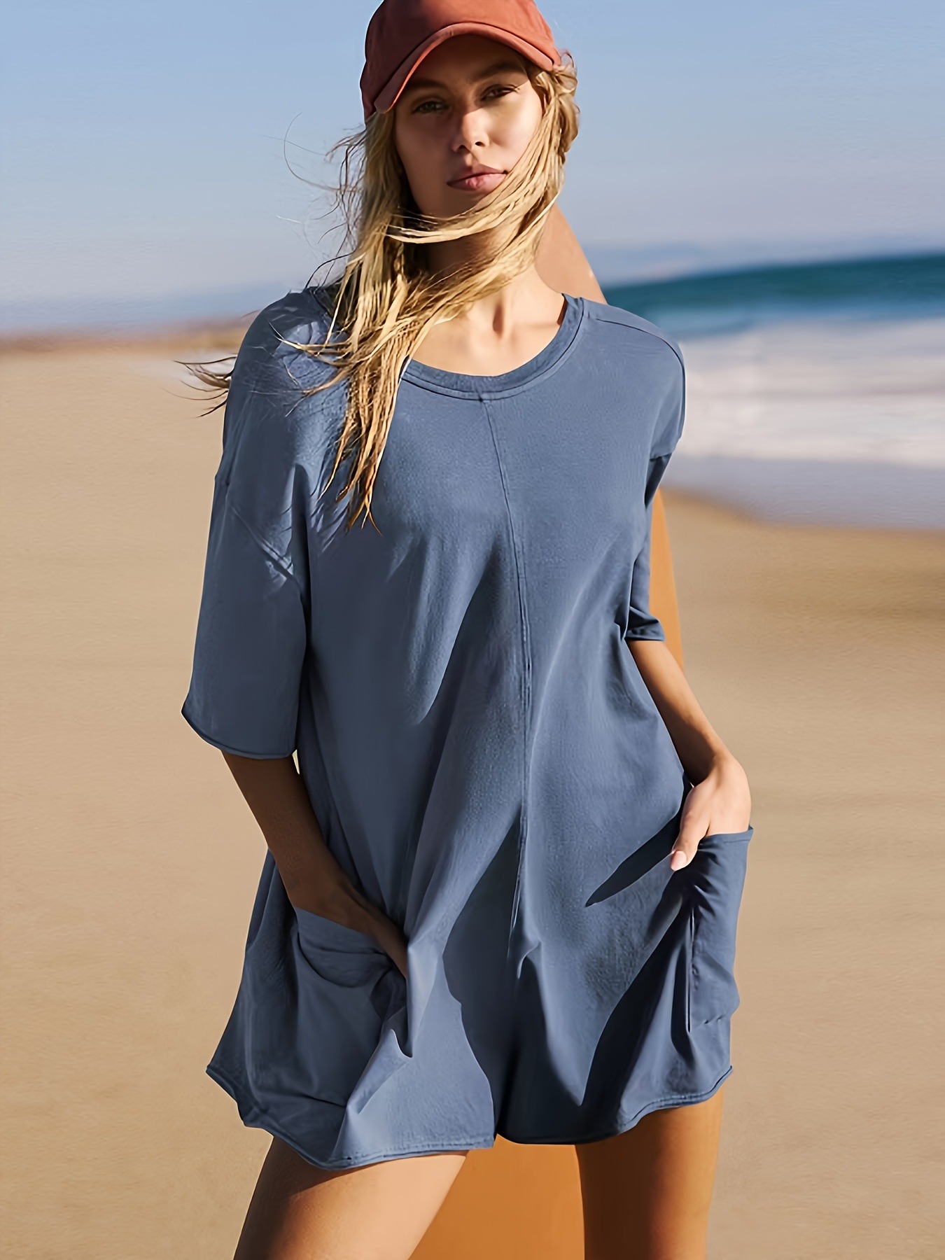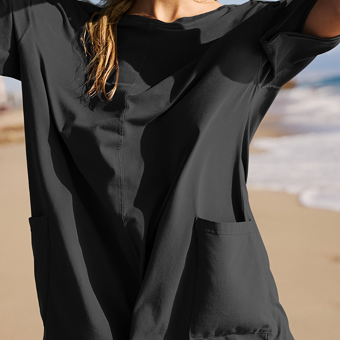 솔리드 컬러 롬퍼 점프수트 캐주얼 하프 슬리브 크루넥 크로스보더