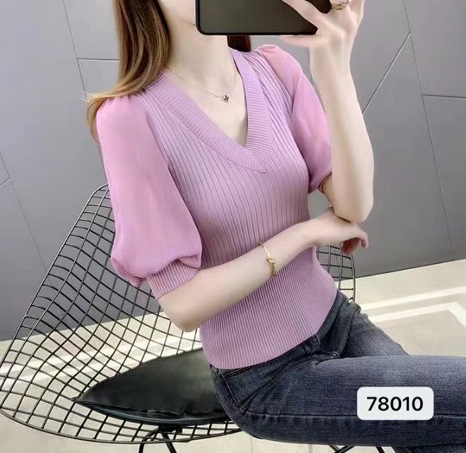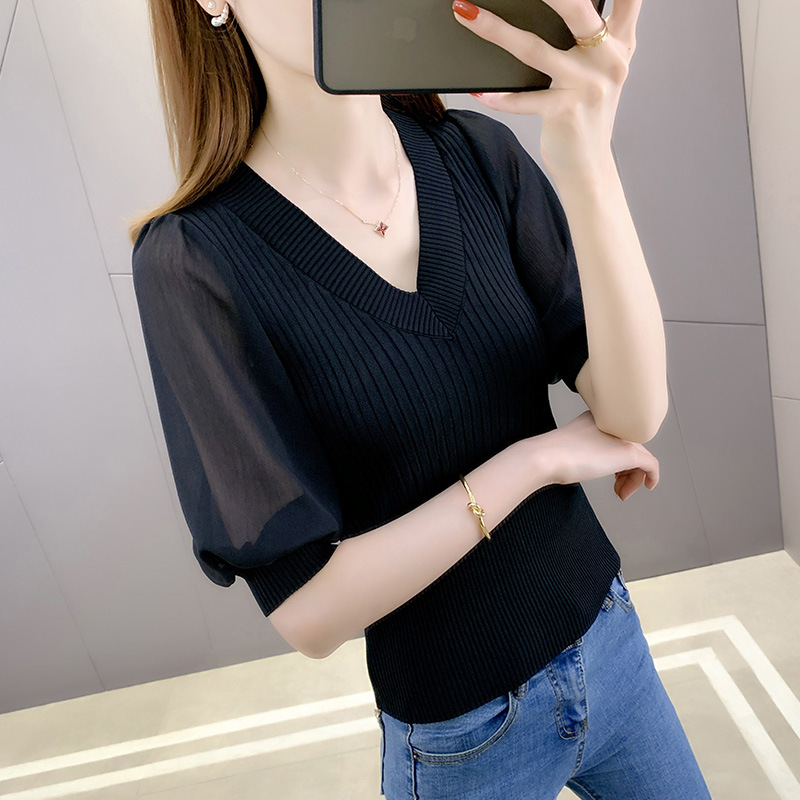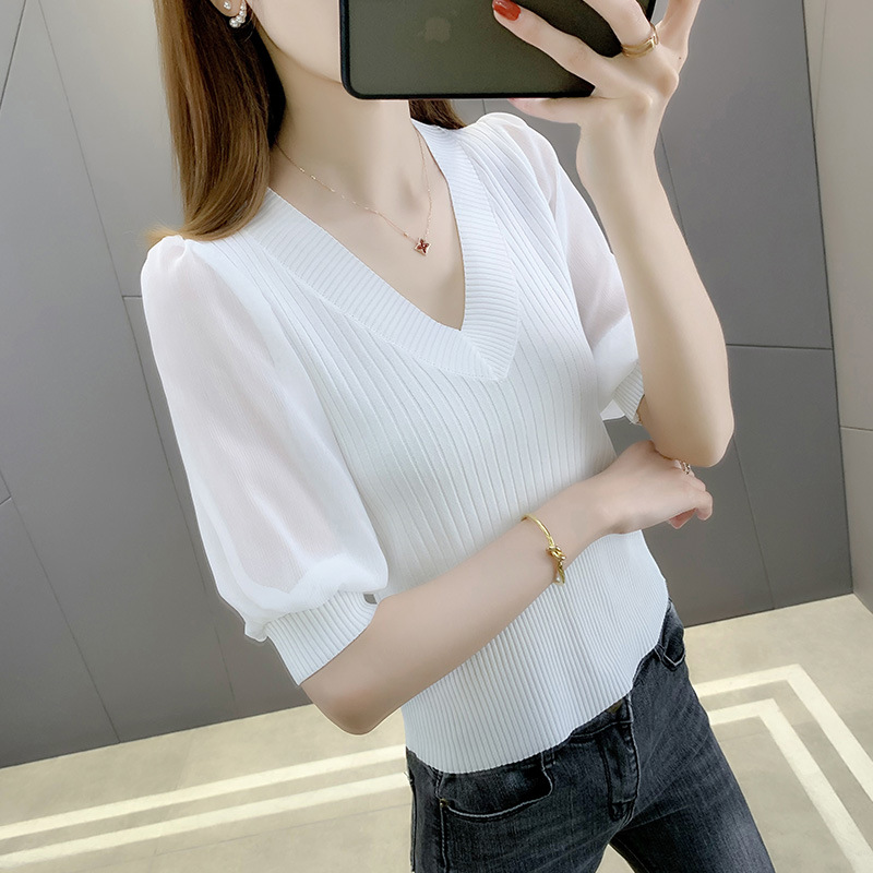 아이스 실크 니트 스웨터 티셔츠 여성 반팔 뉴 브이넥 슬림 바닥 셔츠 스위트 얇은 쉬폰 스플 라이스 탑