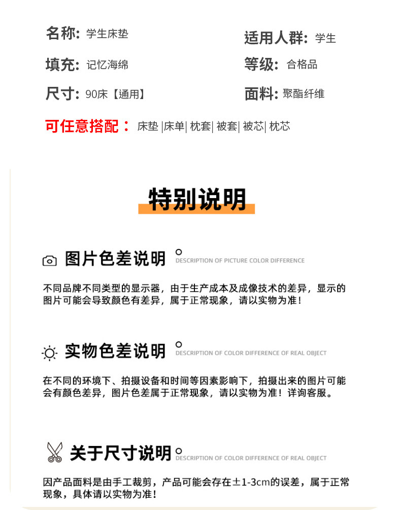 • 3피스 매트리스 커버 세트: 이불 커버 150*200cm, 매트리스 커버 90*200+15cm, 베갯잇 48x74cm/전용