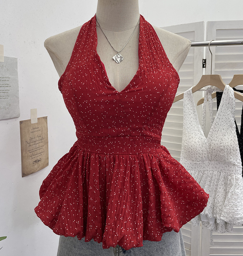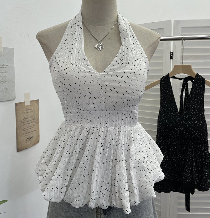 실제 촬영된 폴카 도트 홀터넥 캐미솔, 등이 없는 리본 스커트, 배를 커버하고 날씬해 보이는 짧은 민소매 탑 9260