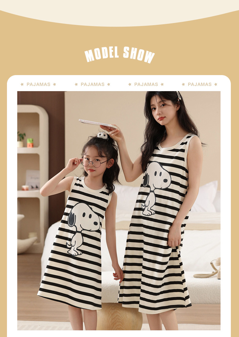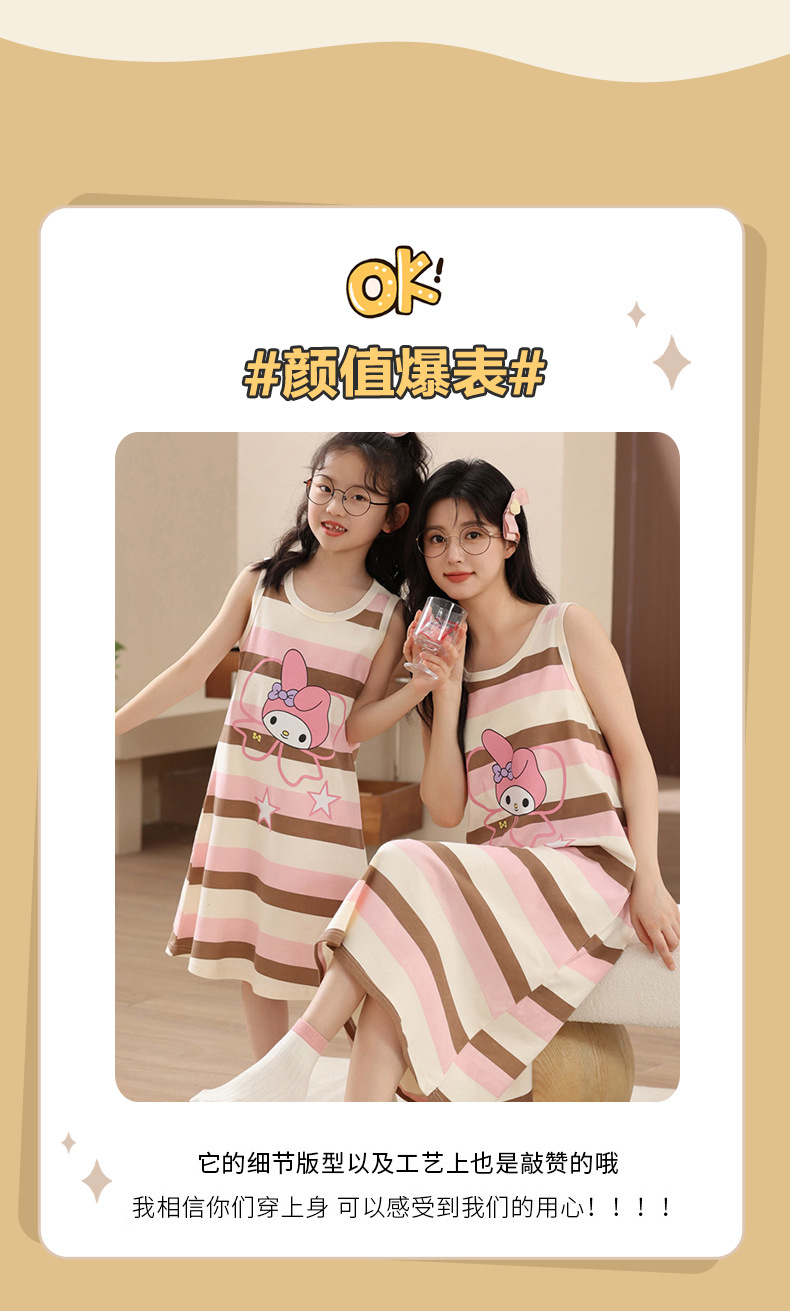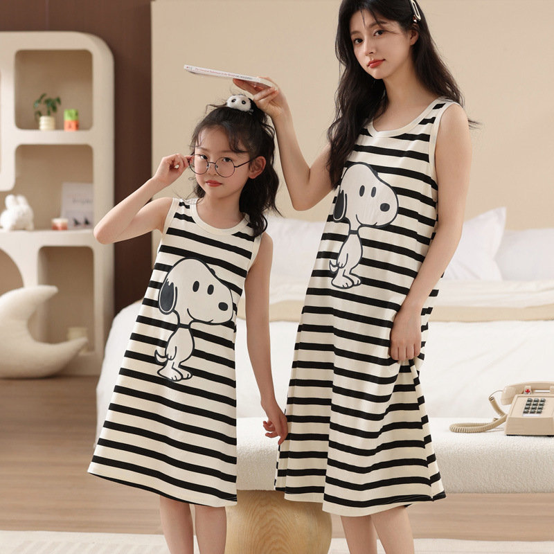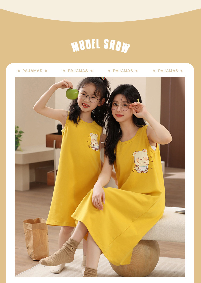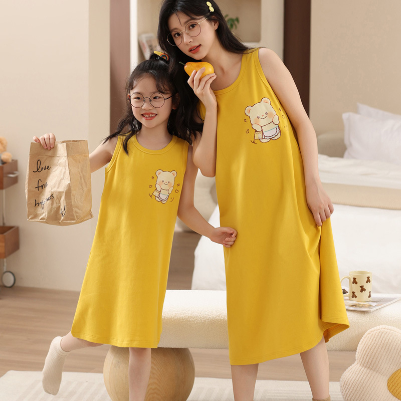 어머니와 딸 조끼 민소매 만화 여름 새로운 스타일 코튼 귀여운 원피스 잠옷 드레스 성인 가슴 패드 홈 드레스