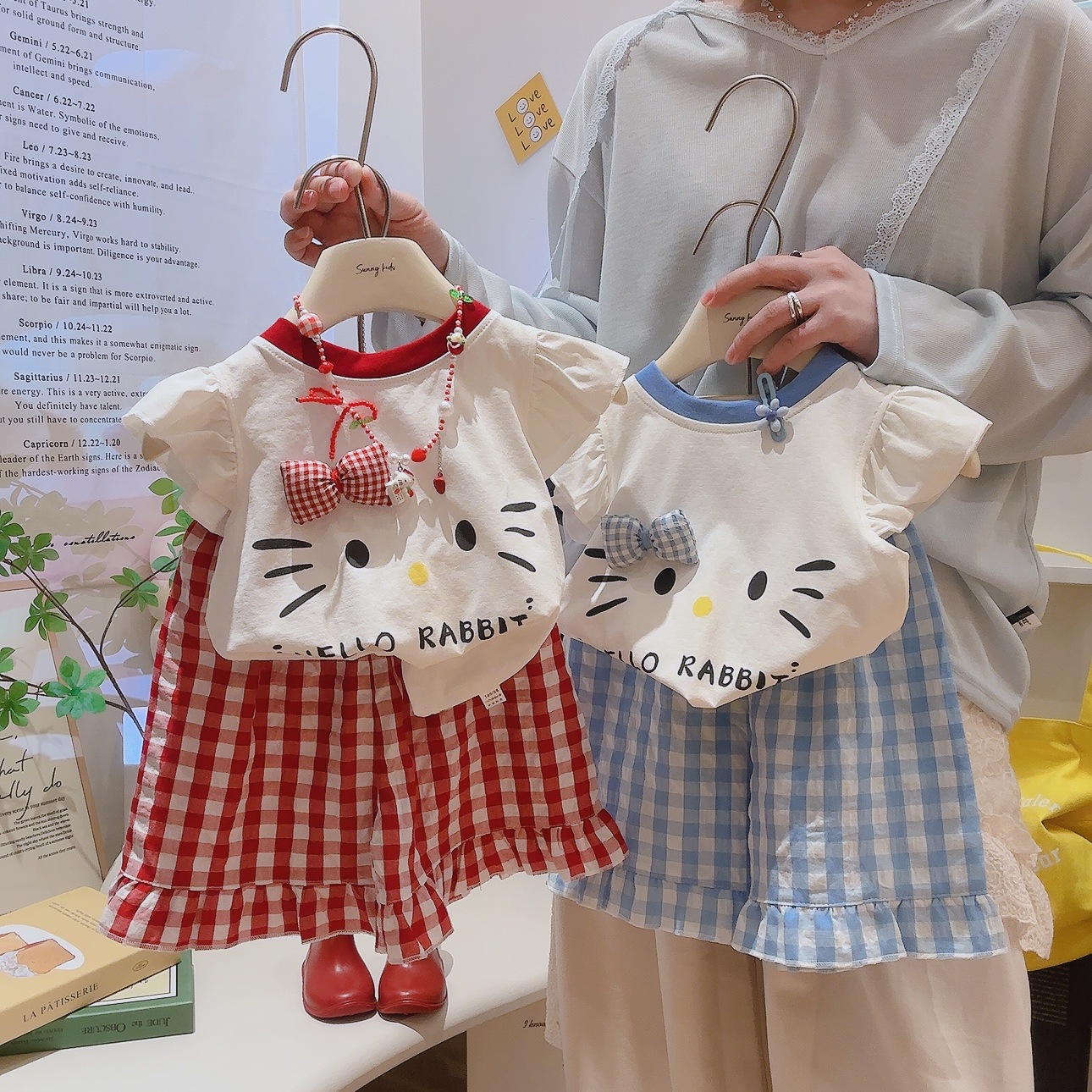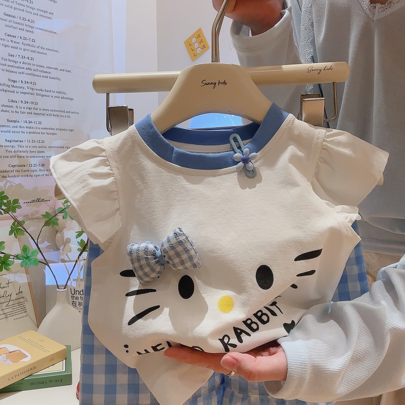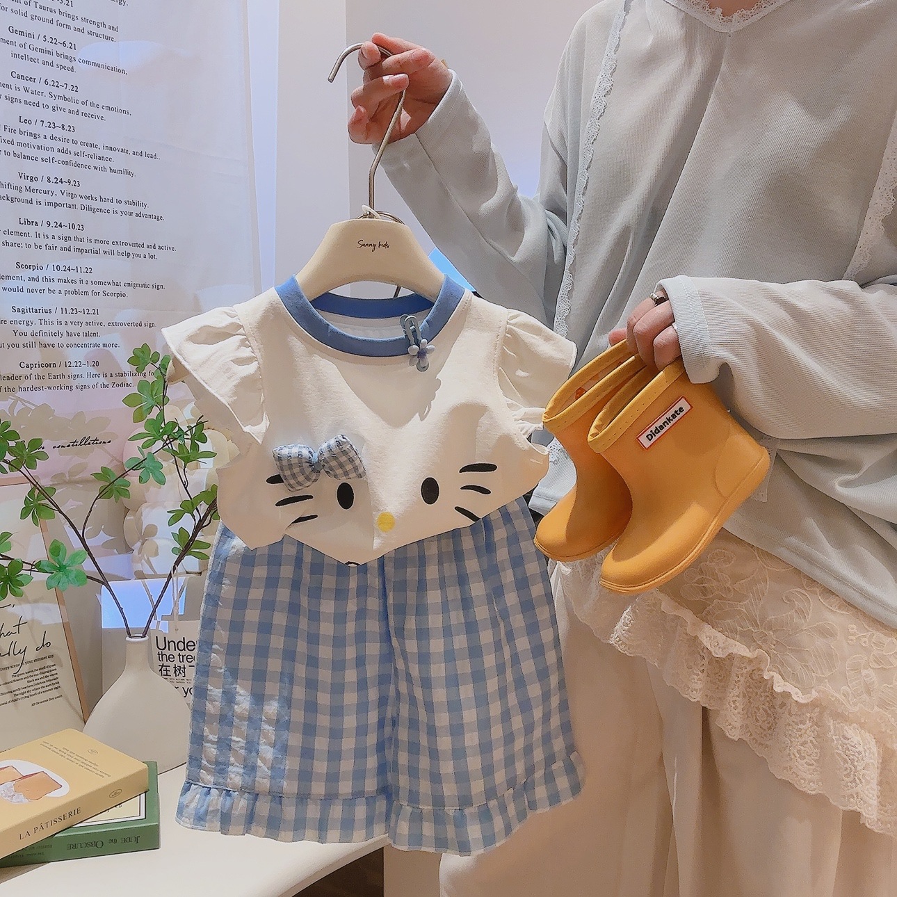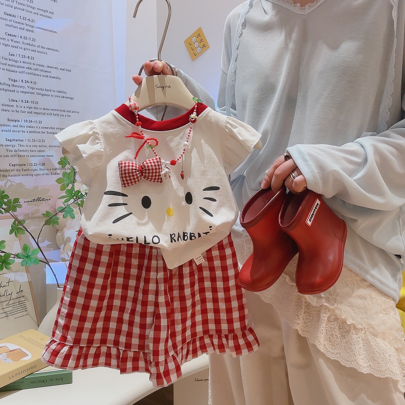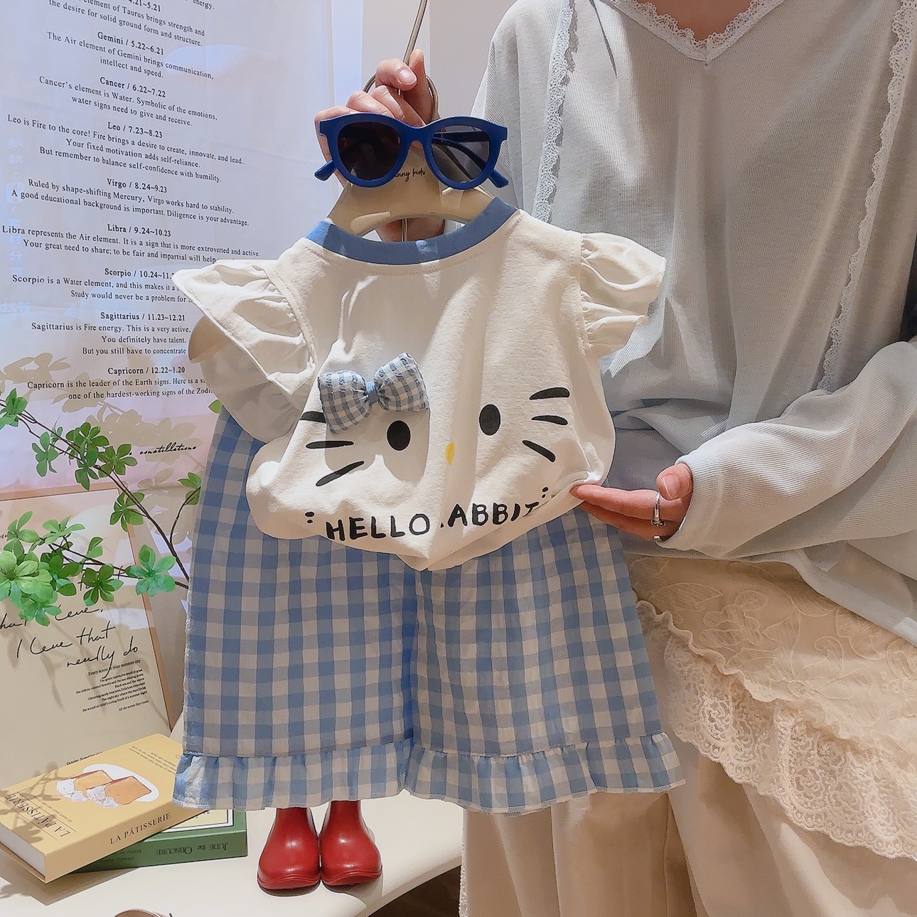 2025 새로운 여자 투피스 세트 어린이 플라잉 슬리브 보우 반팔 반바지 여름 만화 캐주얼 격자 무늬 양복스토어 가기