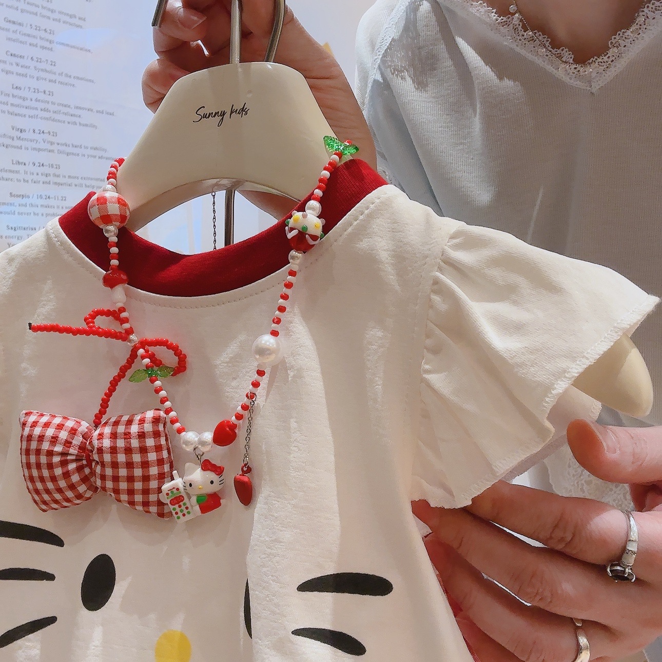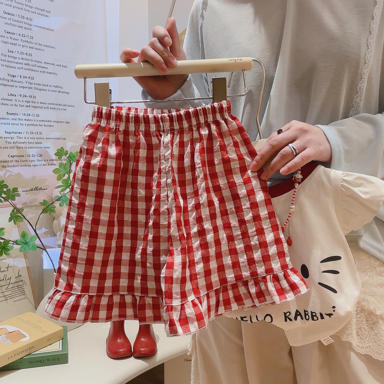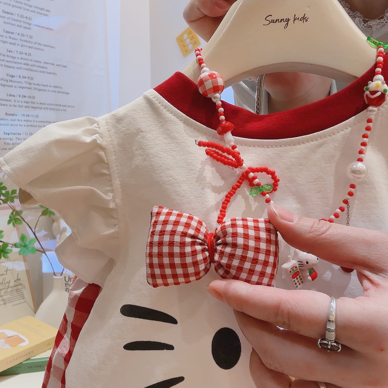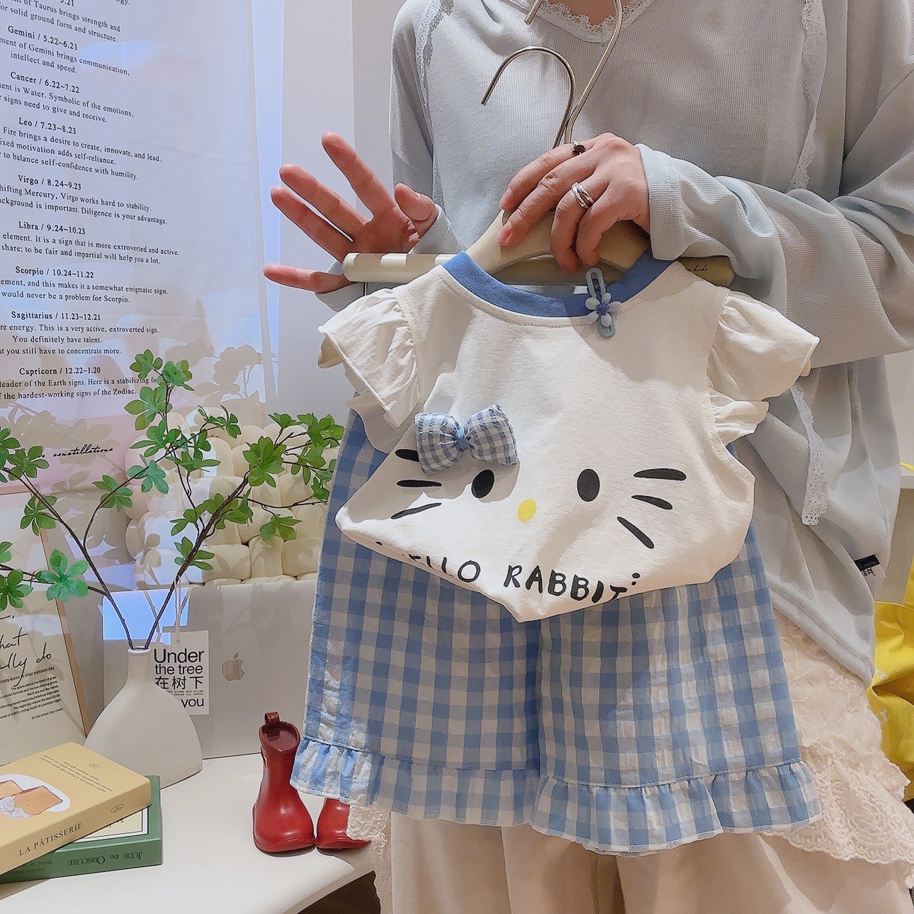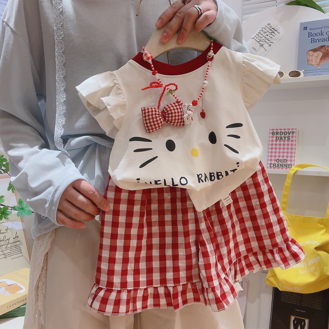 2025 새로운 여자 투피스 세트 어린이 플라잉 슬리브 보우 반팔 반바지 여름 만화 캐주얼 격자 무늬 양복스토어 가기