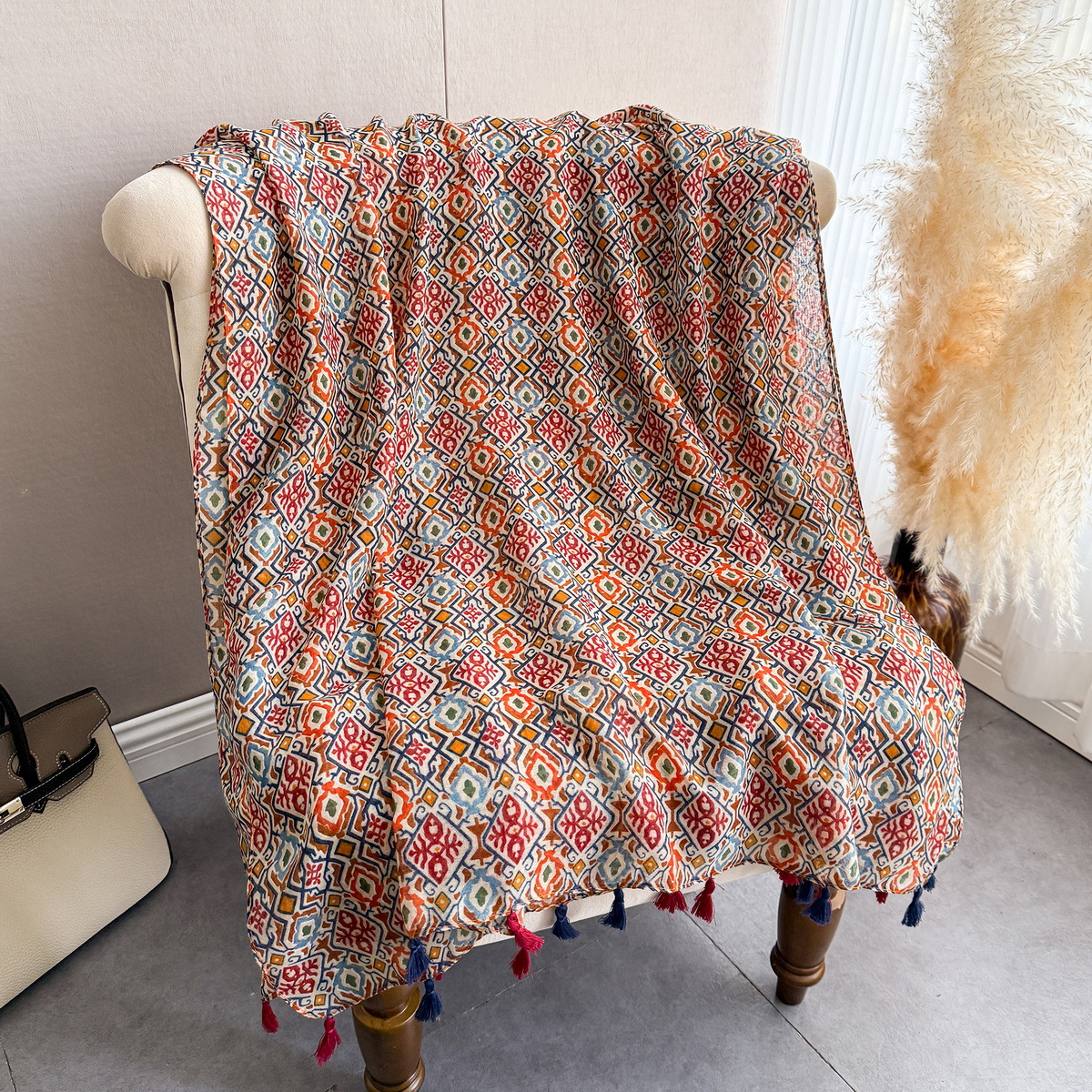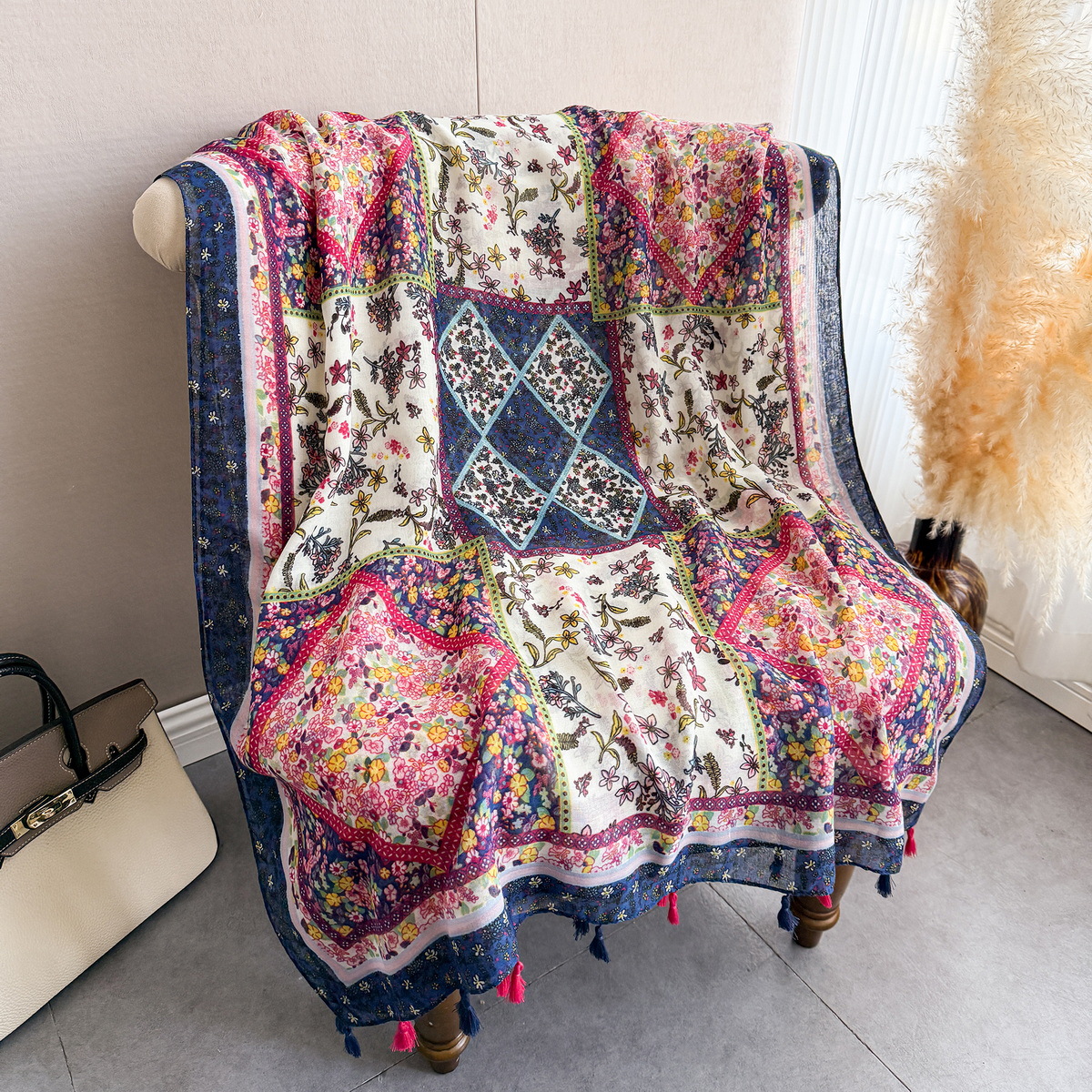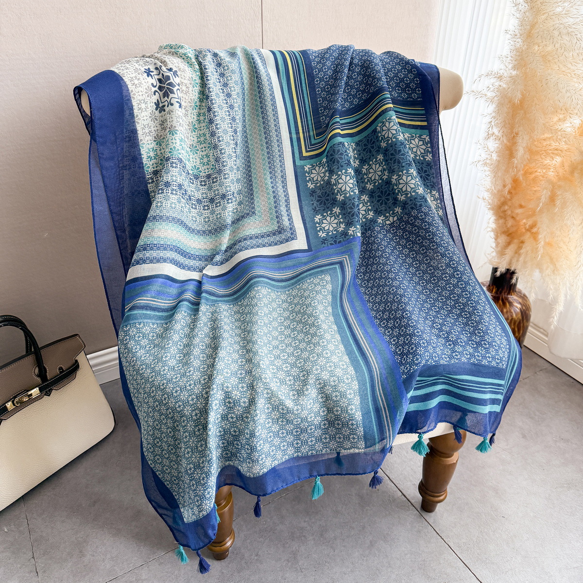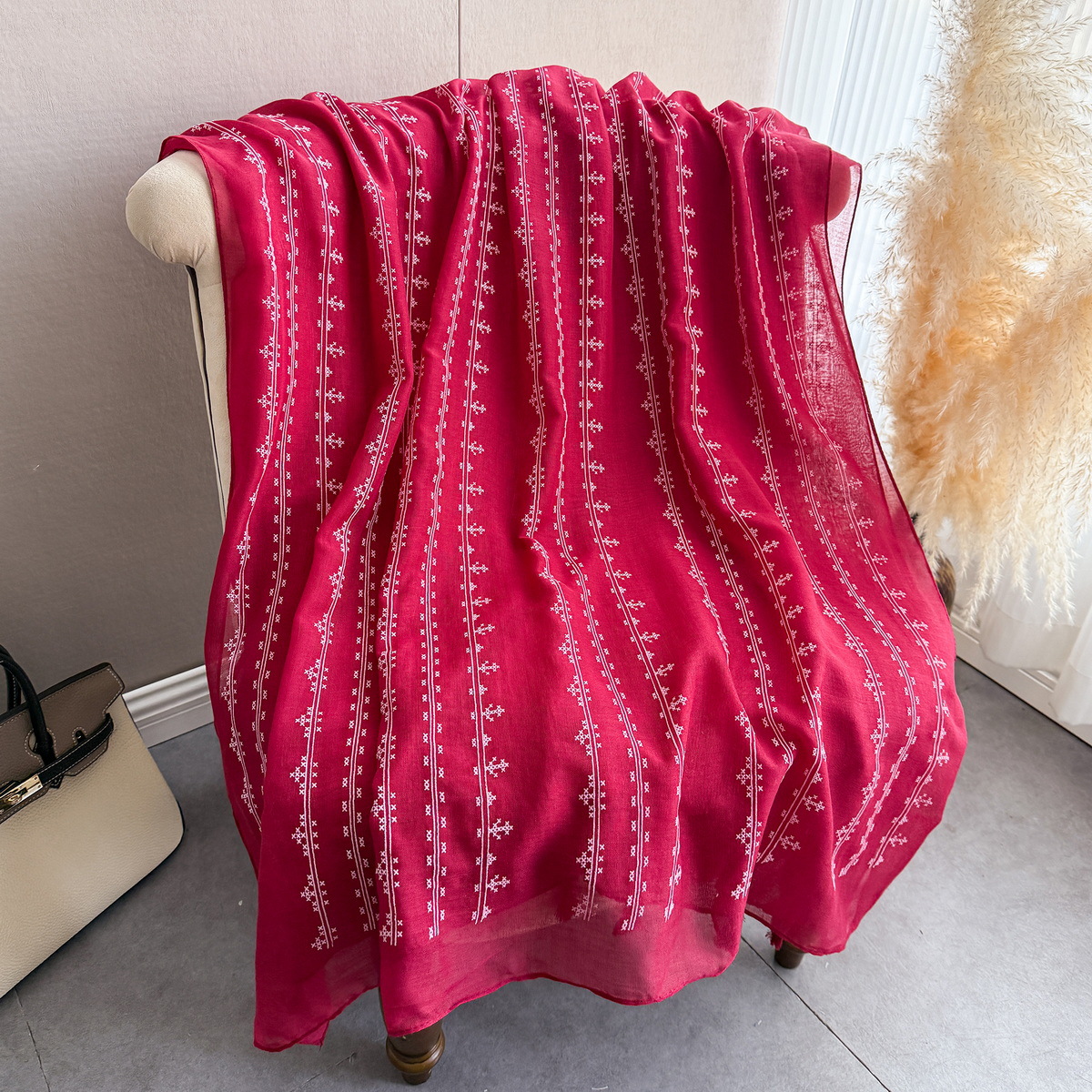봄 여름 신상 기하학 무늬 면마 소재 일본풍 문예풍 면마 스카프 여성 여행 사진 촬영용 차양 숄