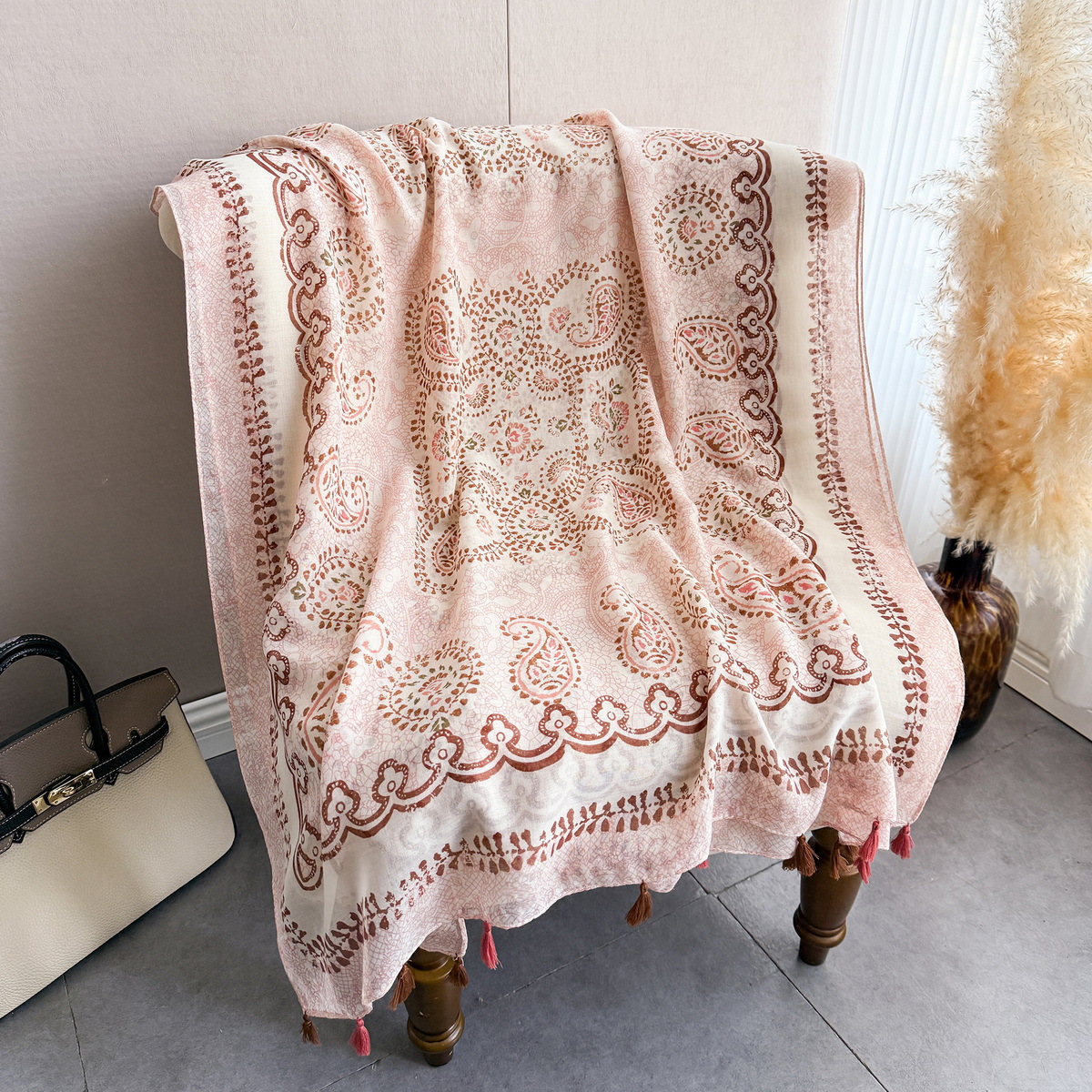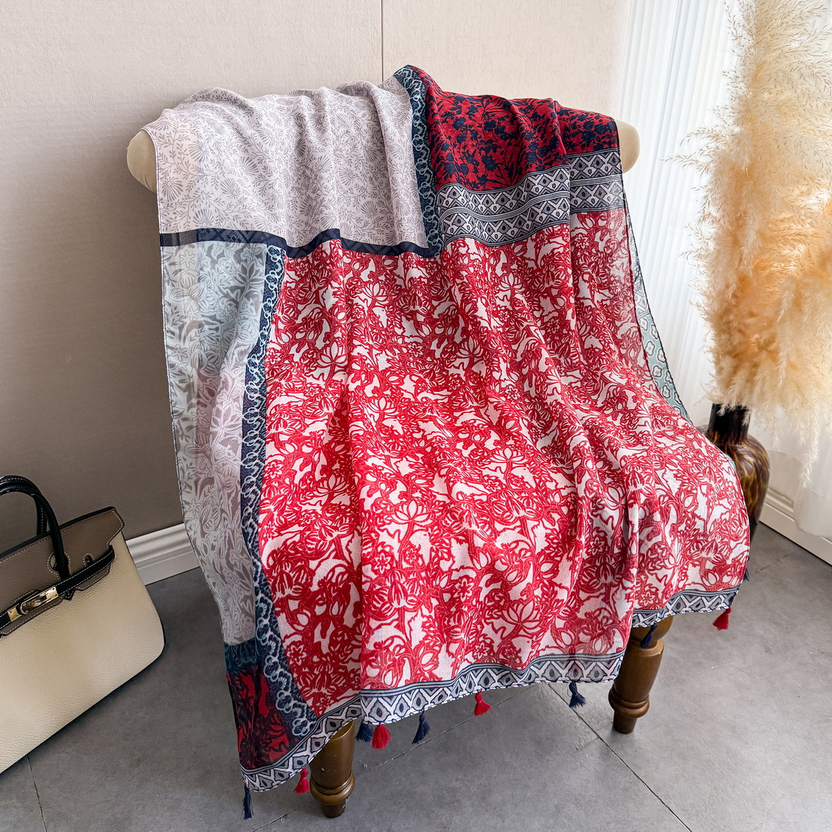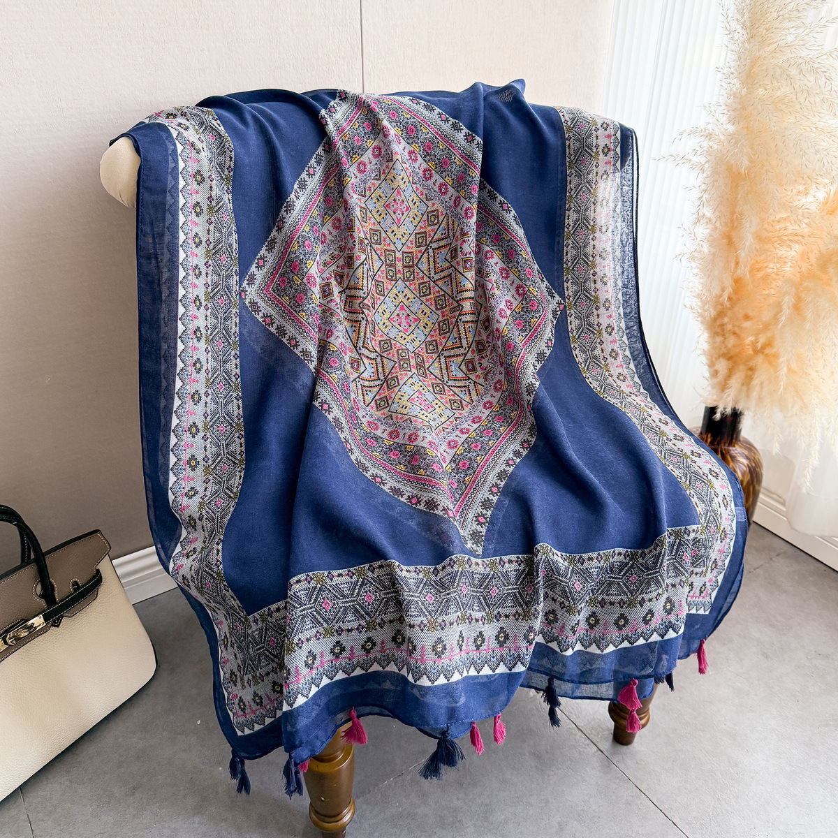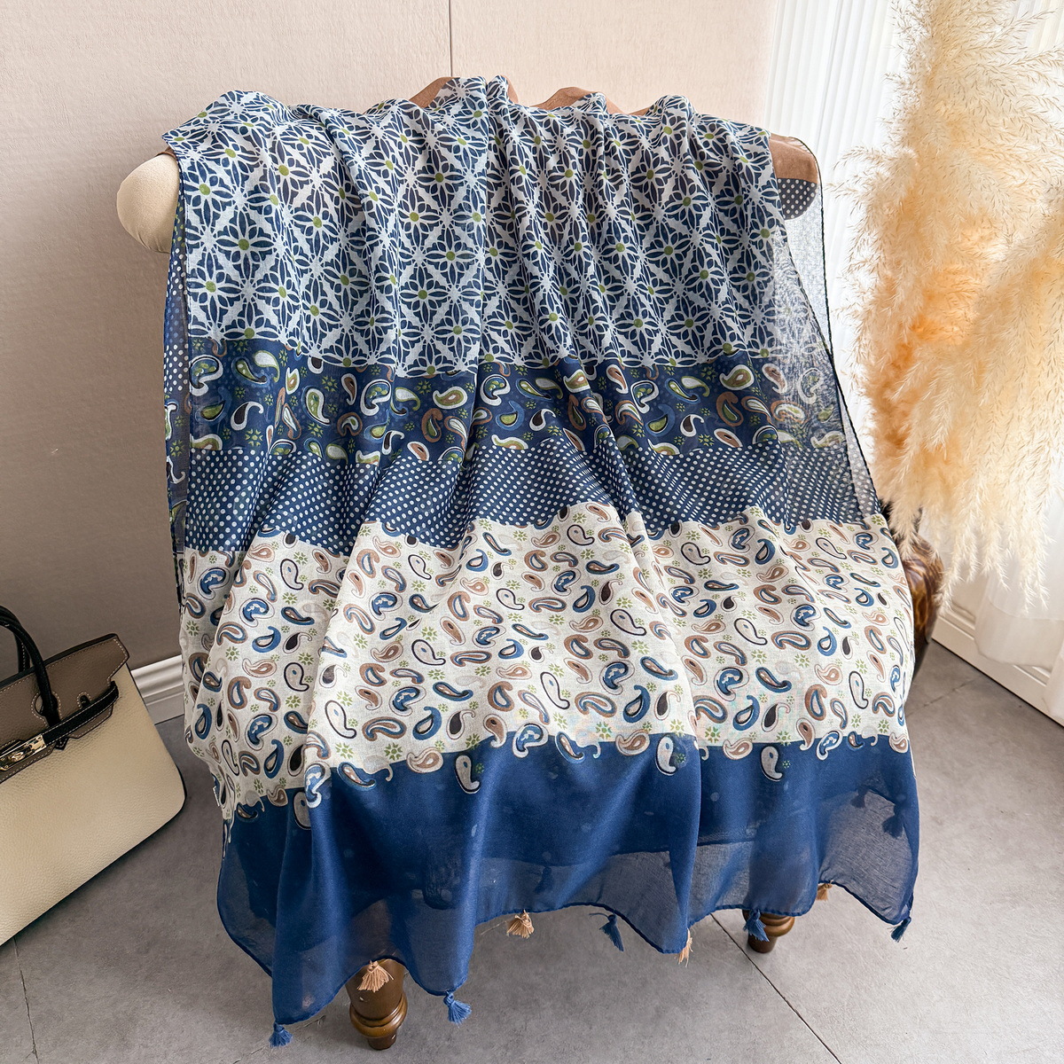 봄 여름 신상 기하학 무늬 면마 소재 일본풍 문예풍 면마 스카프 여성 여행 사진 촬영용 차양 숄