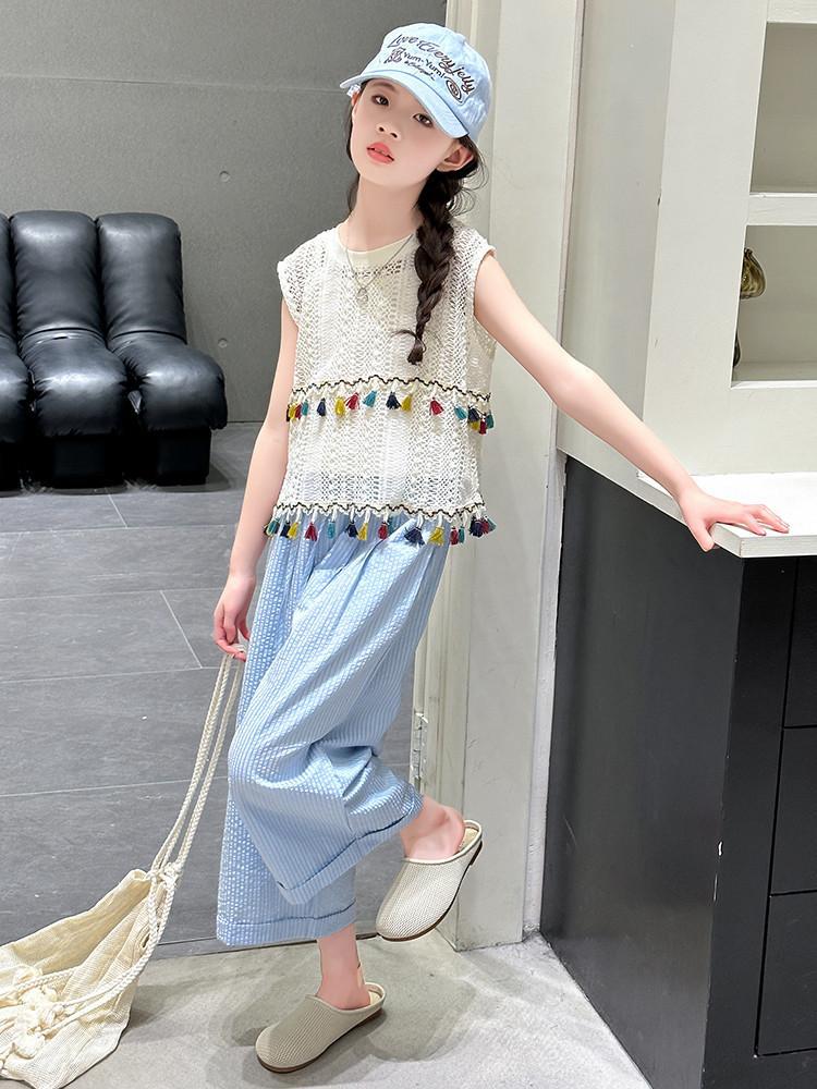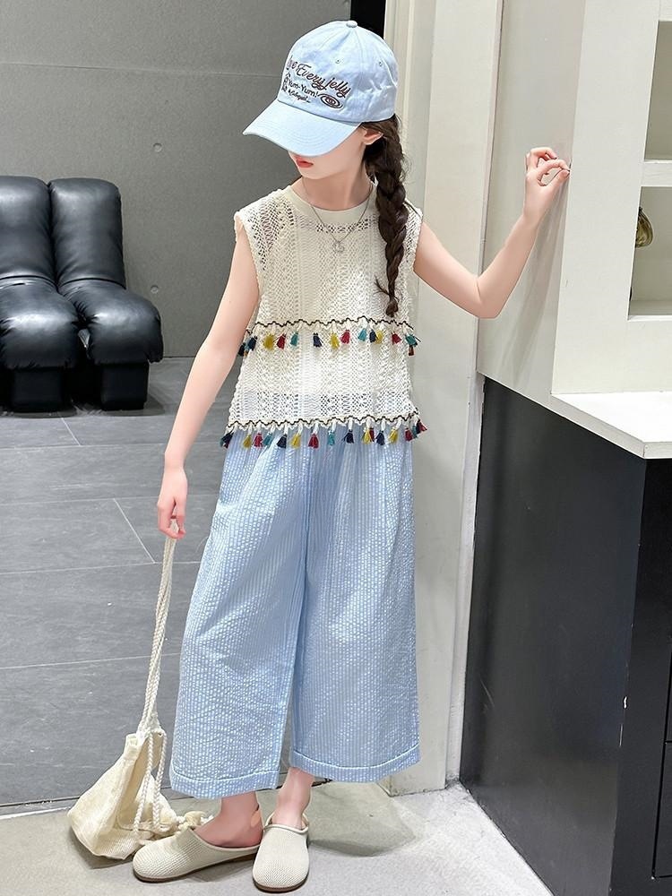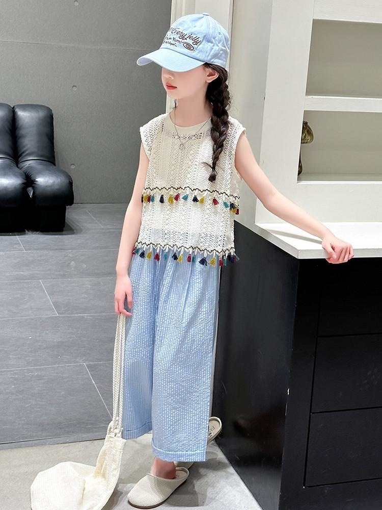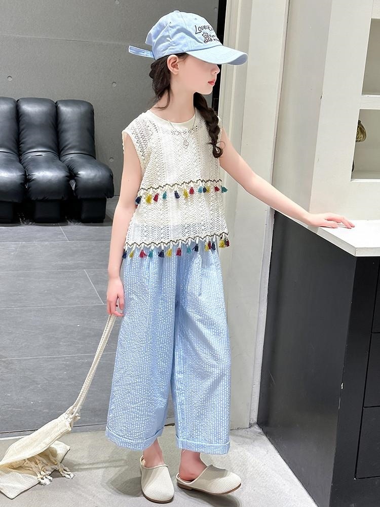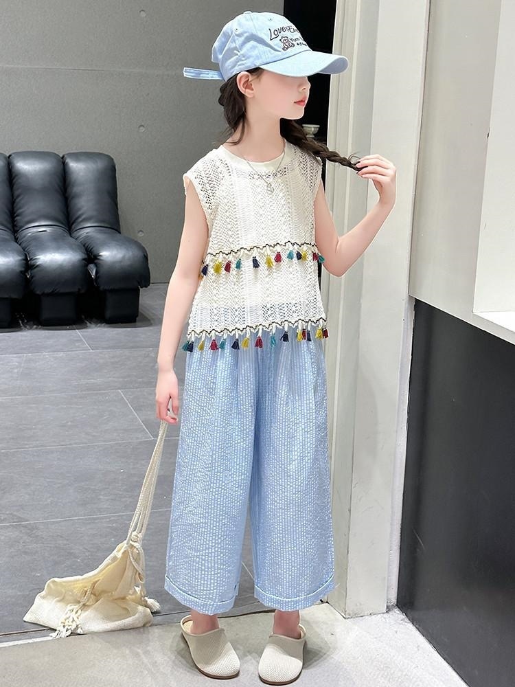 여아, 중대형 아동 여름 스위트 슈트, 3피스 민소매 캐미솔 와이드 팬츠, 패셔너블한 캐주얼 휴가 스타일