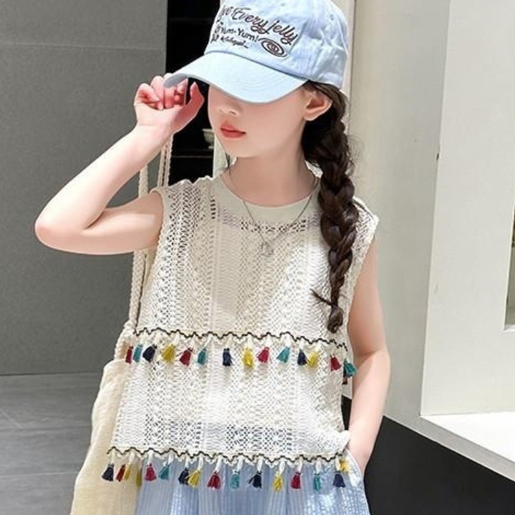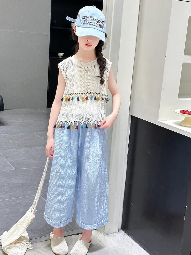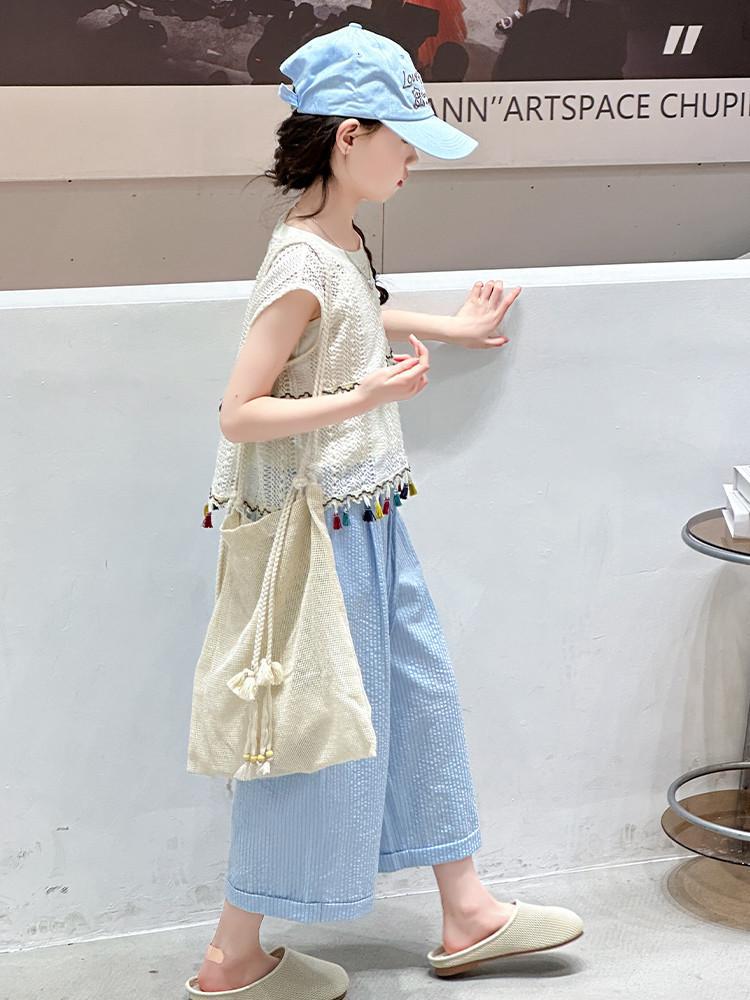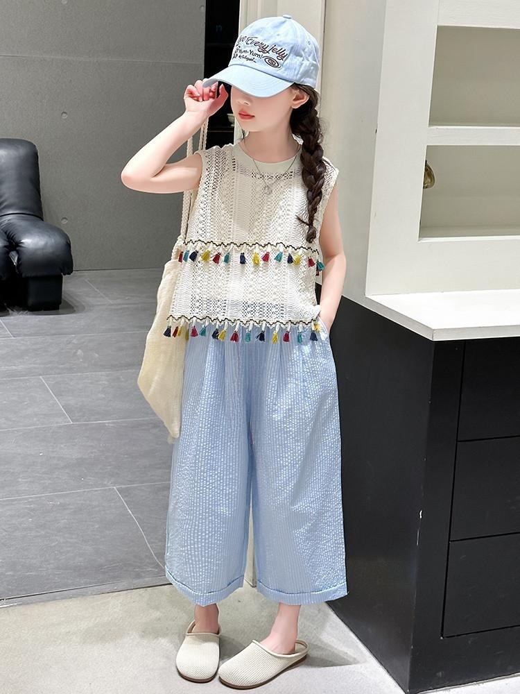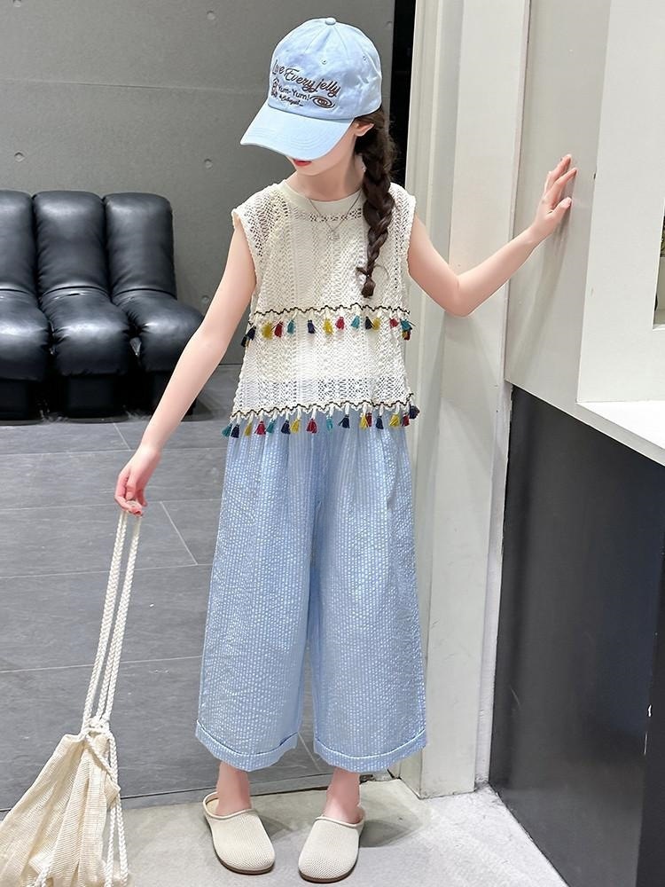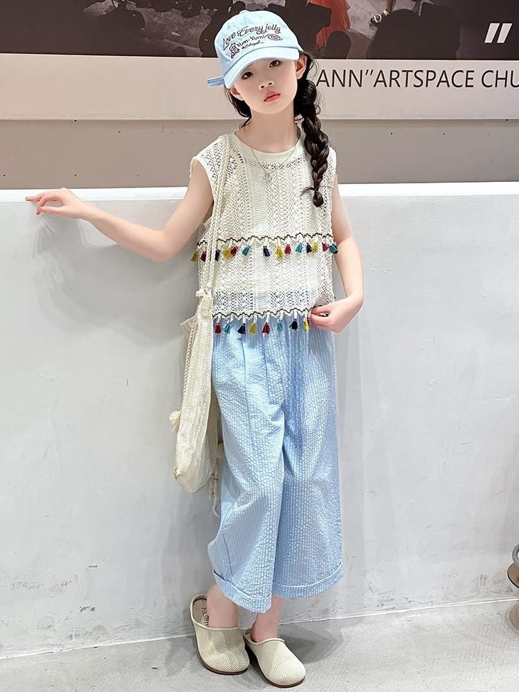 여아, 중대형 아동 여름 스위트 슈트, 3피스 민소매 캐미솔 와이드 팬츠, 패셔너블한 캐주얼 휴가 스타일스토어 가기