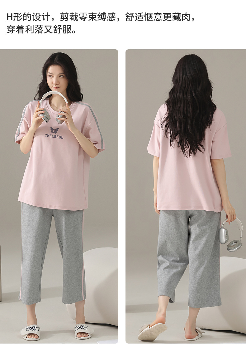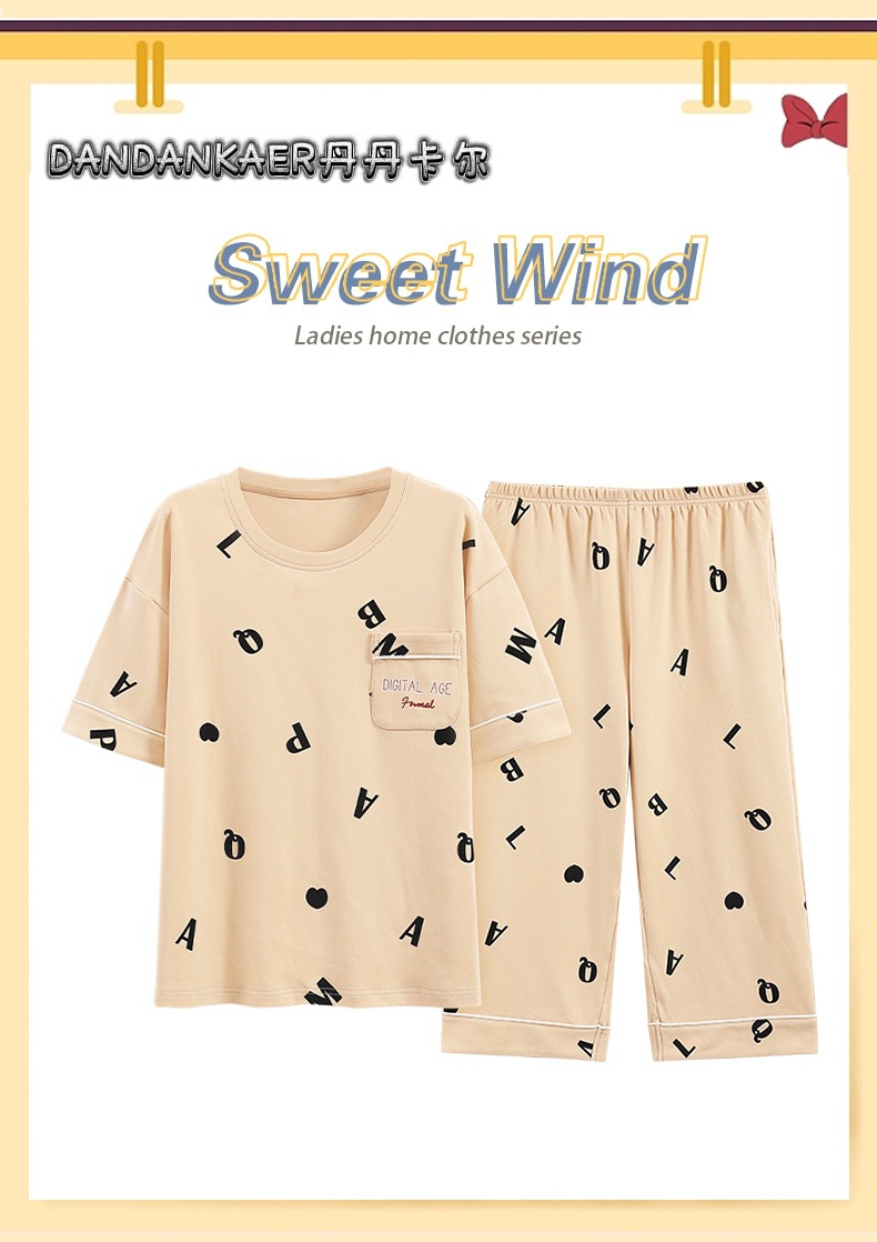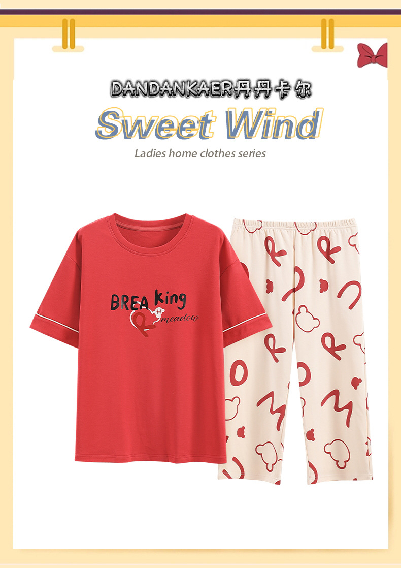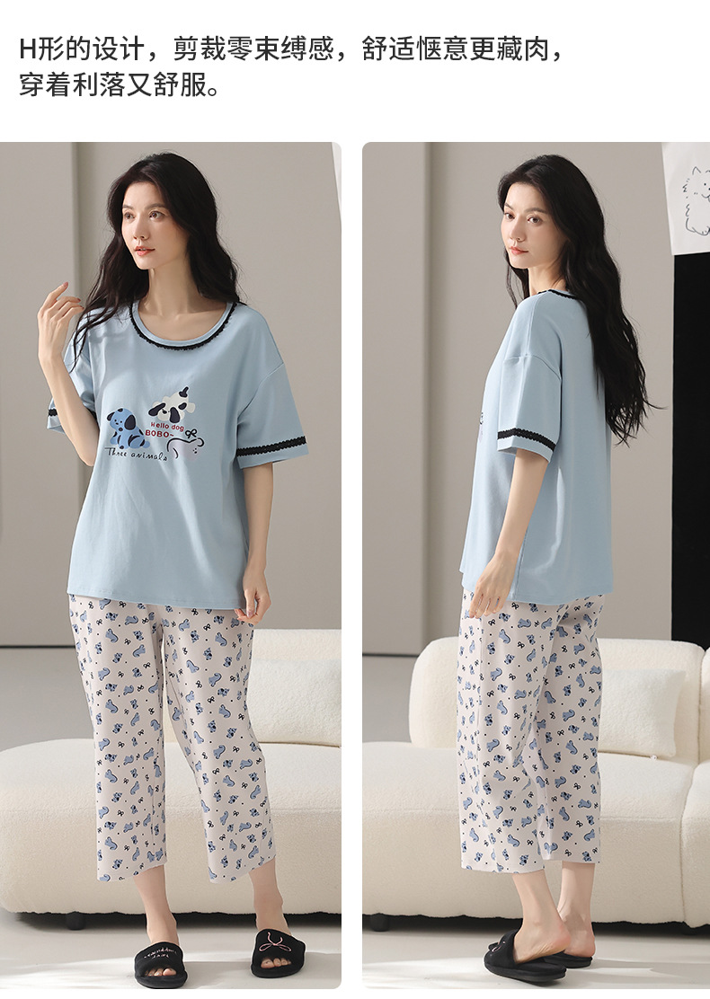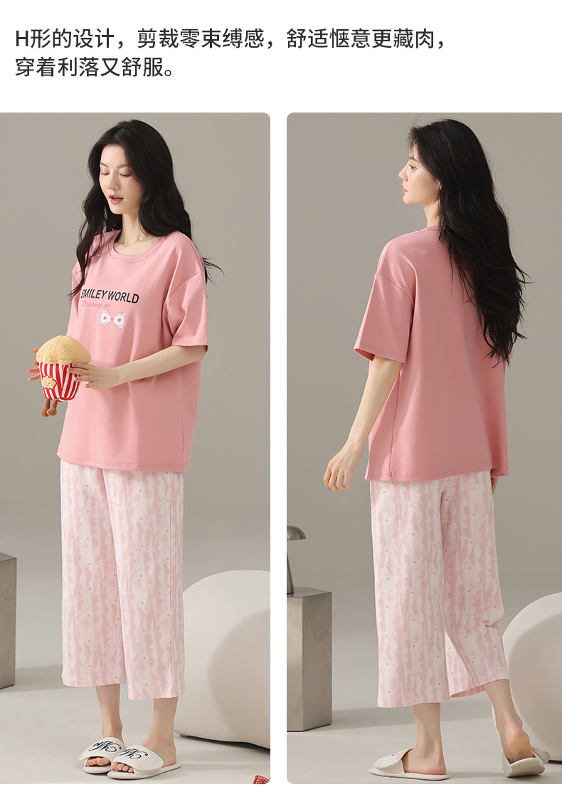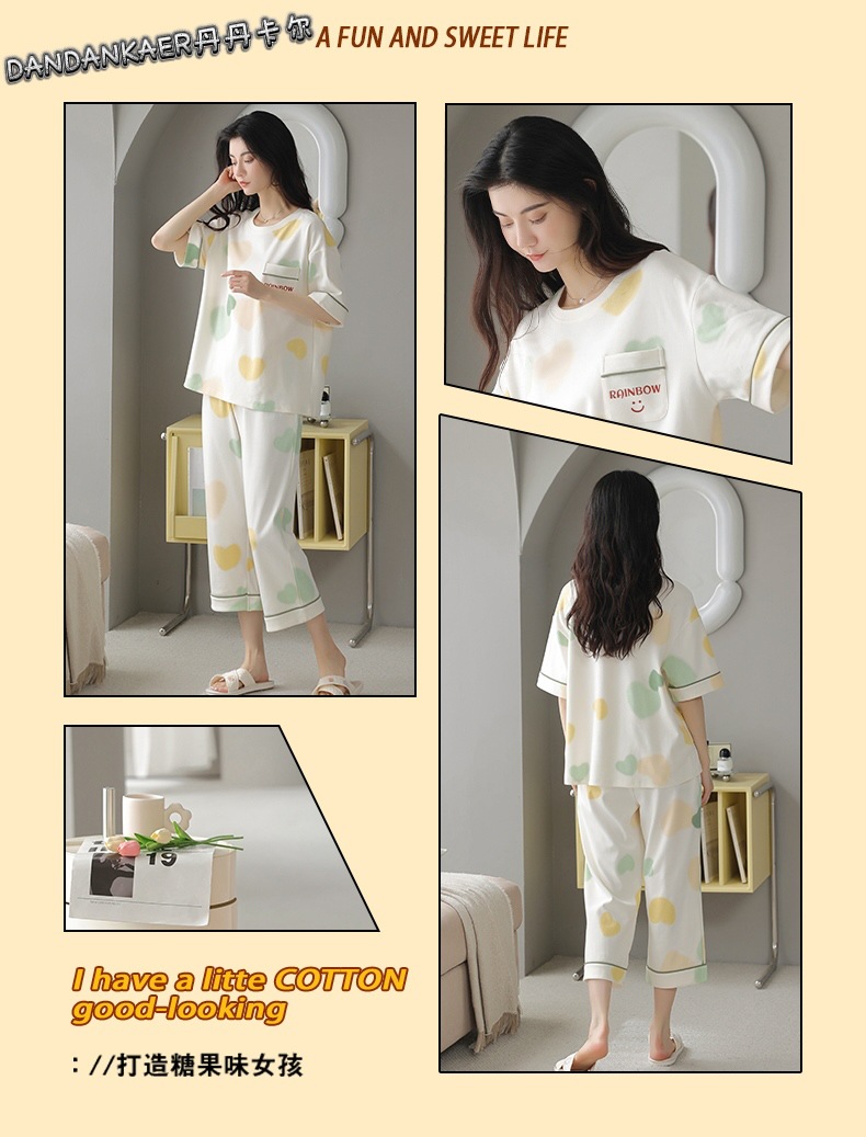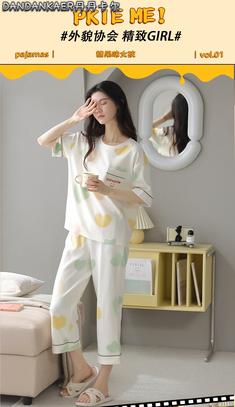 여성용 잠옷 여름 순수 코튼 반팔 캐주얼 달콤하고 귀여운 소녀 학생 플러스 사이즈 크롭 바지 홈웨어 세트스토어 가기