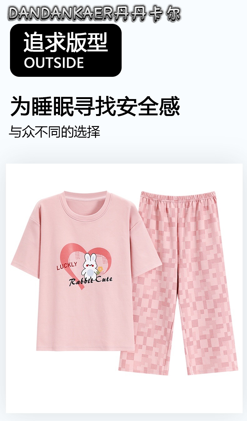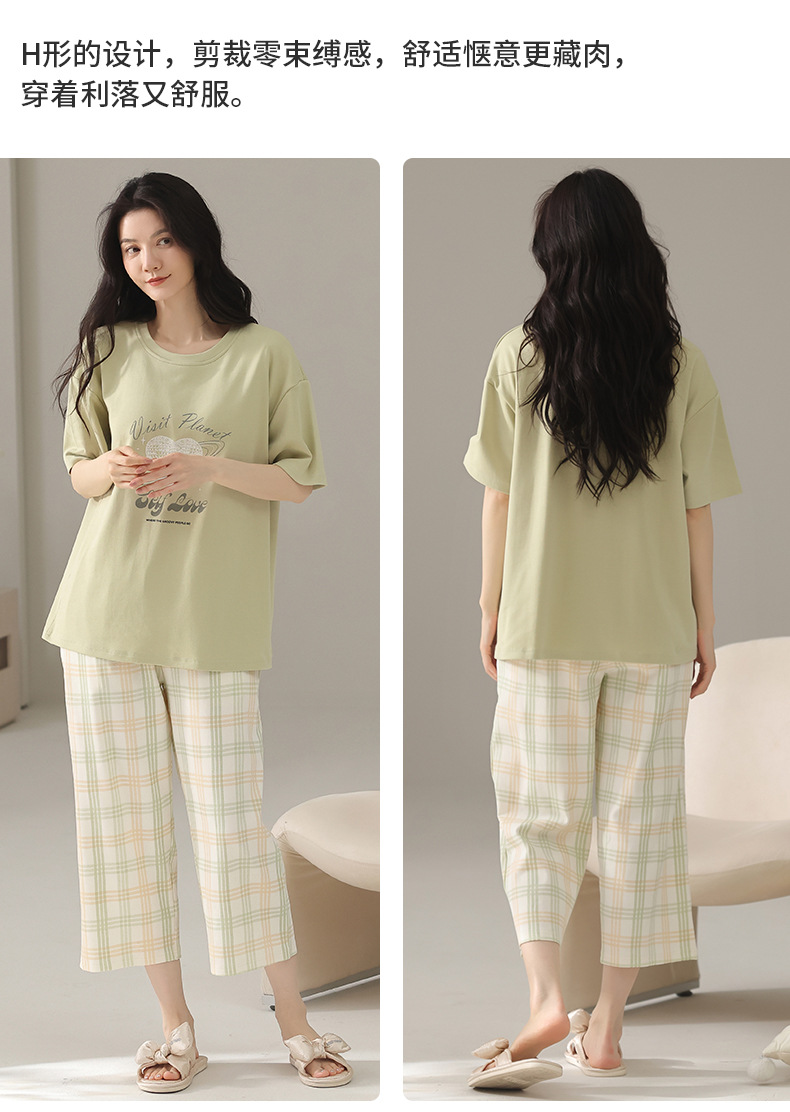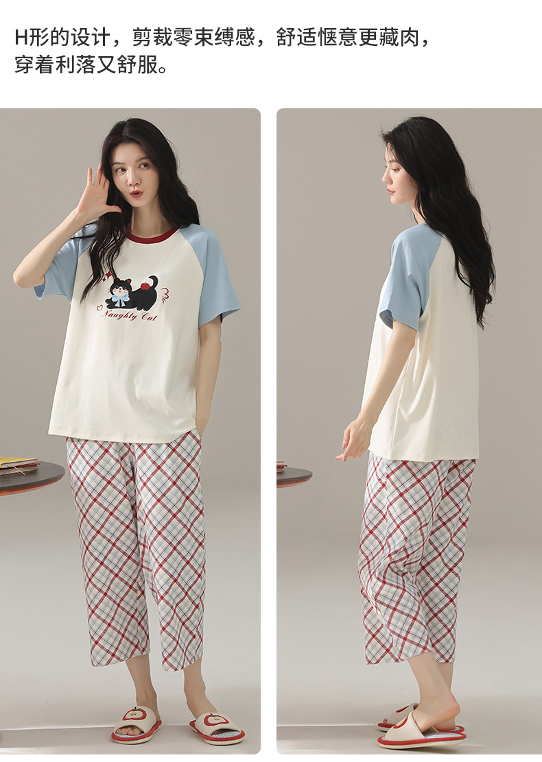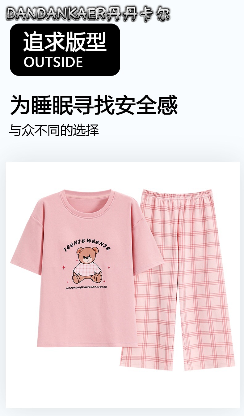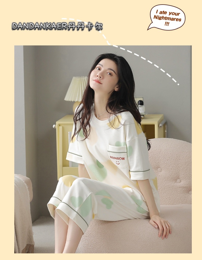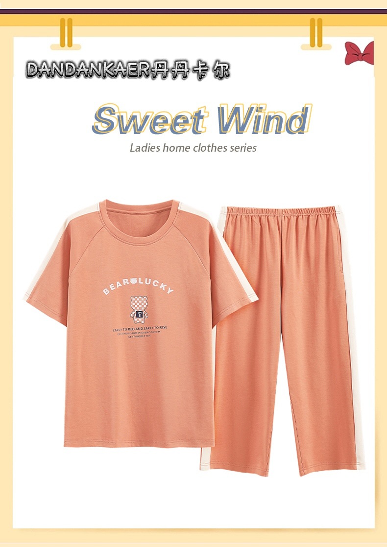 여성용 잠옷 여름 순수 코튼 반팔 캐주얼 달콤하고 귀여운 소녀 학생 플러스 사이즈 크롭 바지 홈웨어 세트스토어 가기