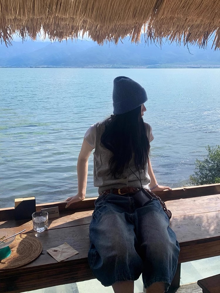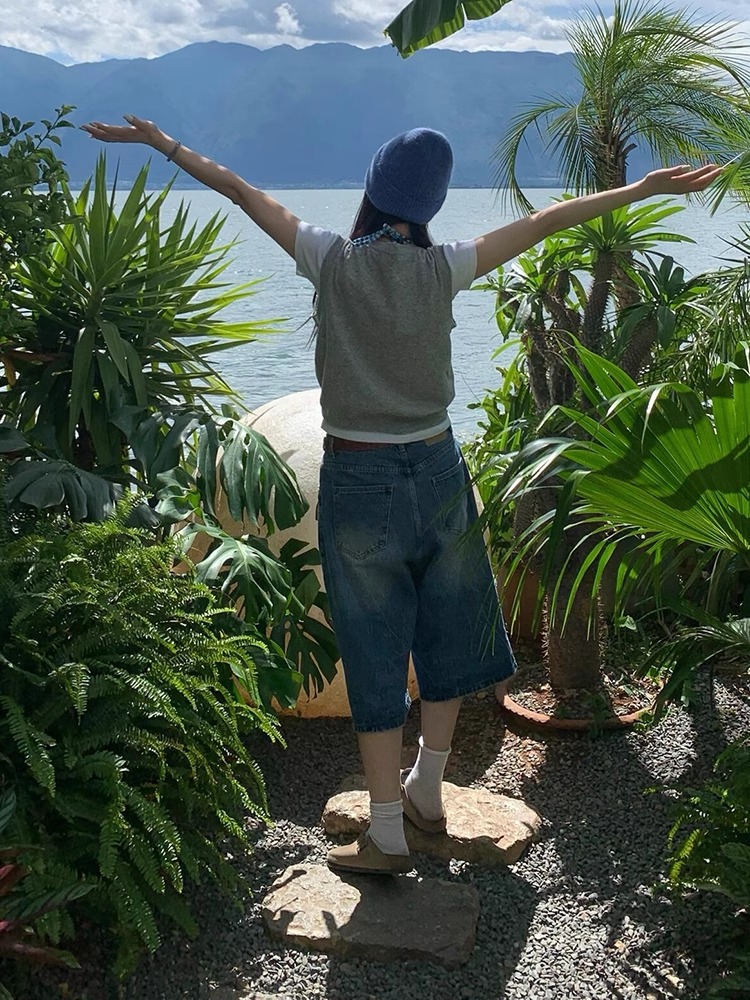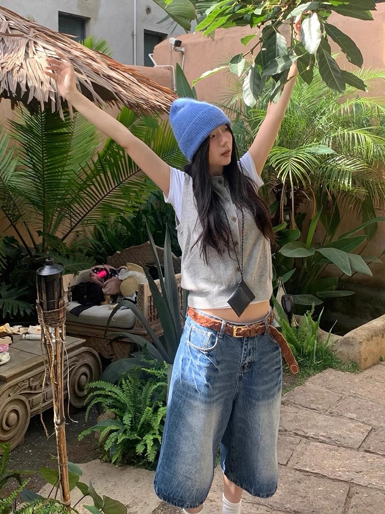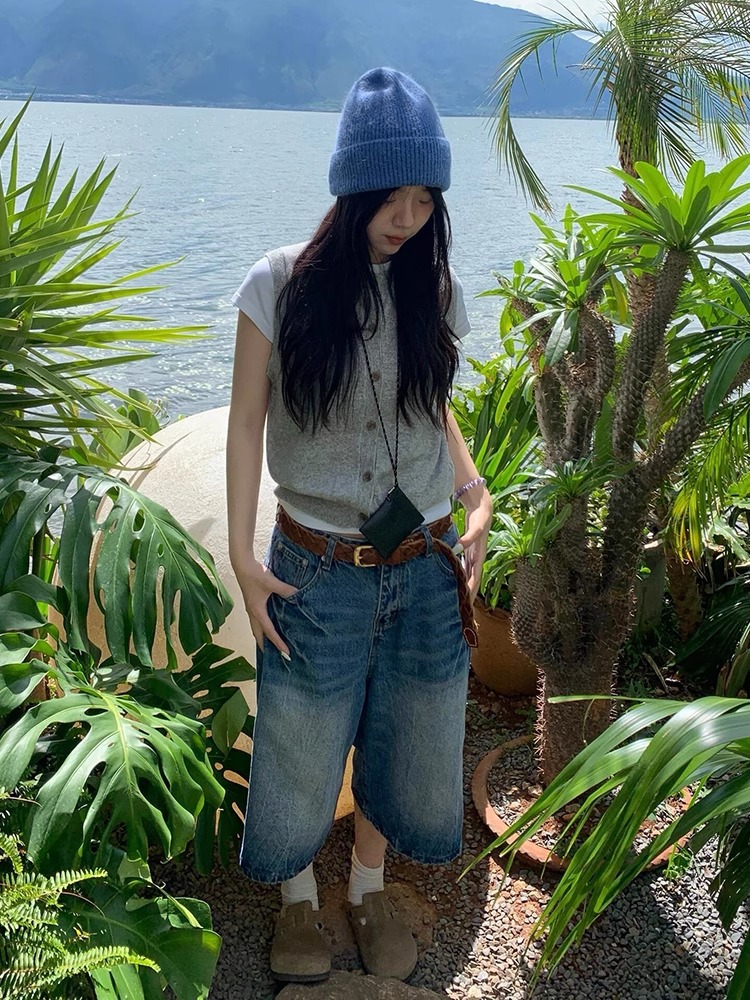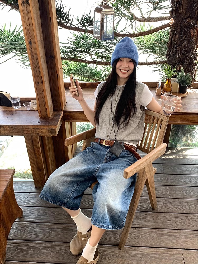 아메리칸 레트로 화이트 7점 데님 반바지 여성 여름 2025 신상 하이웨이스트 7부 미드팬츠 스트레이트 와이드 팬츠스토어 가기