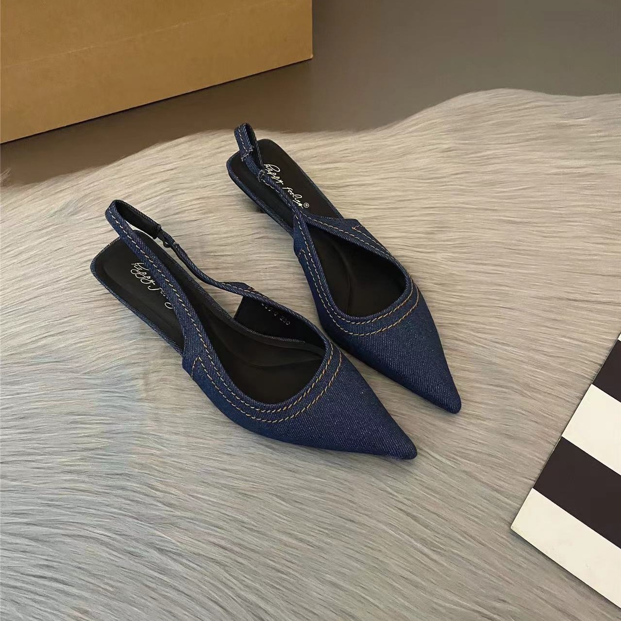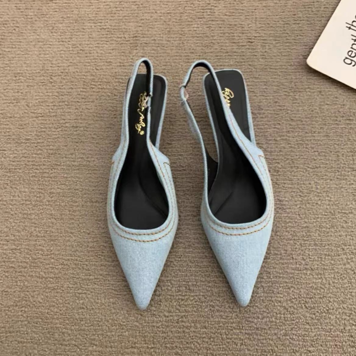 2025 봄 신상 여성화 하이힐 블루 데님 캣힐 포인티드 토 백 토 하이힐 샌들