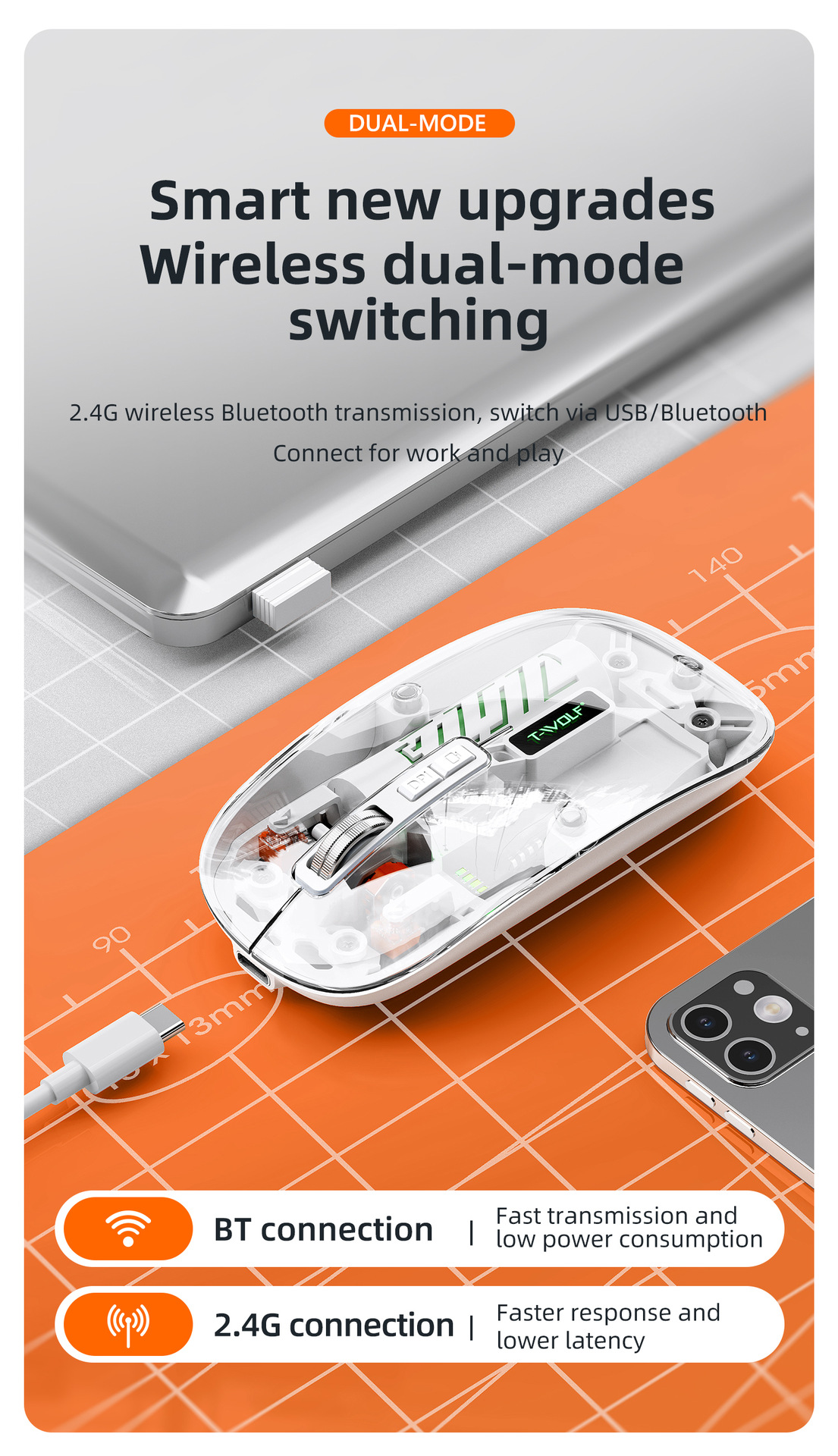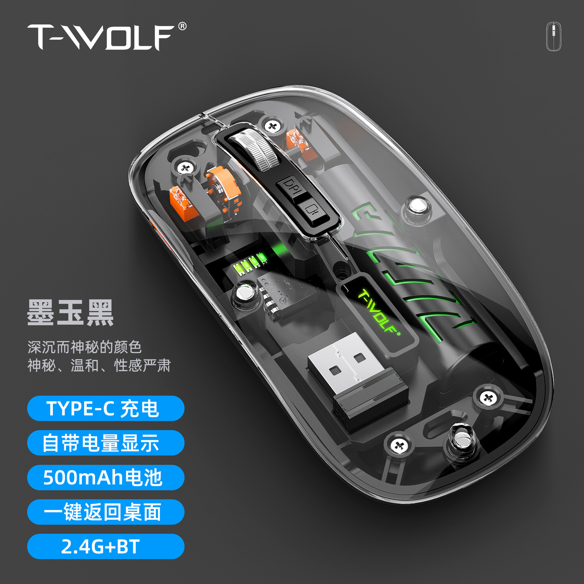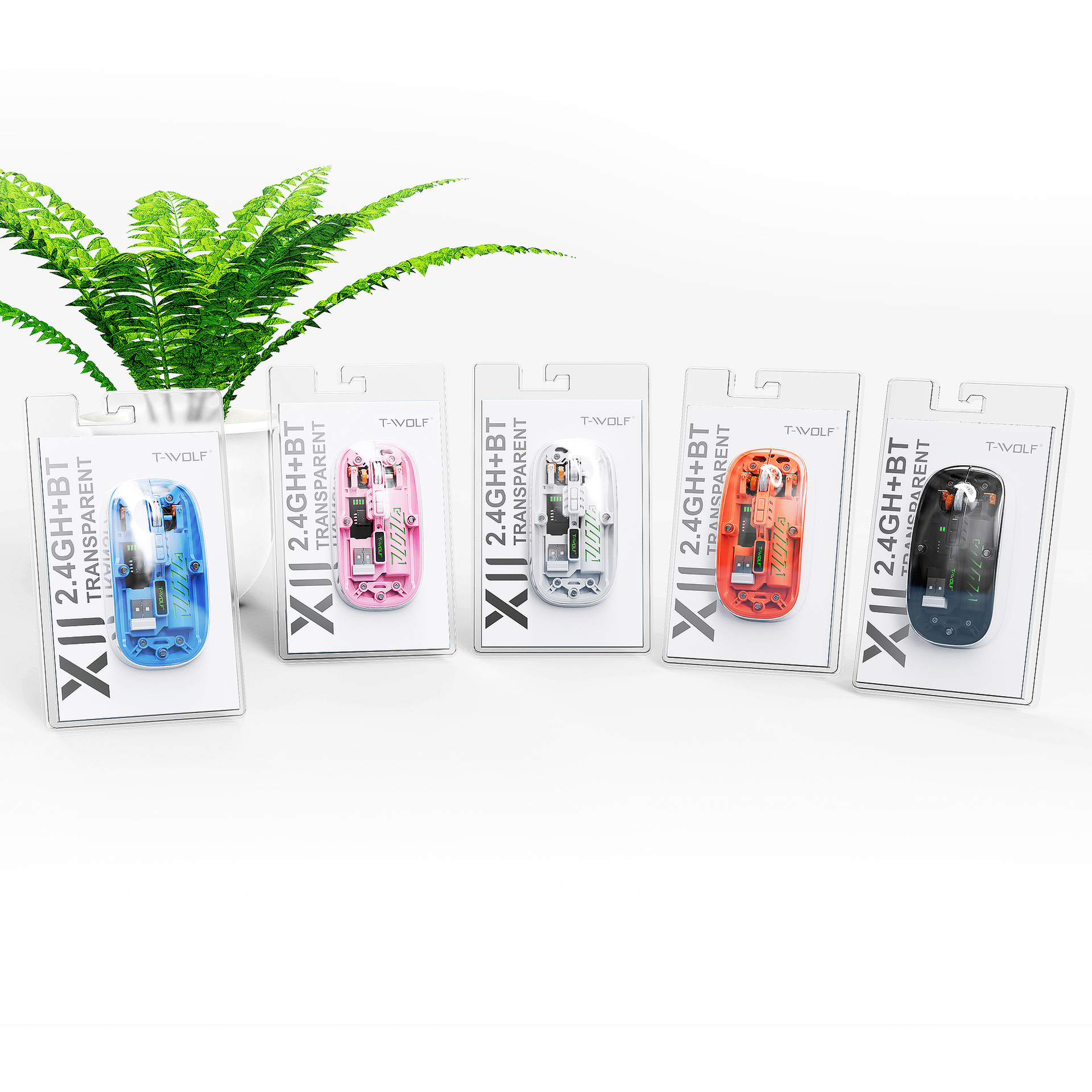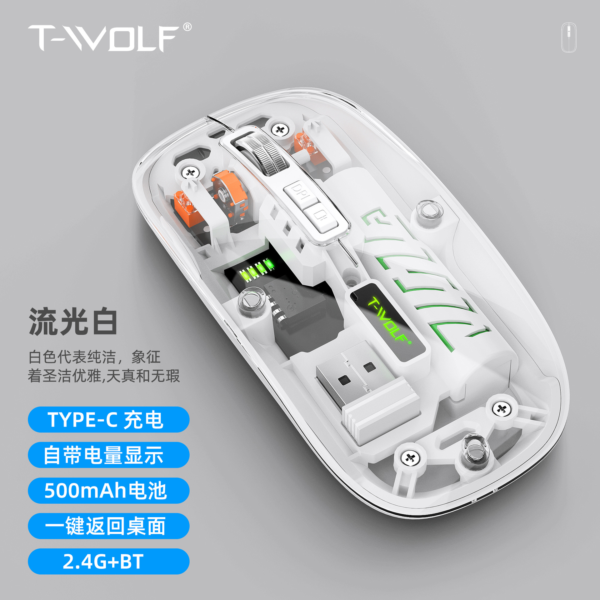 T-WOLF 레이울프 X11 투명 무선 마우스 충전식 전력 표시 발광 듀얼 모드 블루투스 마우스 무소음스토어 가기