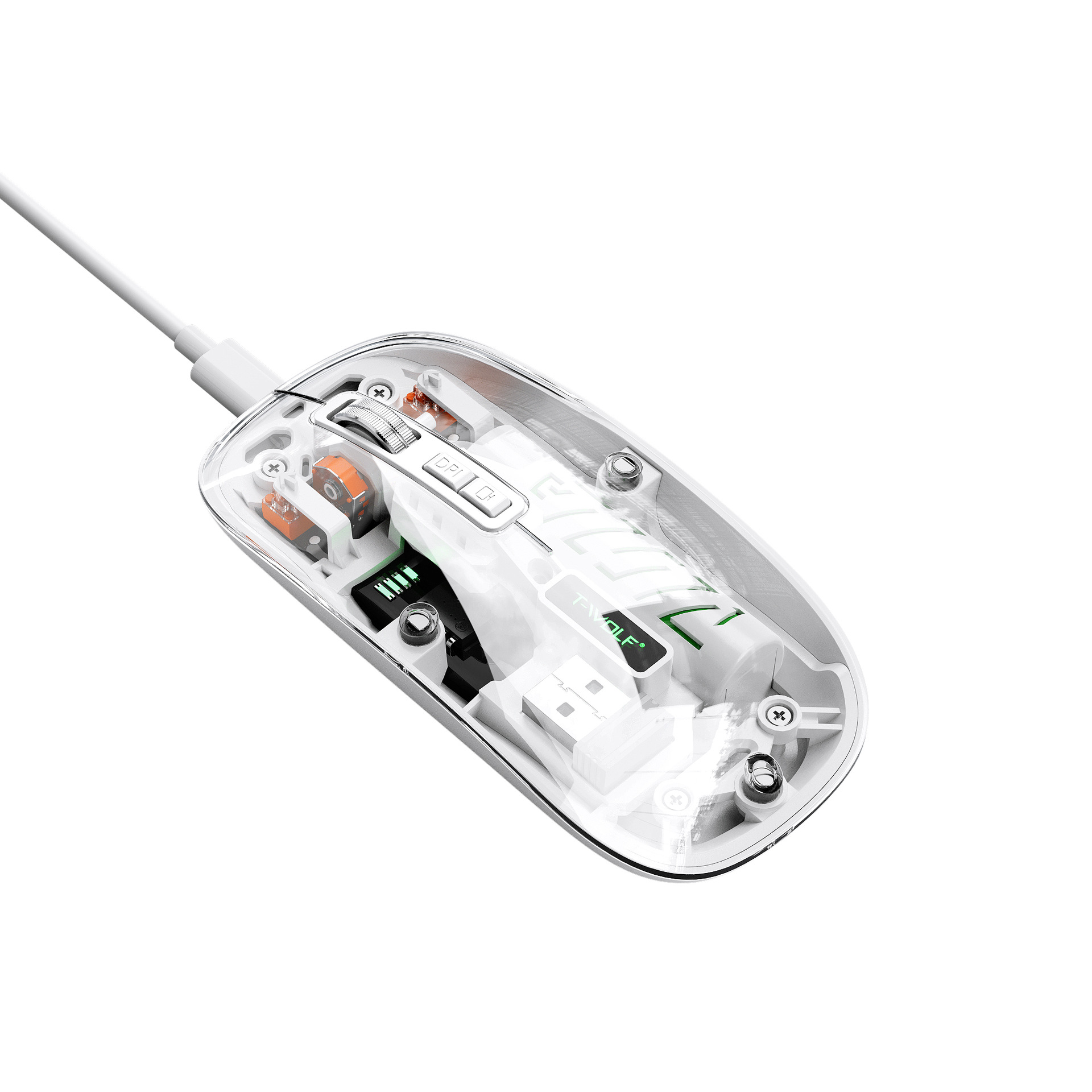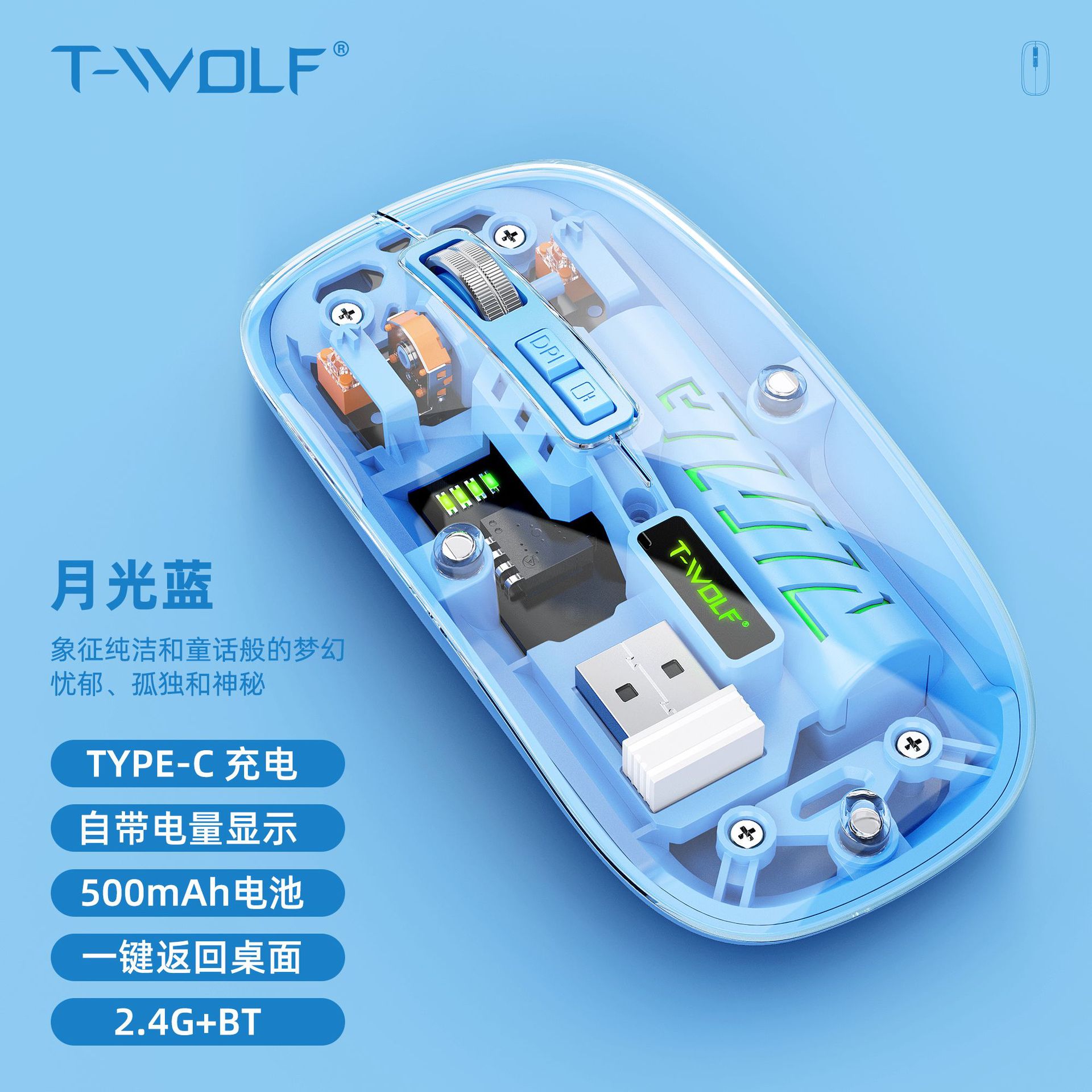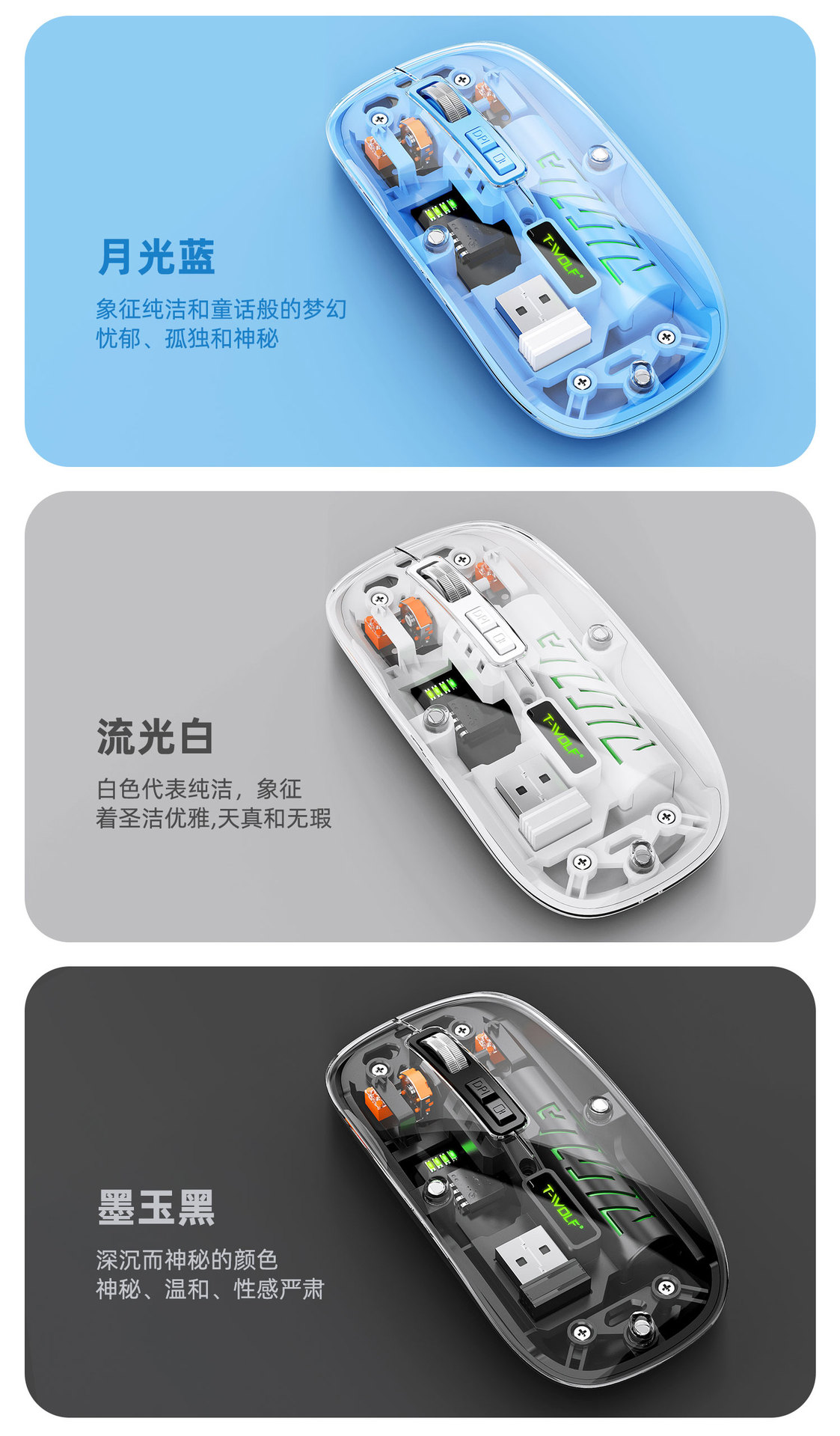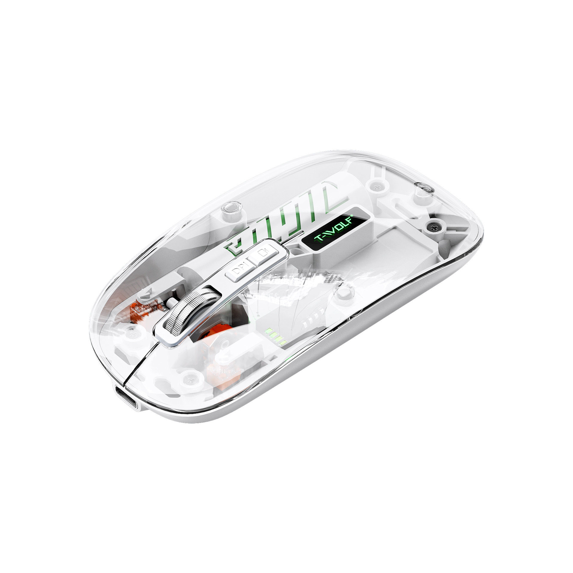 T-WOLF 레이울프 X11 투명 무선 마우스 충전식 전력 표시 발광 듀얼 모드 블루투스 마우스 무소음