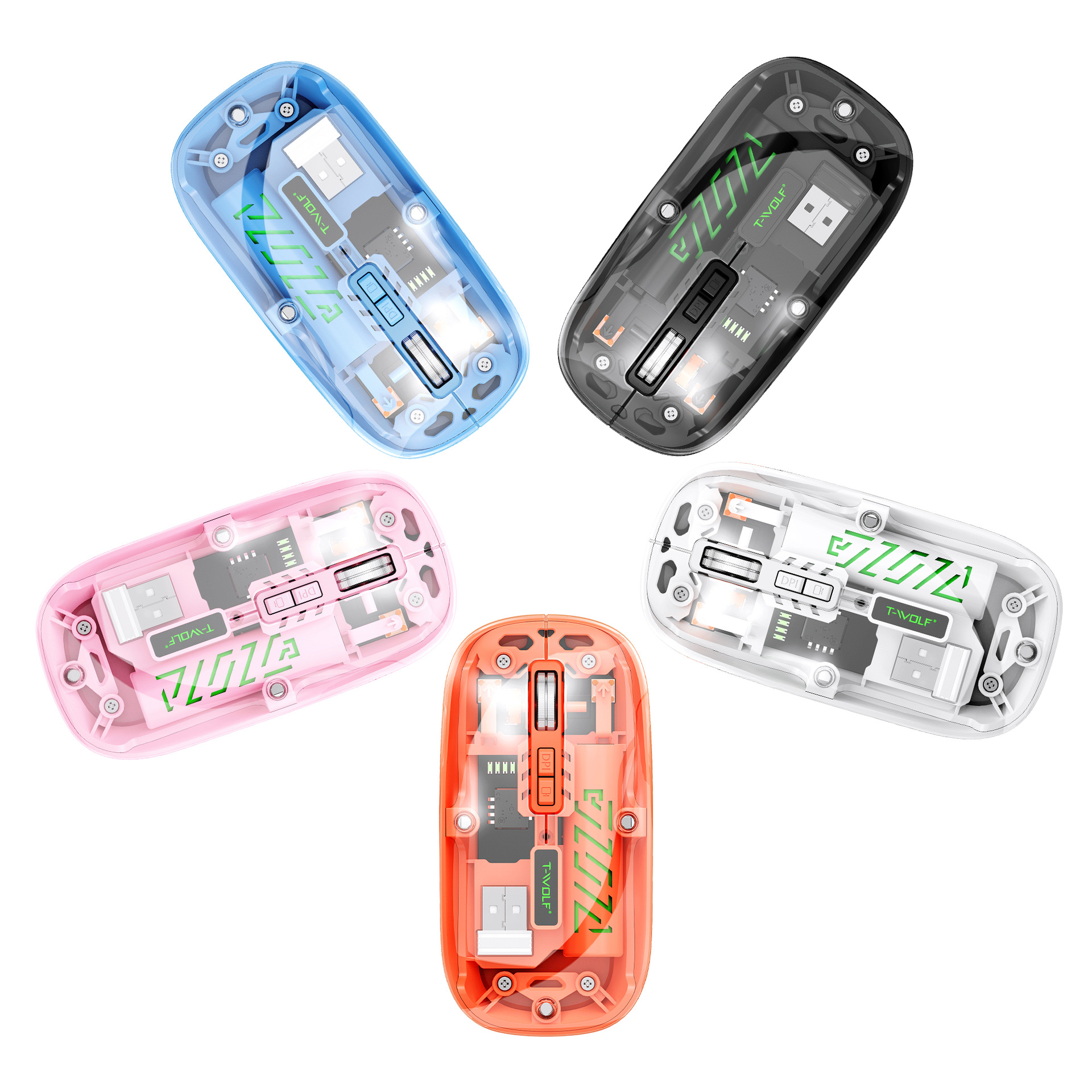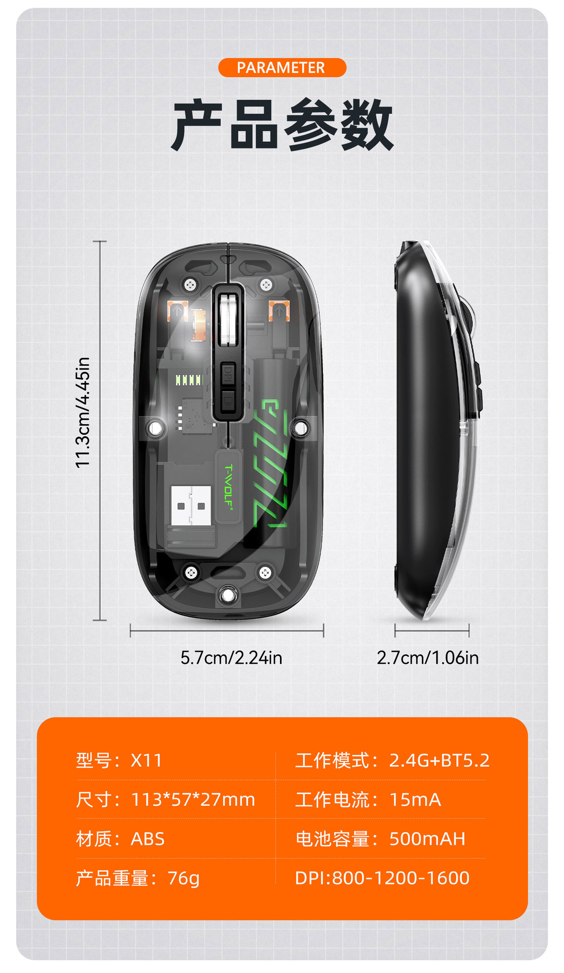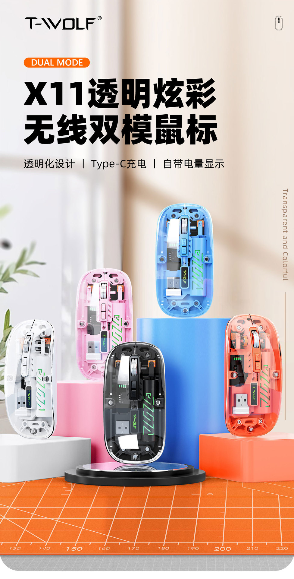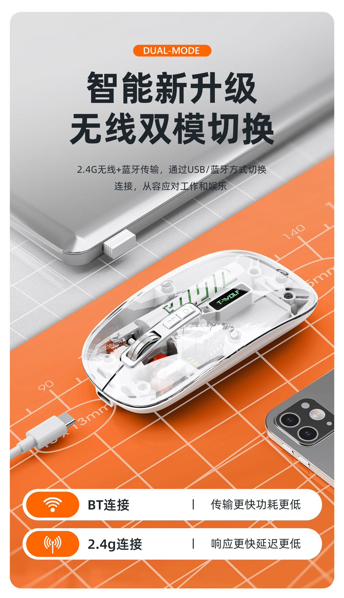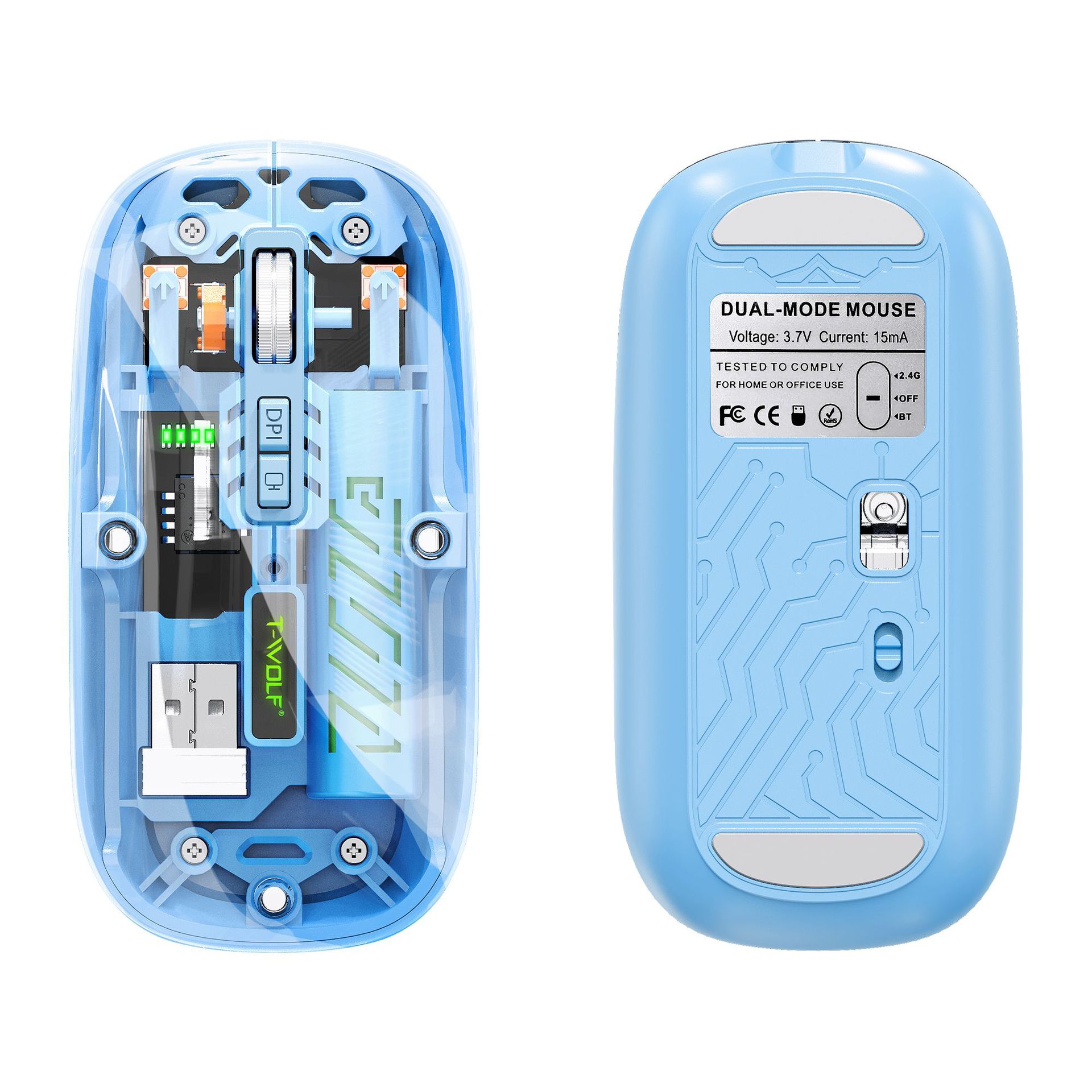 T-WOLF 레이울프 X11 투명 무선 마우스 충전식 전력 표시 발광 듀얼 모드 블루투스 마우스 무소음