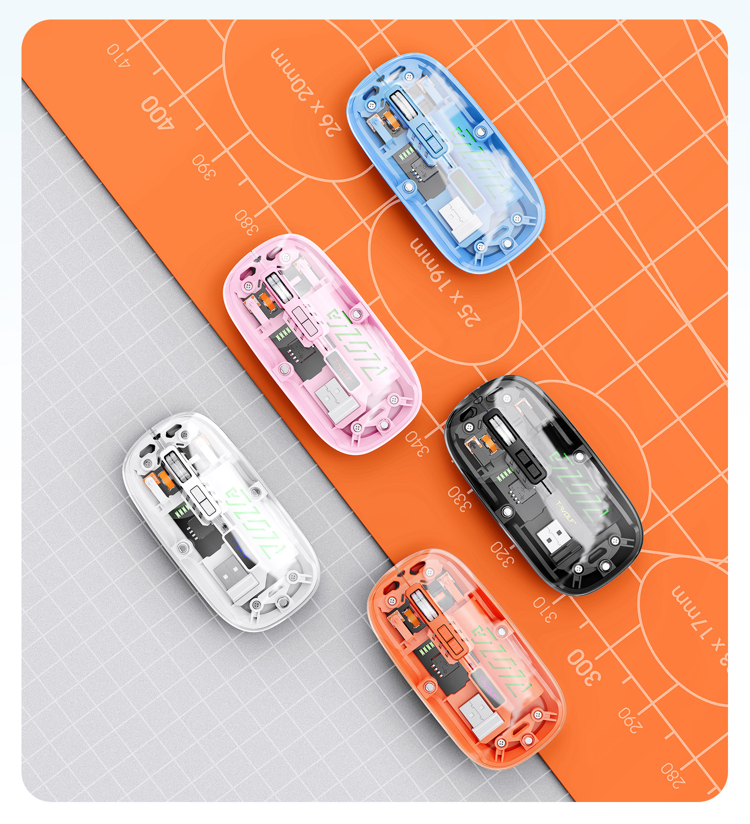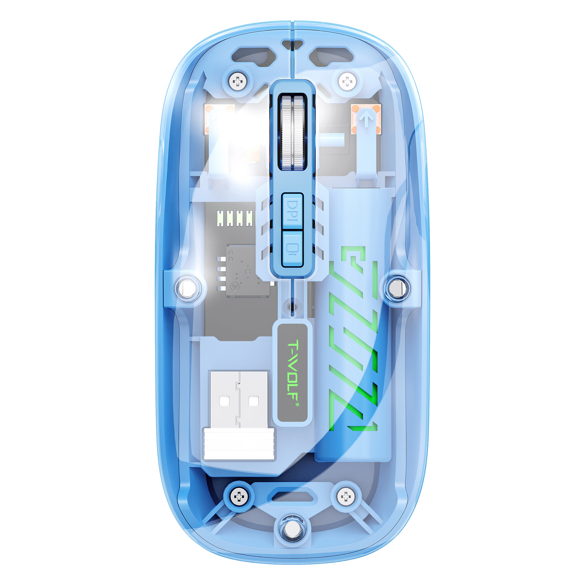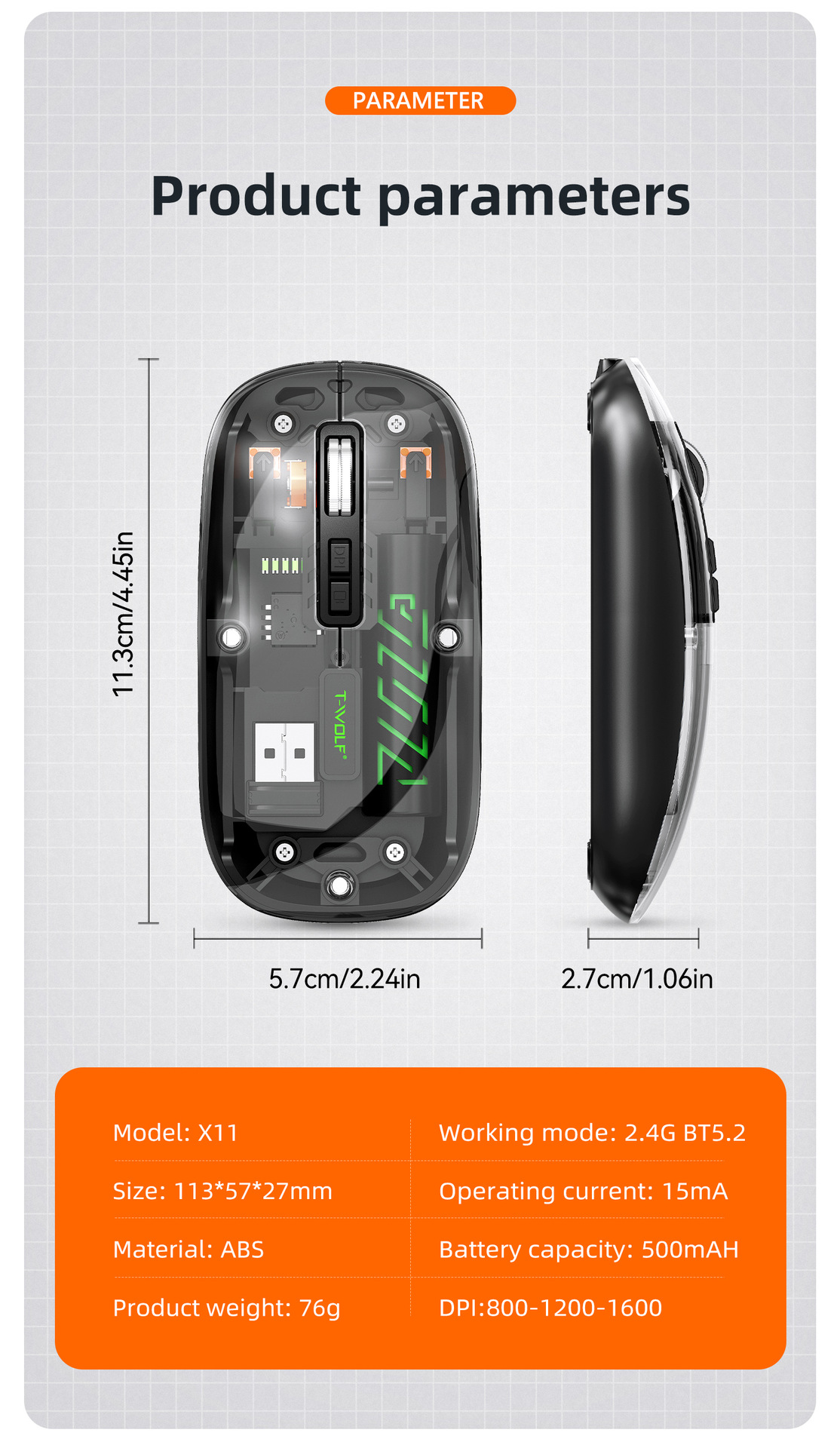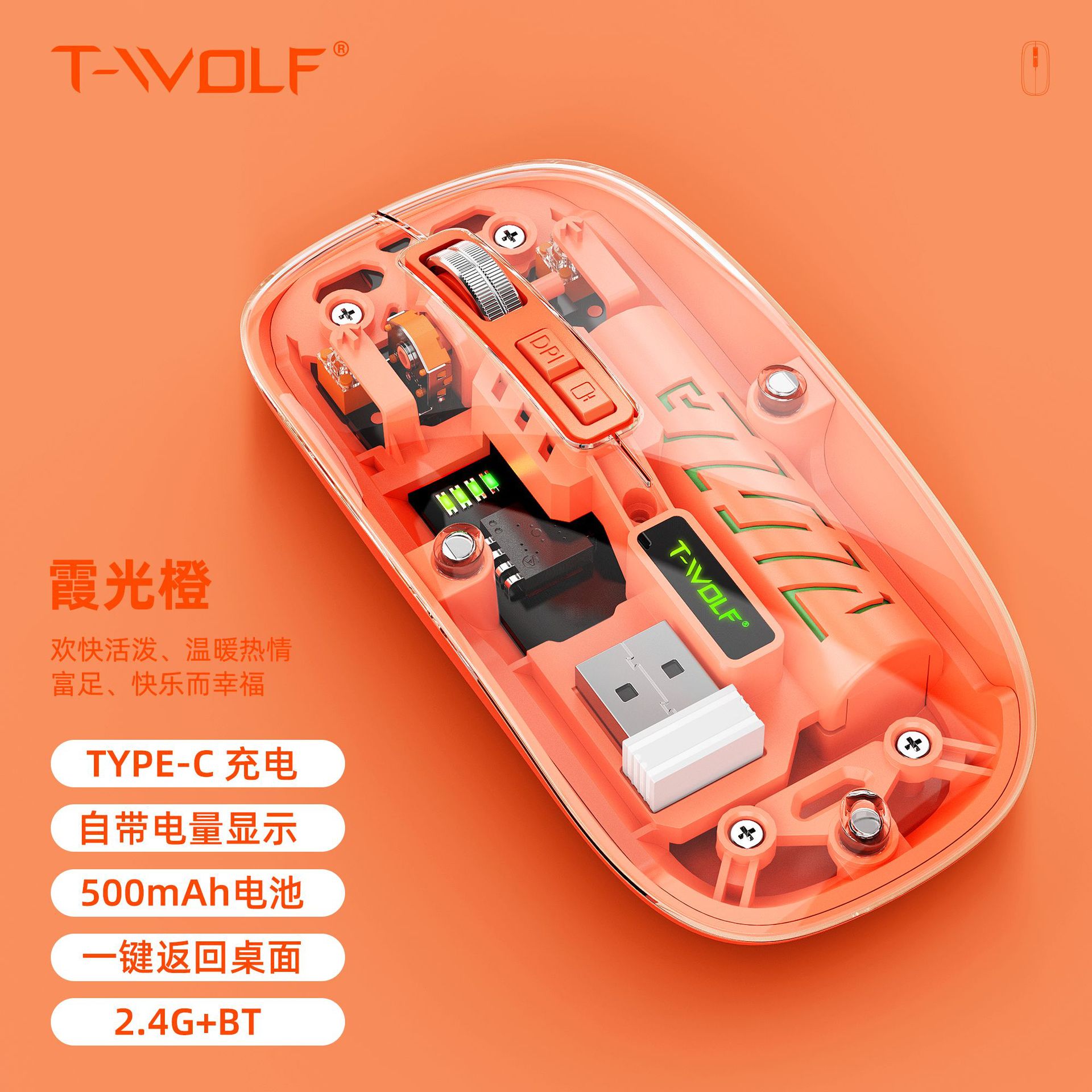 T-WOLF 레이울프 X11 투명 무선 마우스 충전식 전력 표시 발광 듀얼 모드 블루투스 마우스 무소음