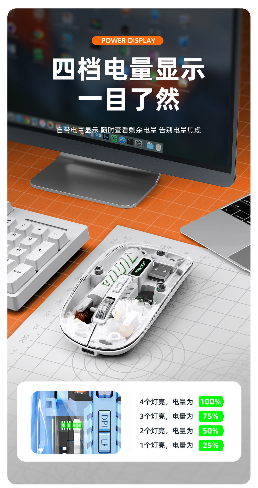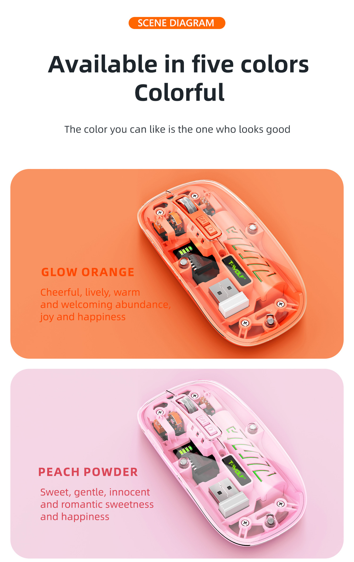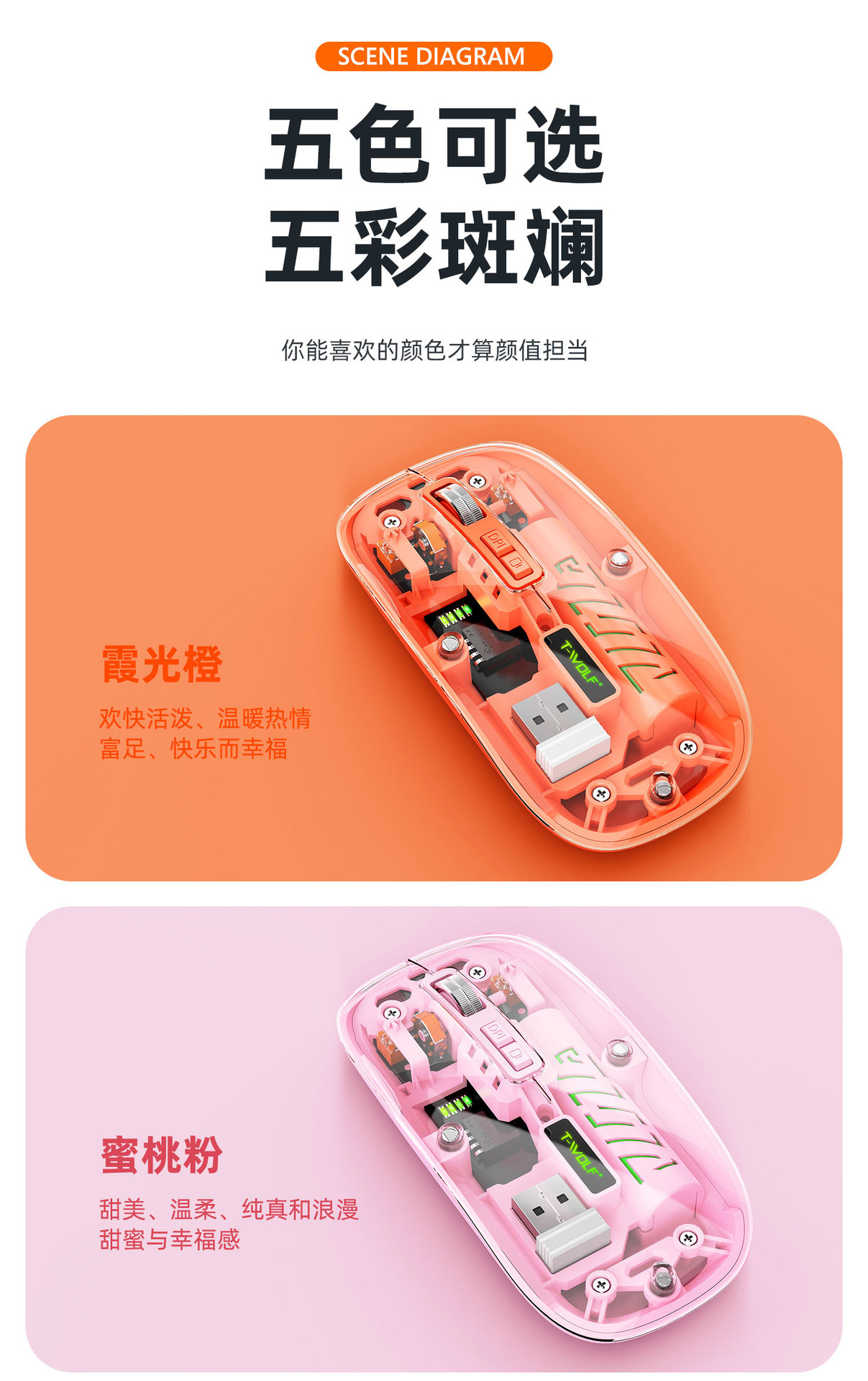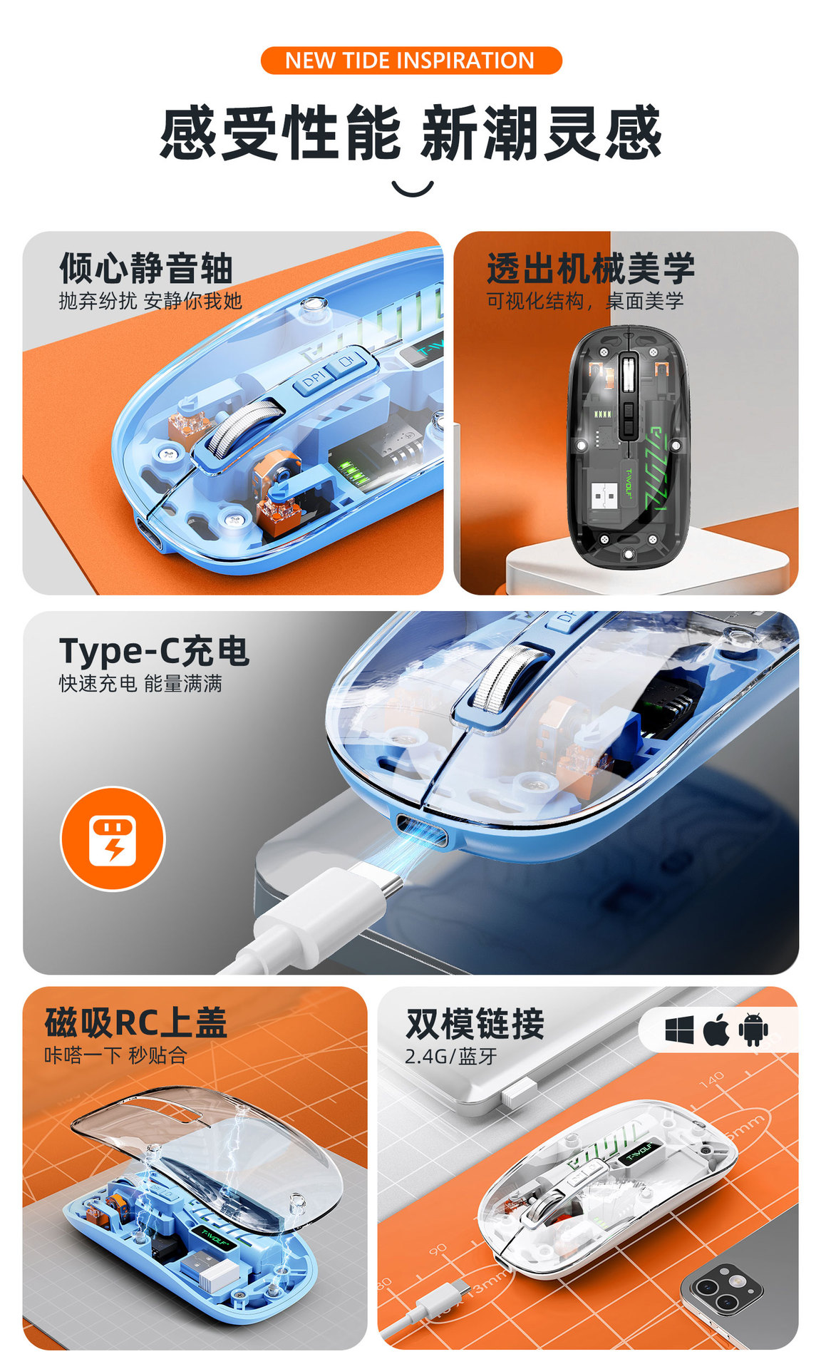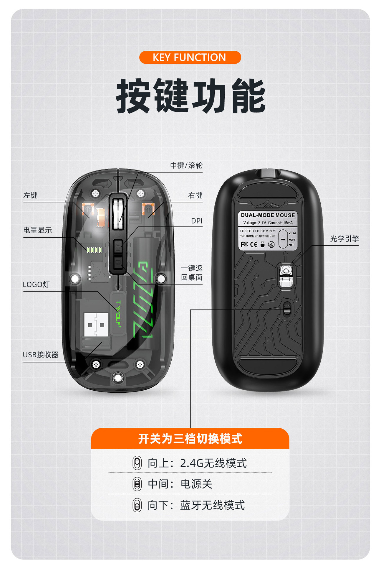 T-WOLF 레이울프 X11 투명 무선 마우스 충전식 전력 표시 발광 듀얼 모드 블루투스 마우스 무소음