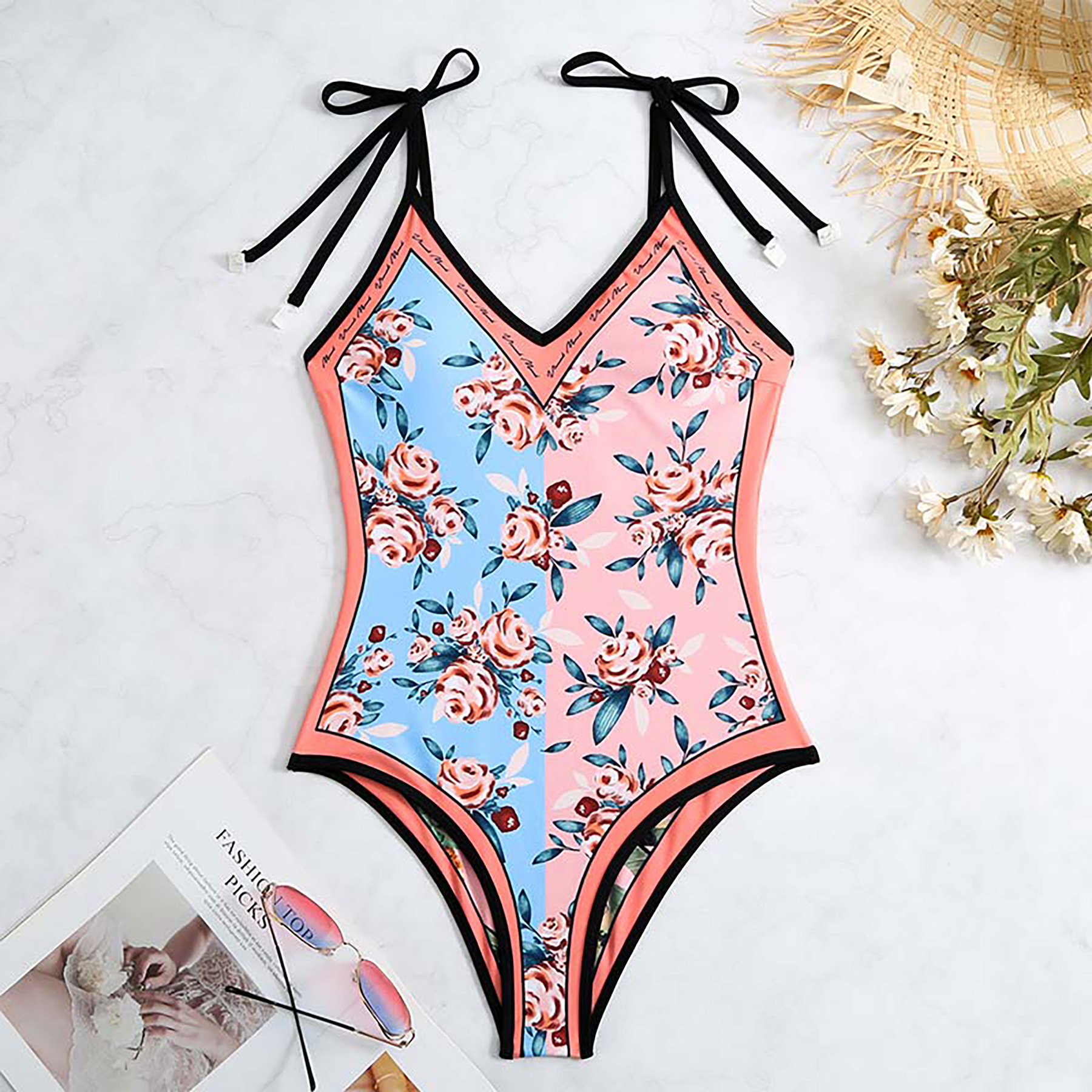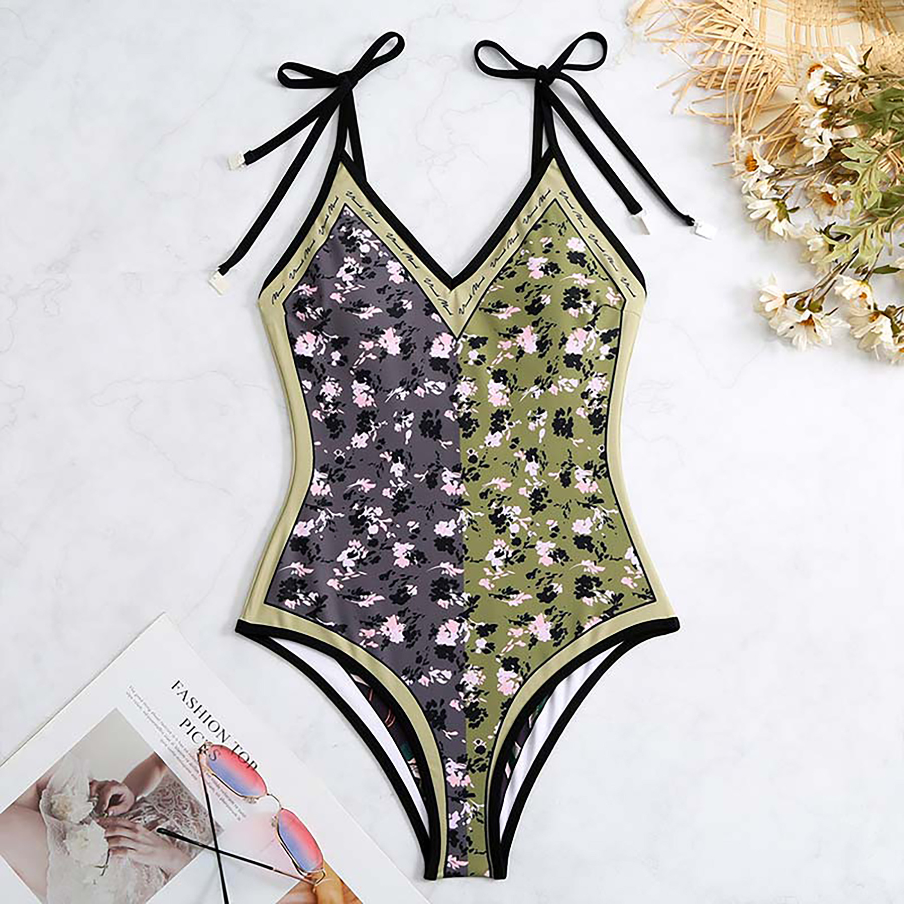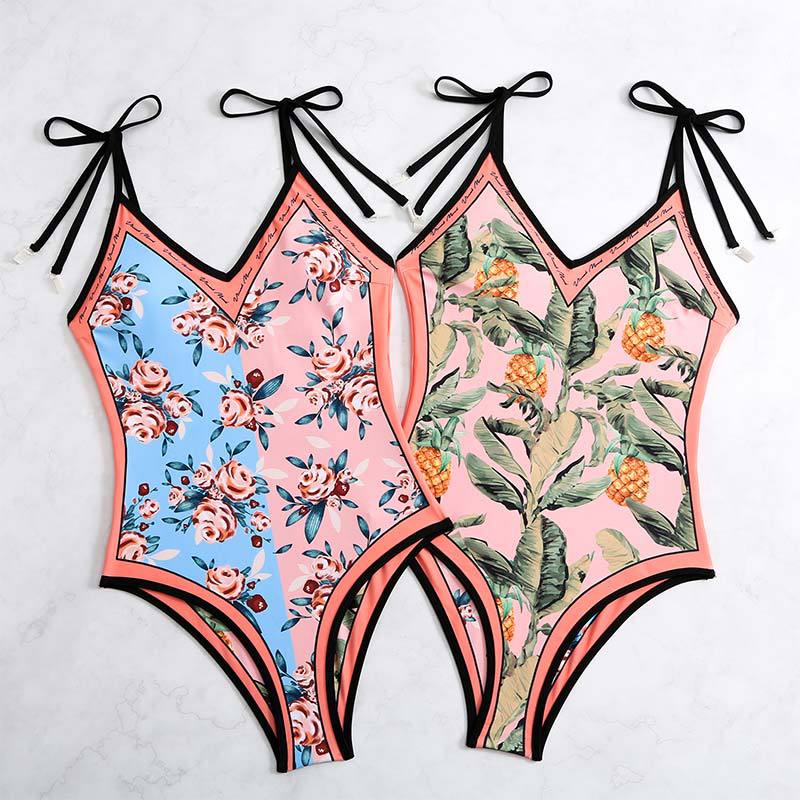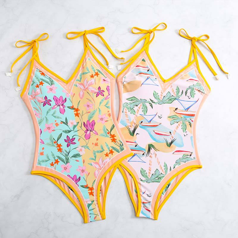 2025 유럽과 미국의 새로운 원피스 양면 수영복 여성용 꽉 슬리밍 복고풍 대외 무역 스트랩 프린트 수영복 여성용