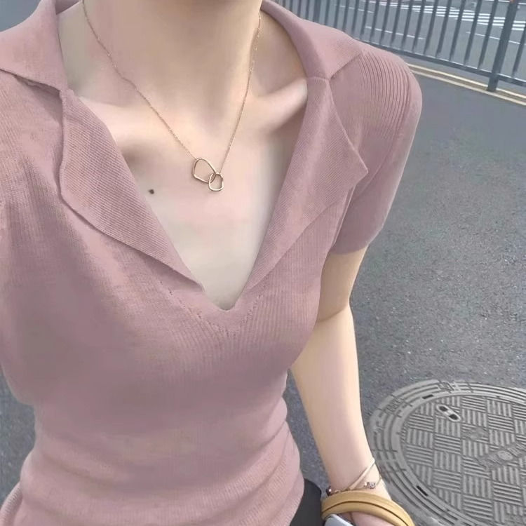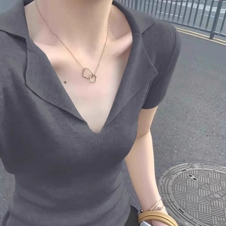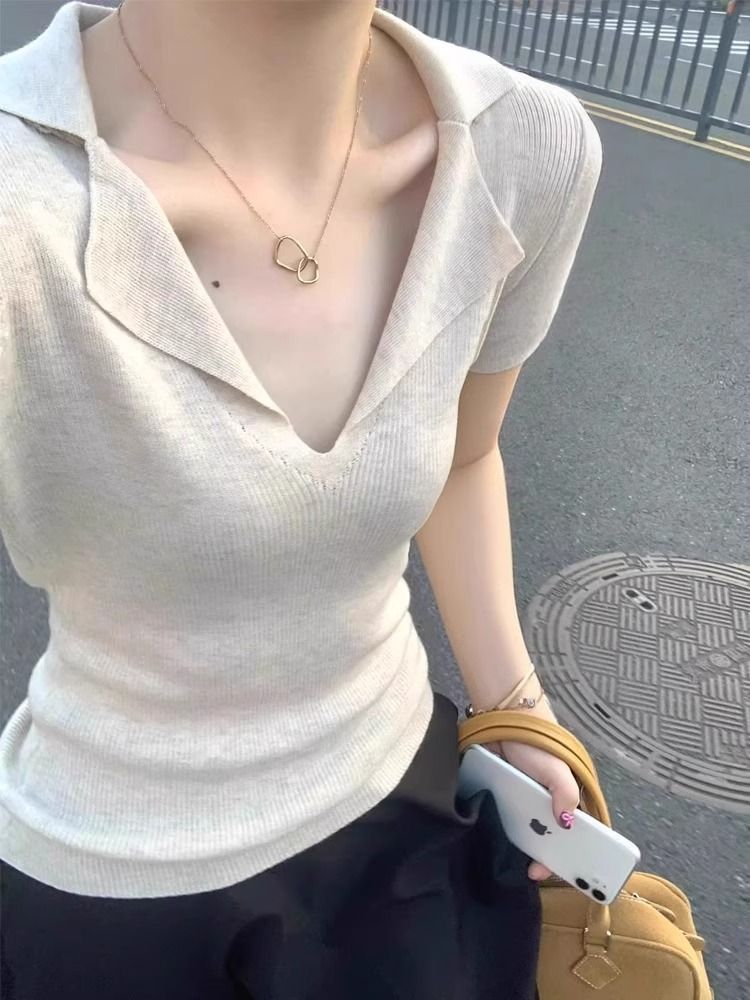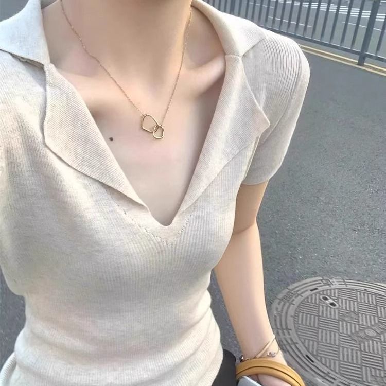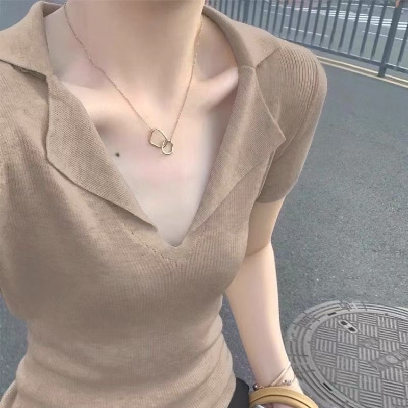 프렌치 스타일 V넥 올드머니 스타일 반팔 여성용 슬림핏 티셔츠 2026 여름 라펠 아이스 실크 니트 폴로 셔츠 탑