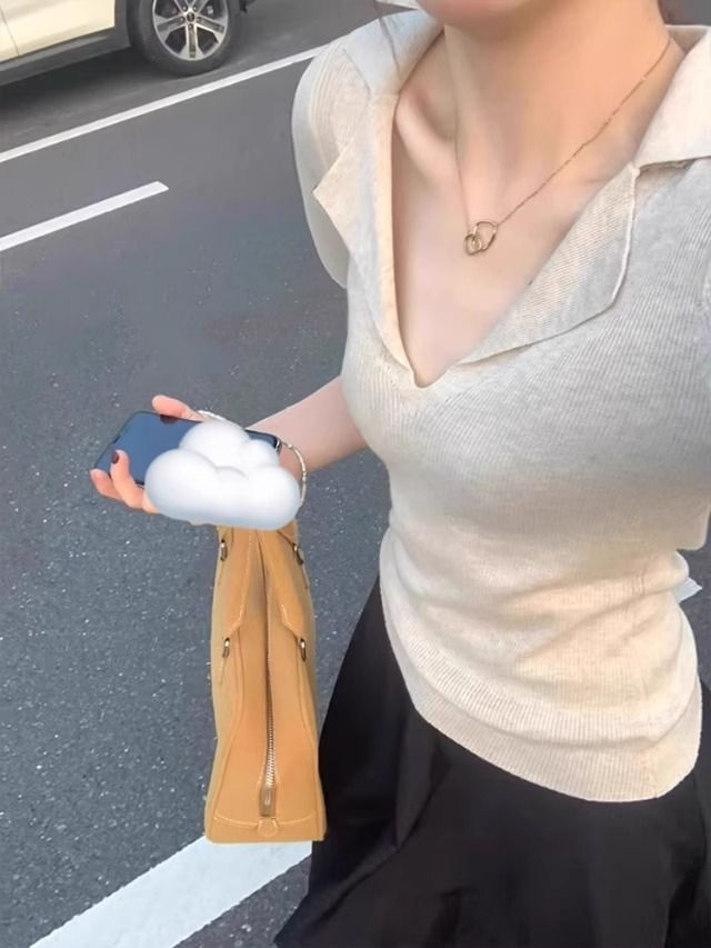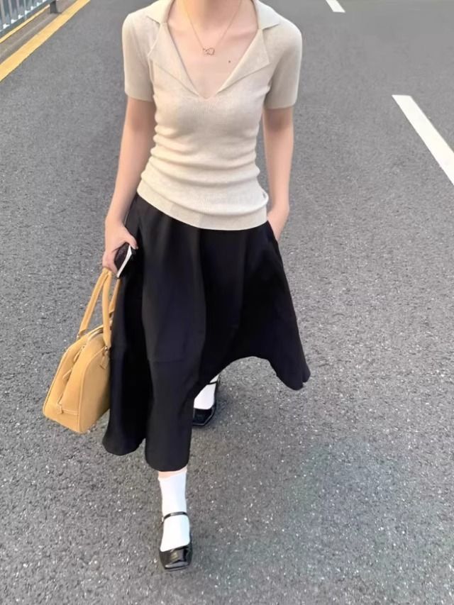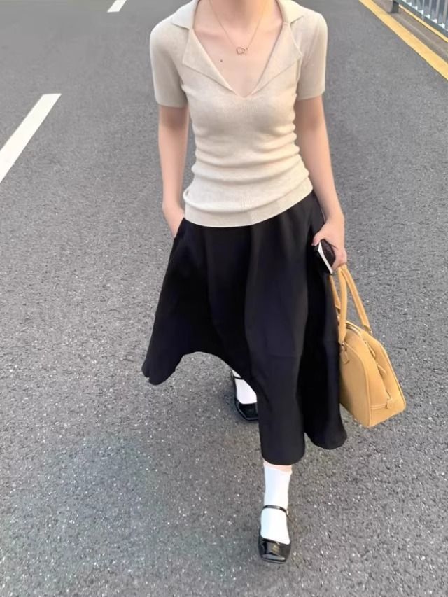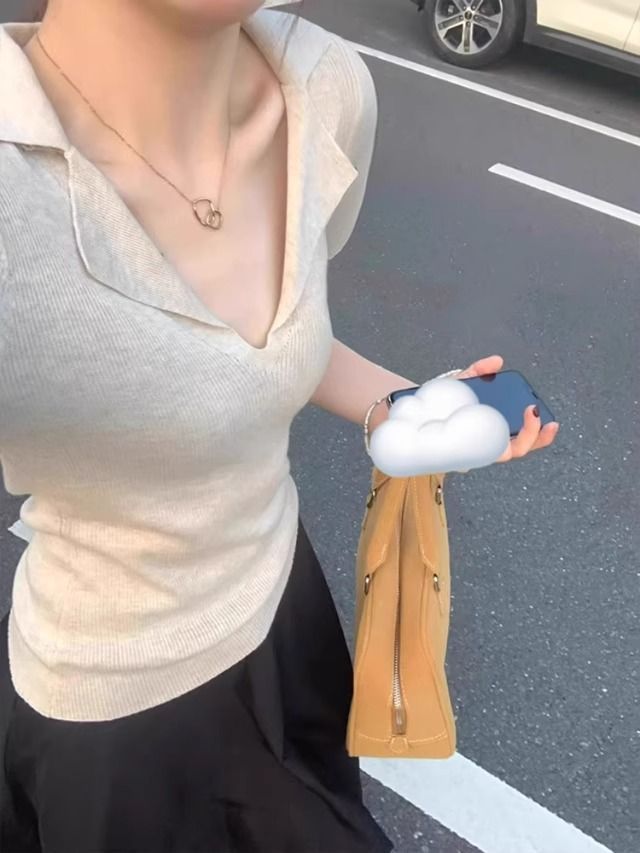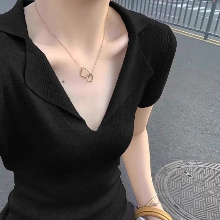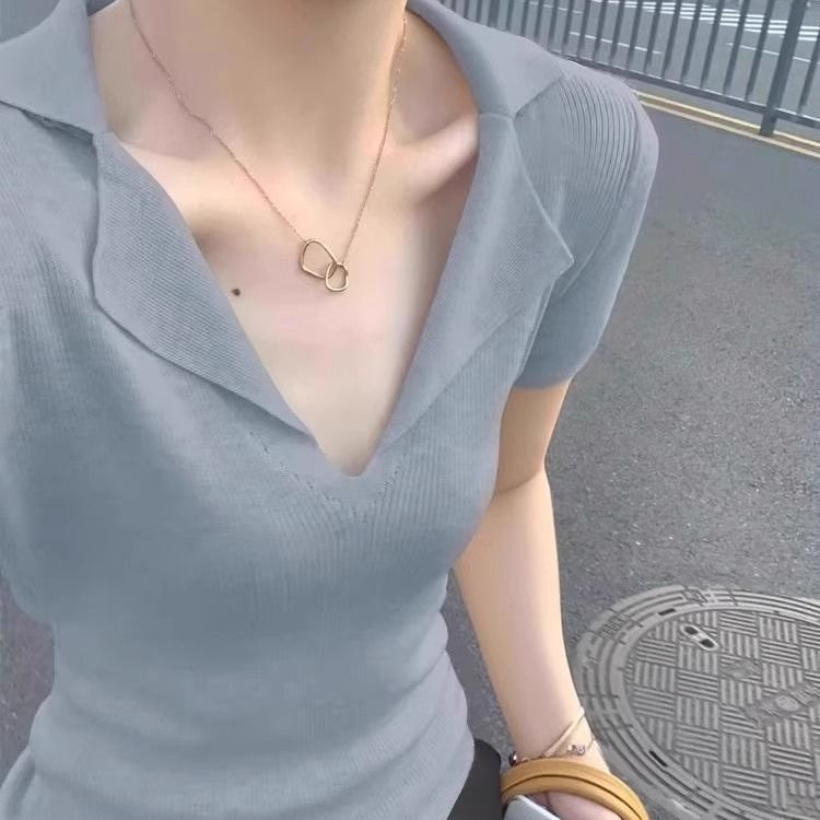 프렌치 스타일 V넥 올드머니 스타일 반팔 여성용 슬림핏 티셔츠 2026 여름 라펠 아이스 실크 니트 폴로 셔츠 탑
