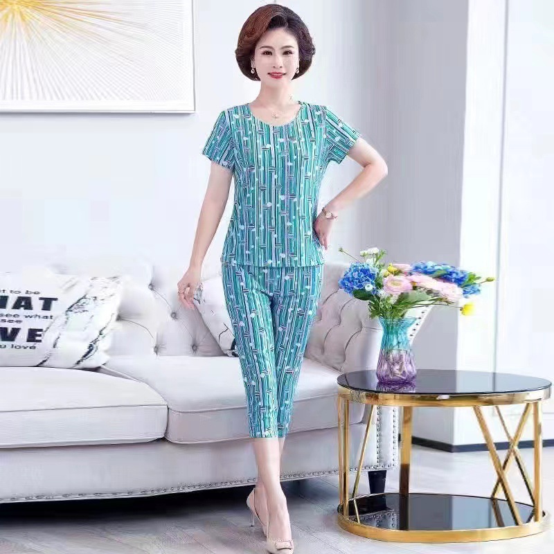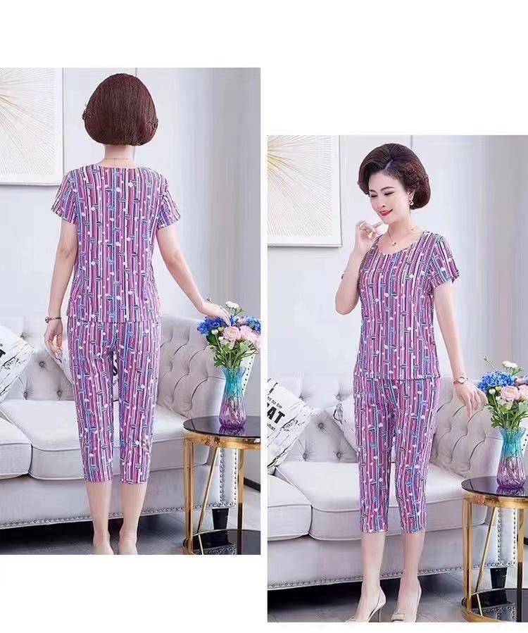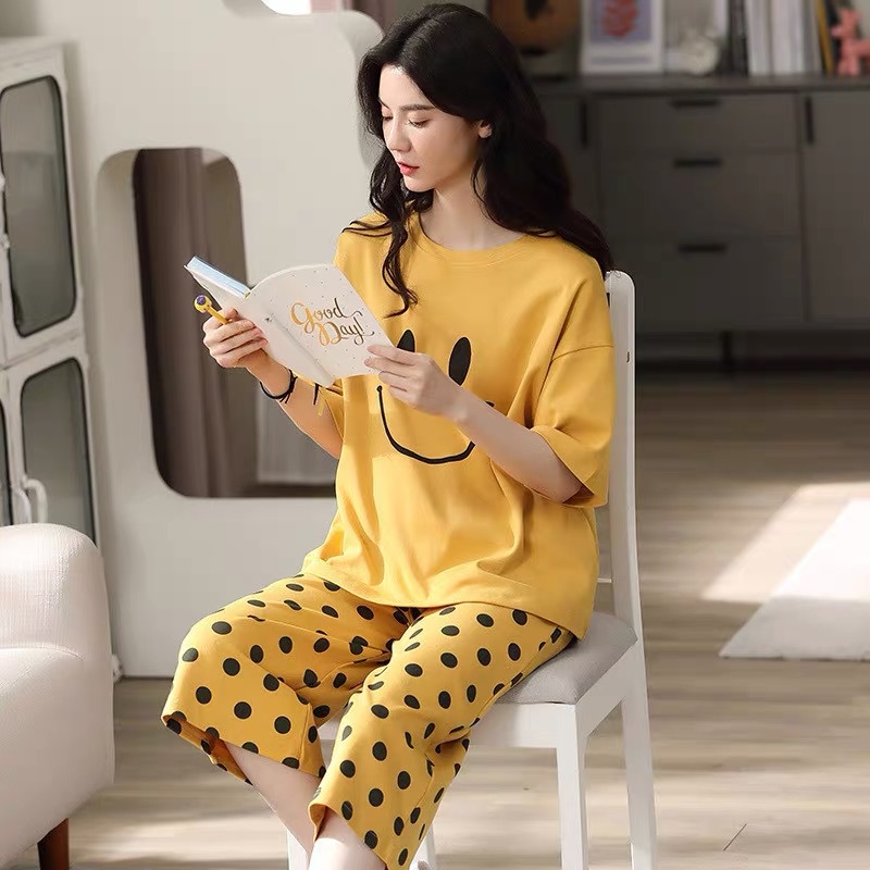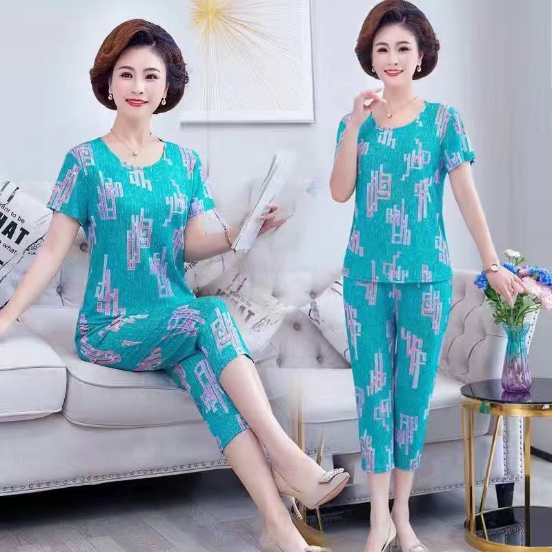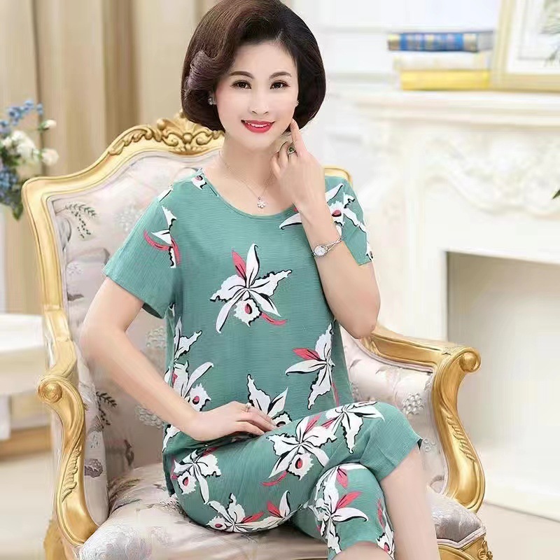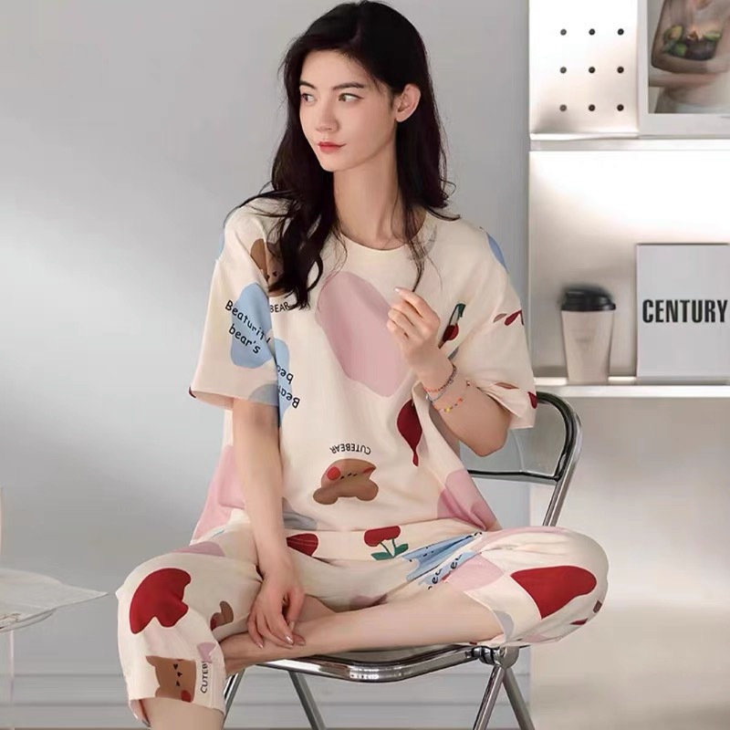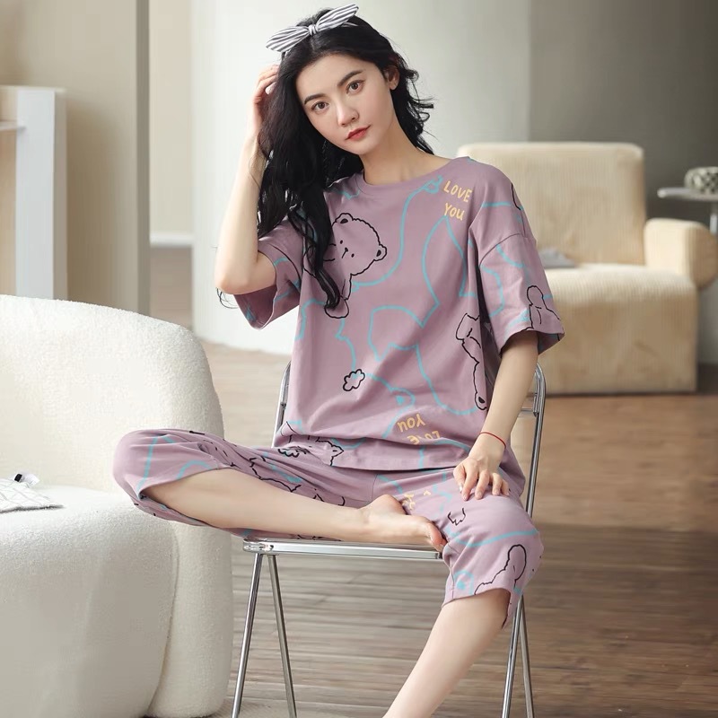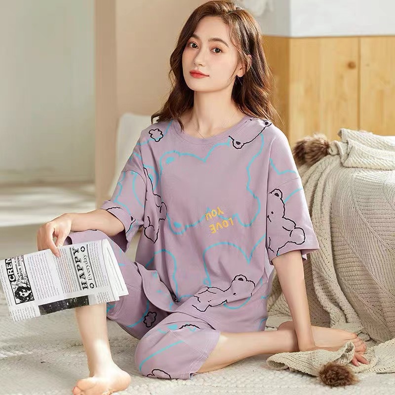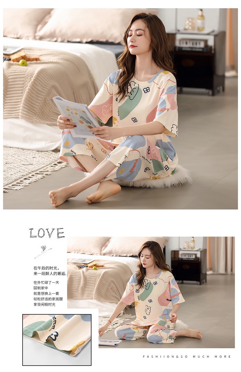 여성 여름 새 스타일 잠옷 반팔 크롭 바지 모조 면화 귀여운 모조 면화 숙녀는 캐주얼 홈웨어 세트 외부에 착용할 수 있습니다스토어 가기