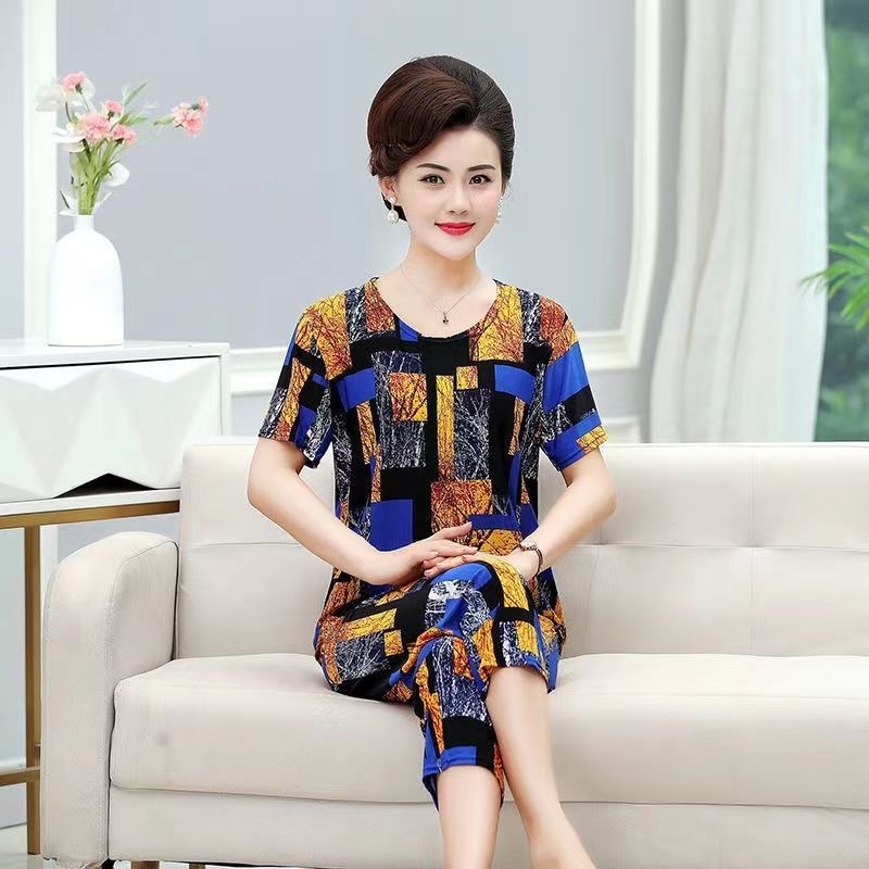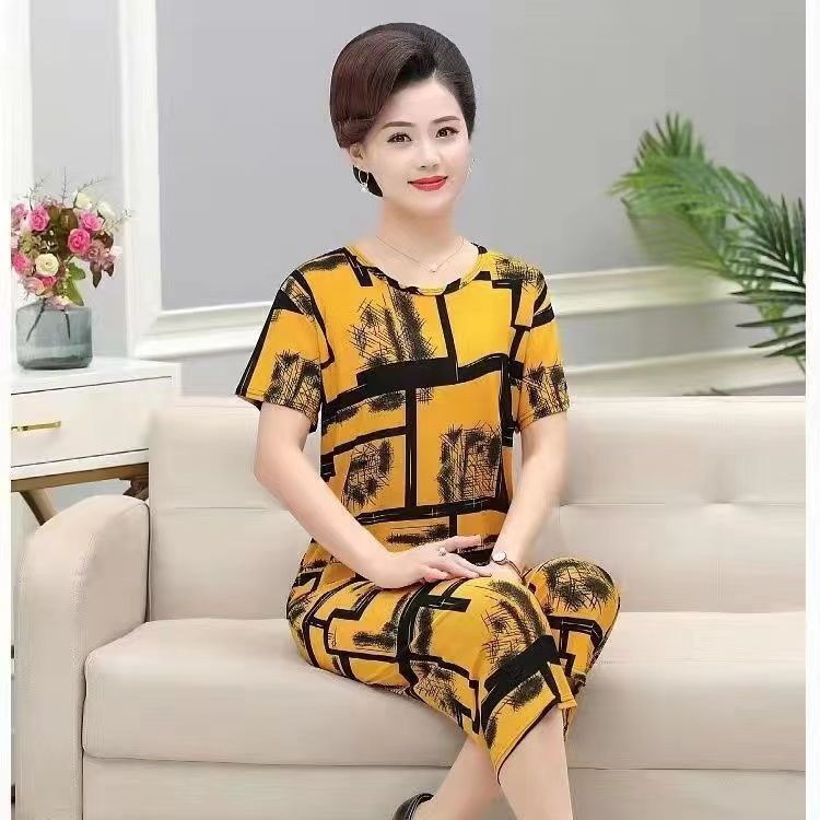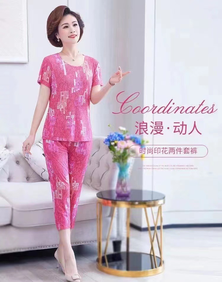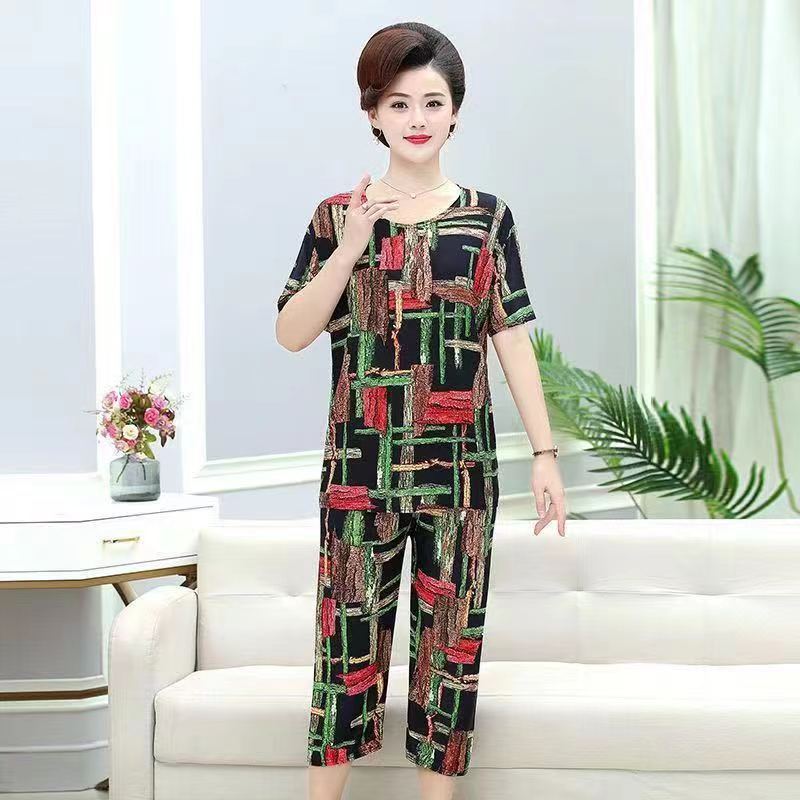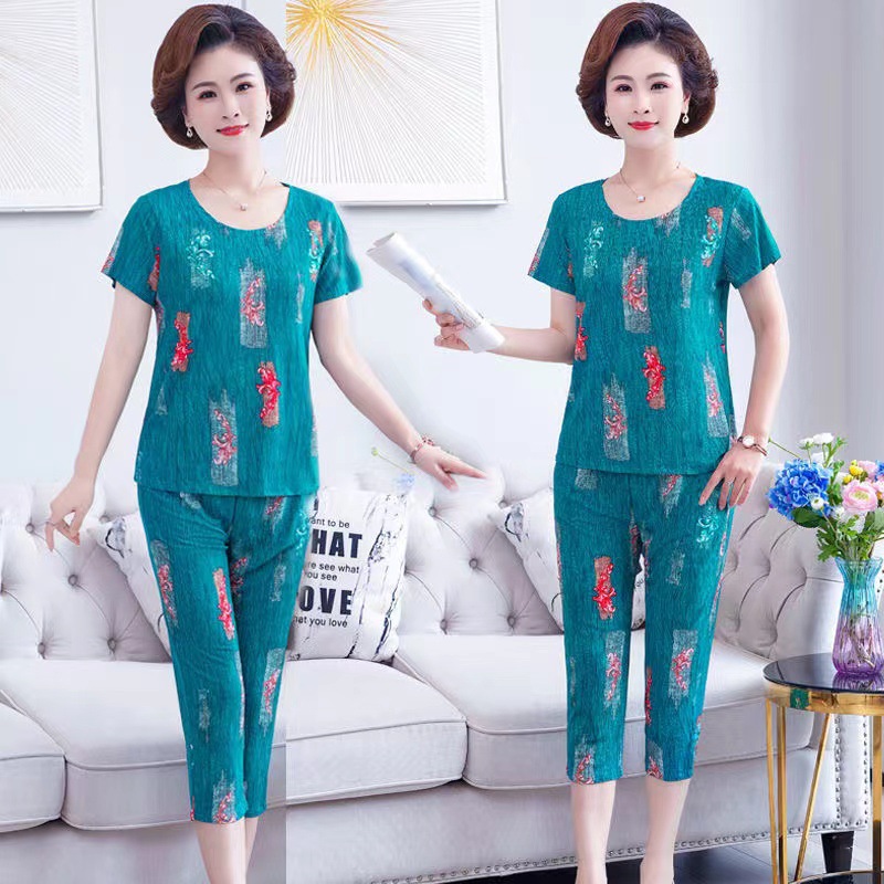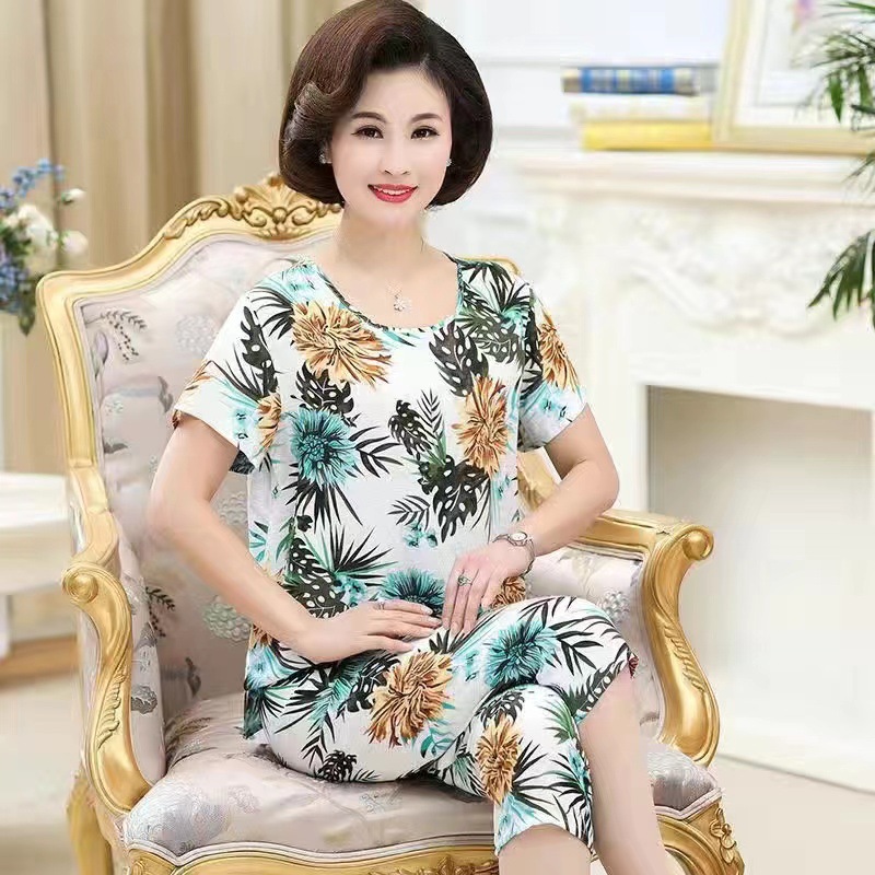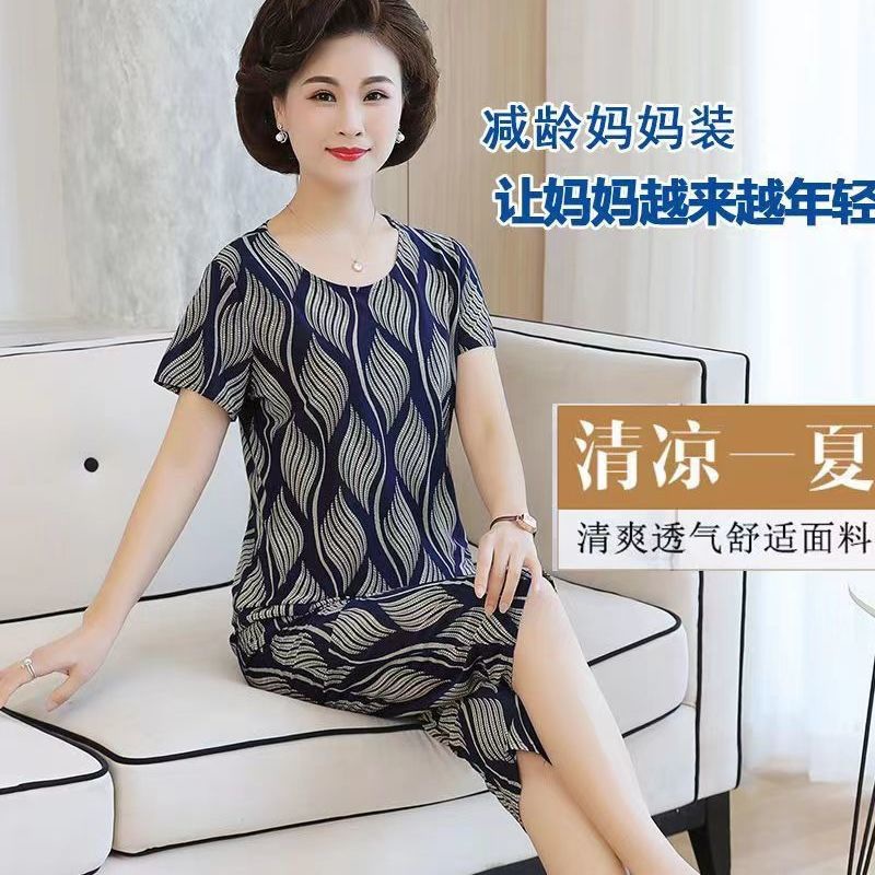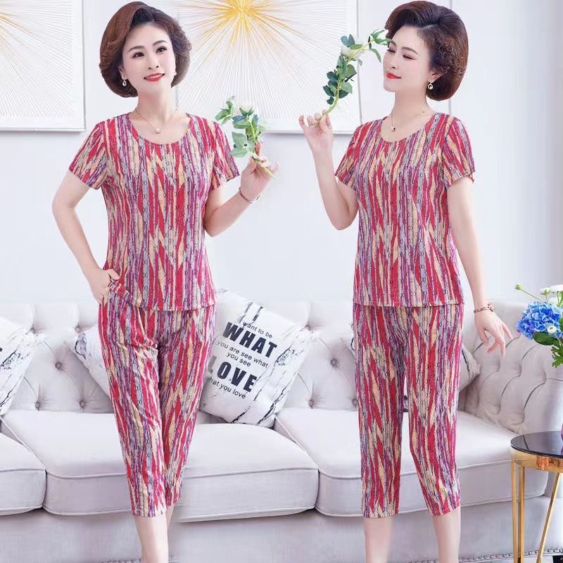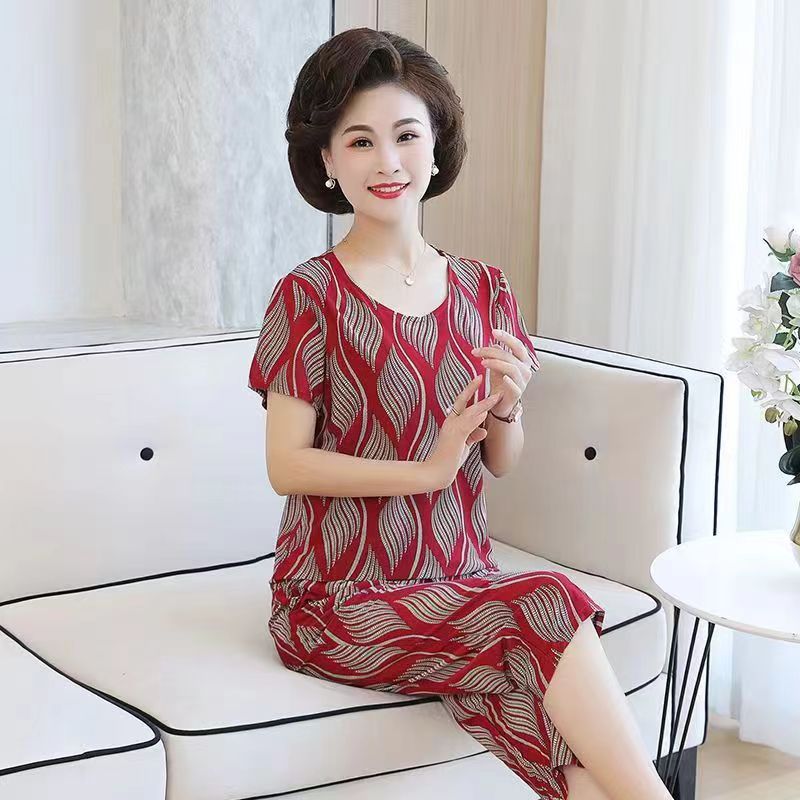 여성 여름 새 스타일 잠옷 반팔 크롭 바지 모조 면화 귀여운 모조 면화 숙녀는 캐주얼 홈웨어 세트 외부에 착용할 수 있습니다스토어 가기
