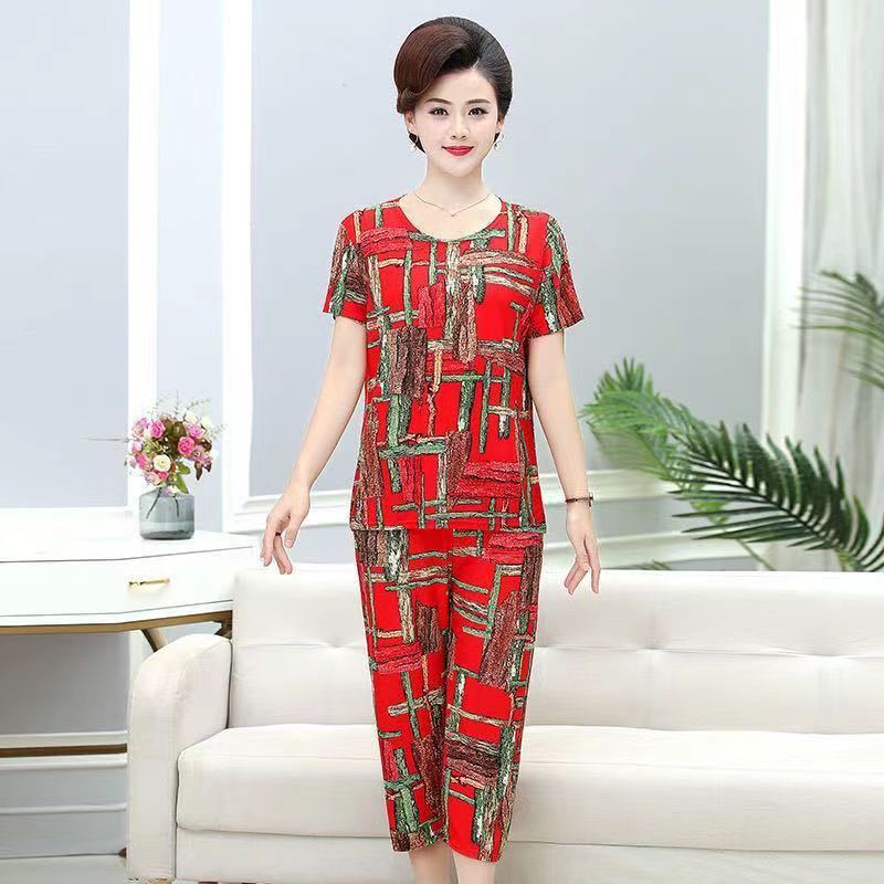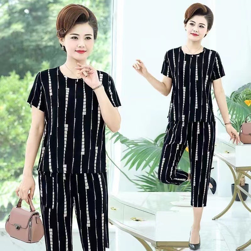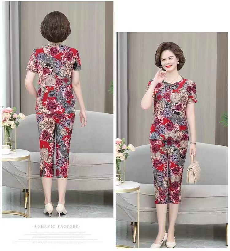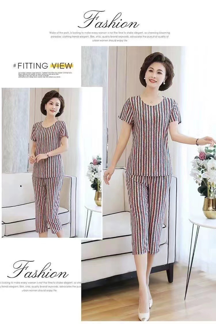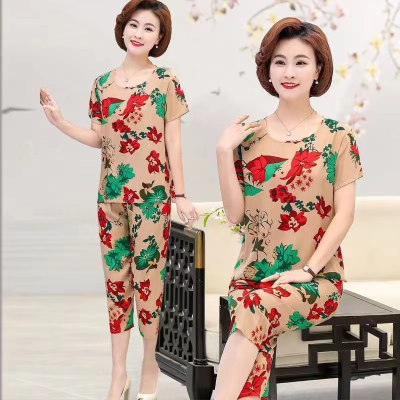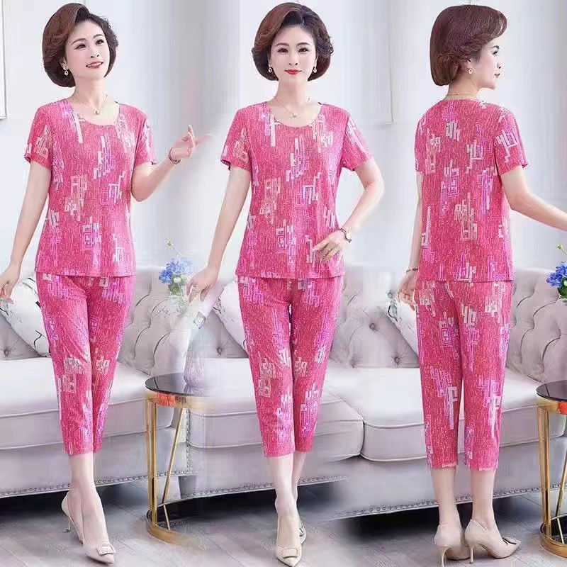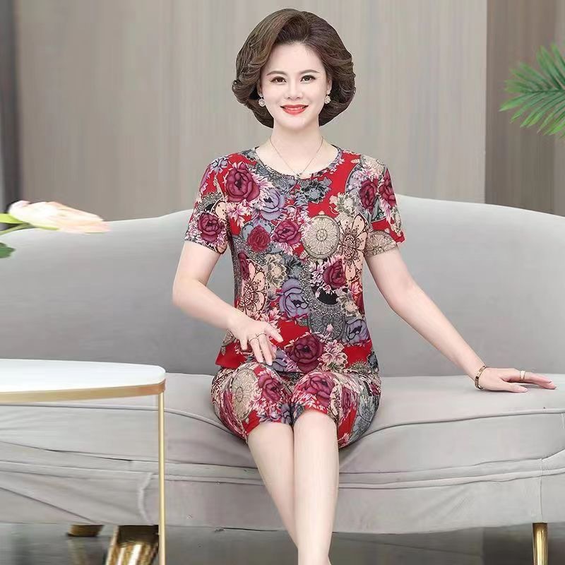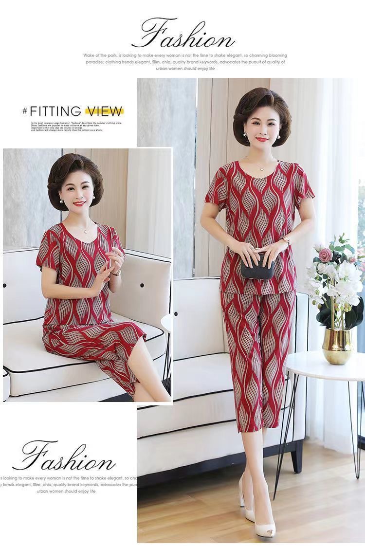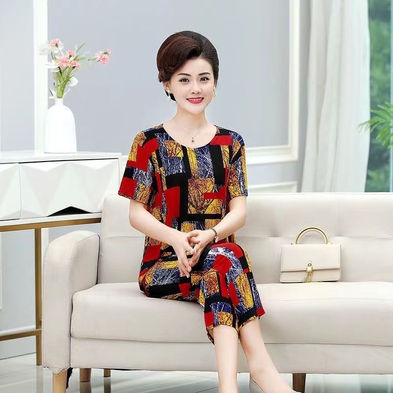여성 여름 새 스타일 잠옷 반팔 크롭 바지 모조 면화 귀여운 모조 면화 숙녀는 캐주얼 홈웨어 세트 외부에 착용할 수 있습니다스토어 가기