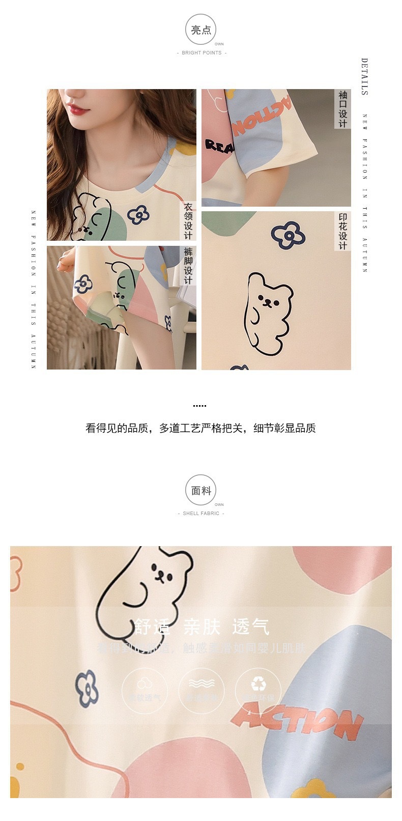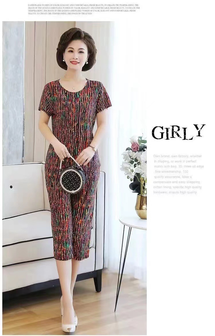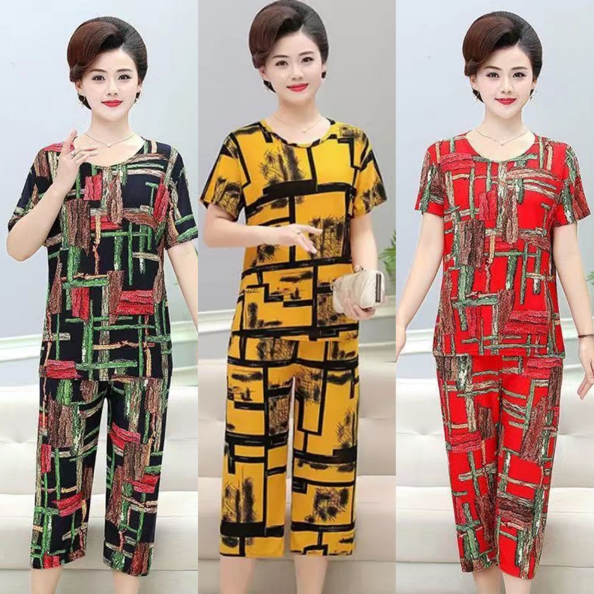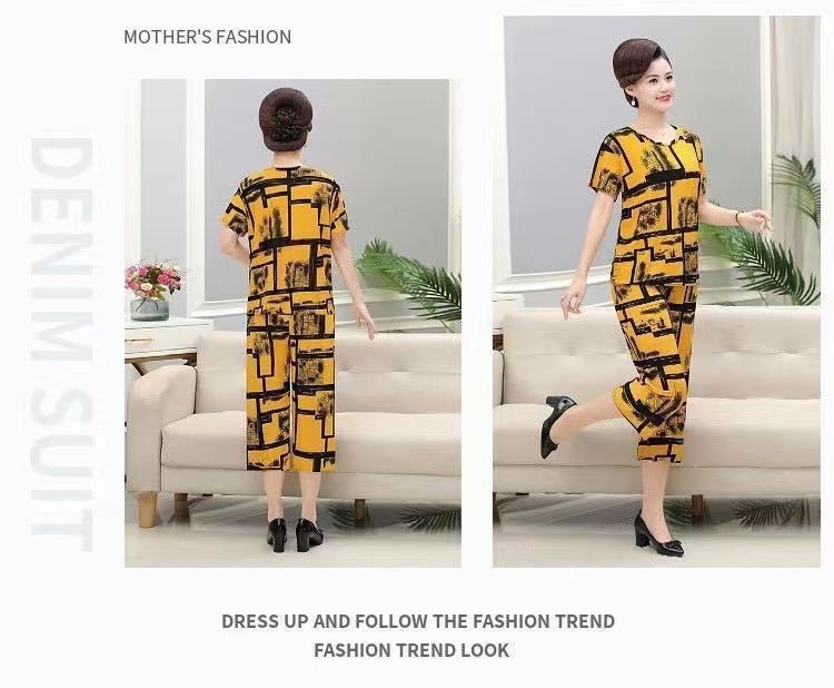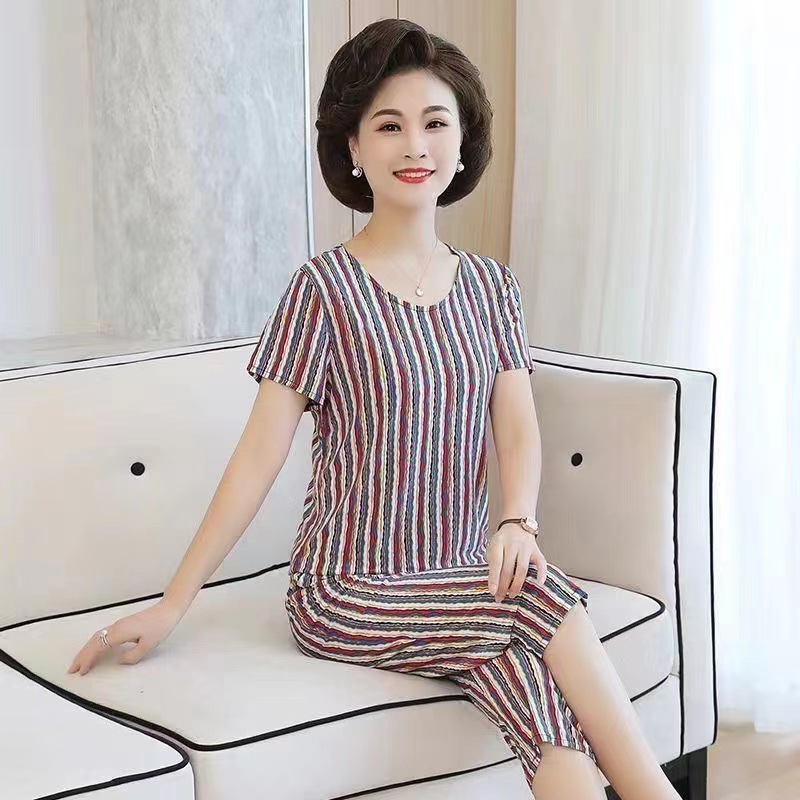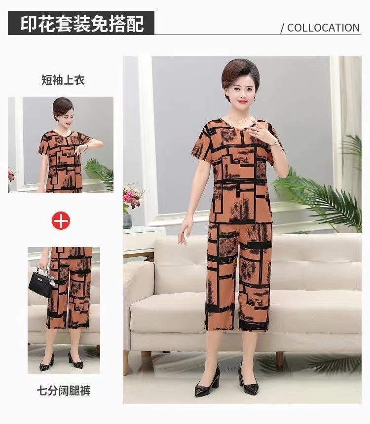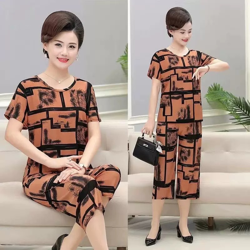 여성 여름 새 스타일 잠옷 반팔 크롭 바지 모조 면화 귀여운 모조 면화 숙녀는 캐주얼 홈웨어 세트 외부에 착용할 수 있습니다스토어 가기