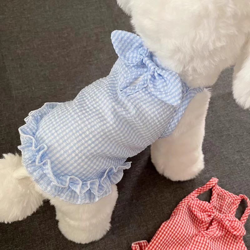 귀여운 격자 무늬 보우 서스펜더 스커트 애완 동물 봄 얇은 개 고양이 테디 비숑 여름 옷