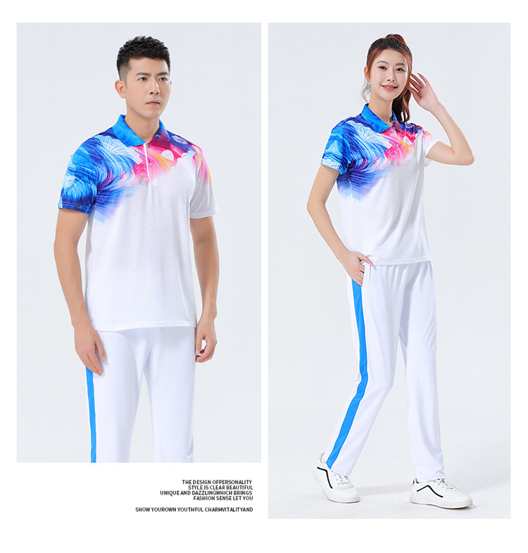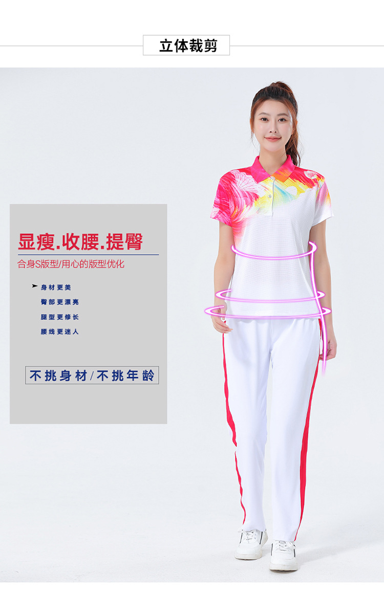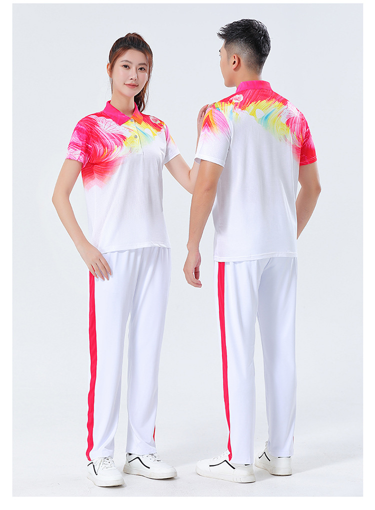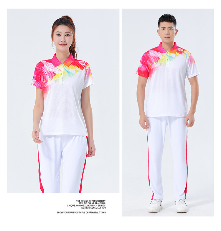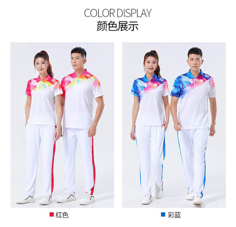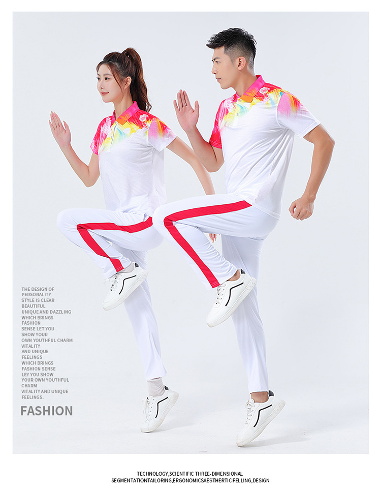 칭웨이 스퀘어 댄스 운동복 여성용 속건성 반팔 세트 남성용 공연복 워킹팀 상의 여름용 초박형 모델