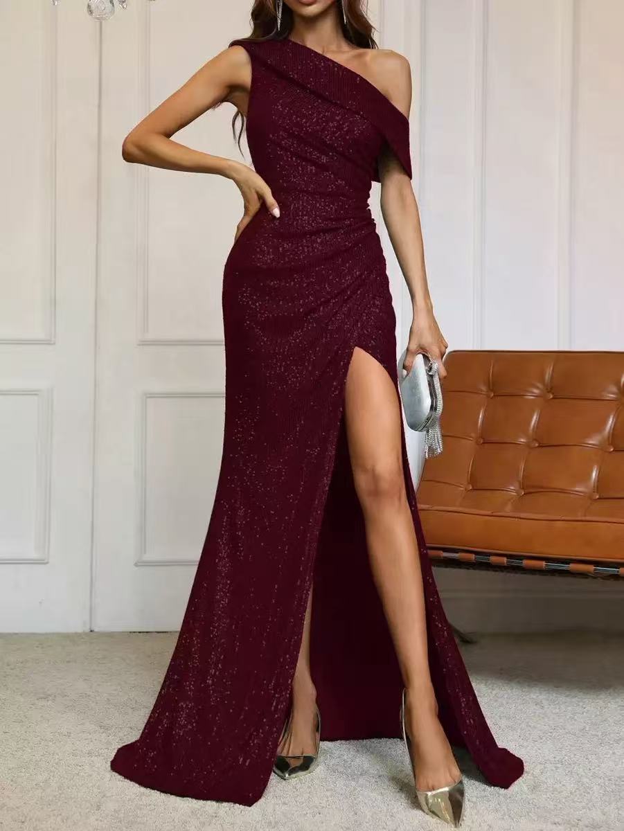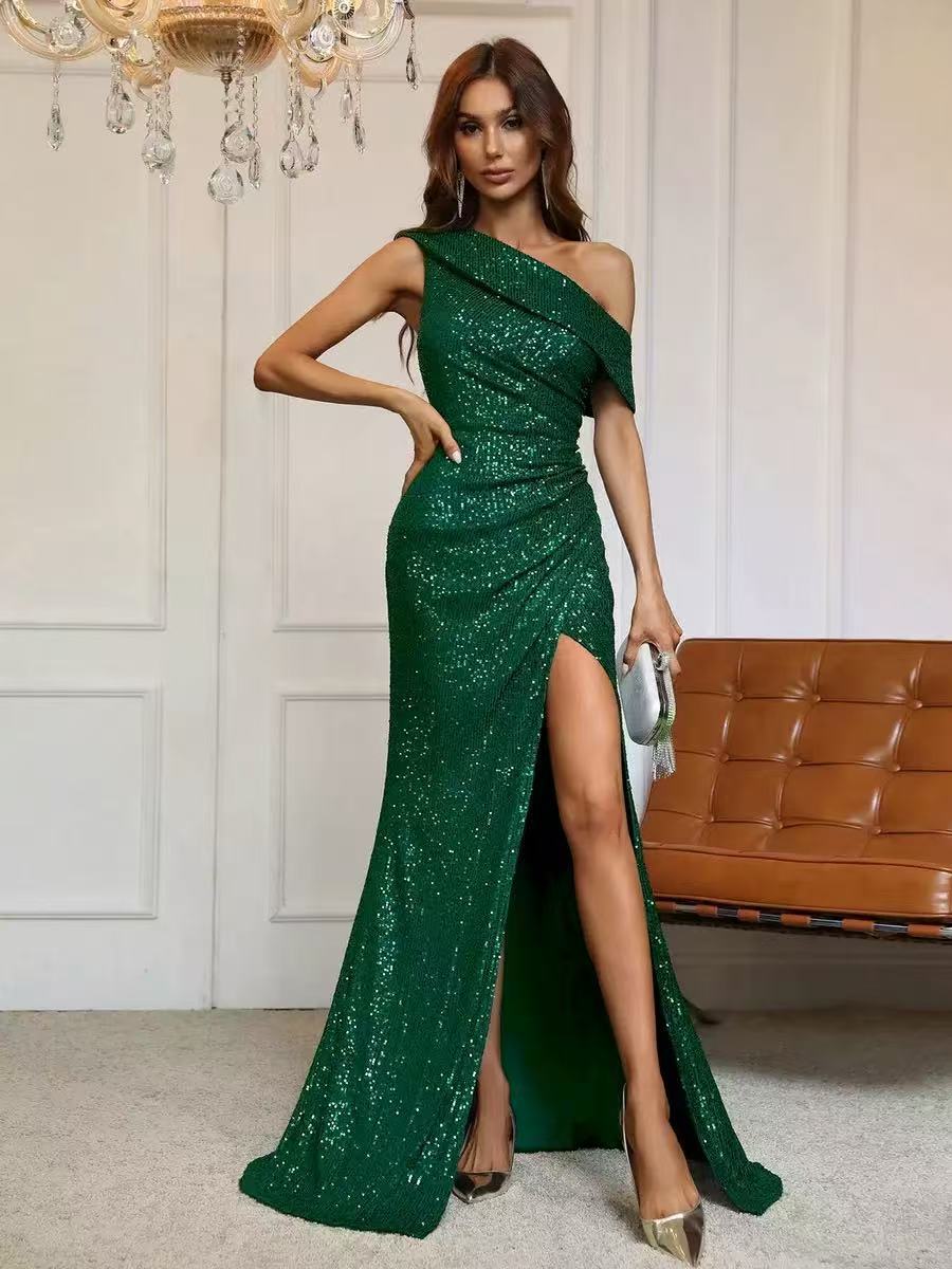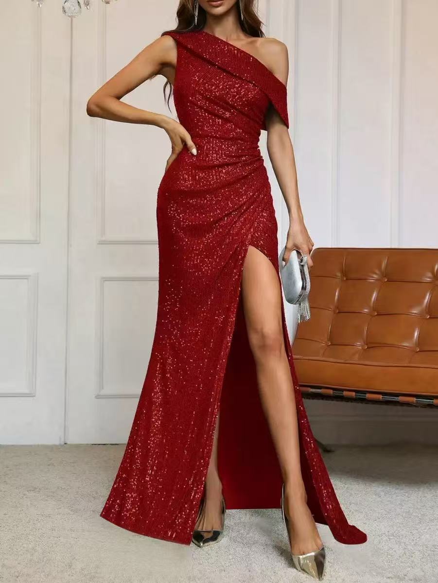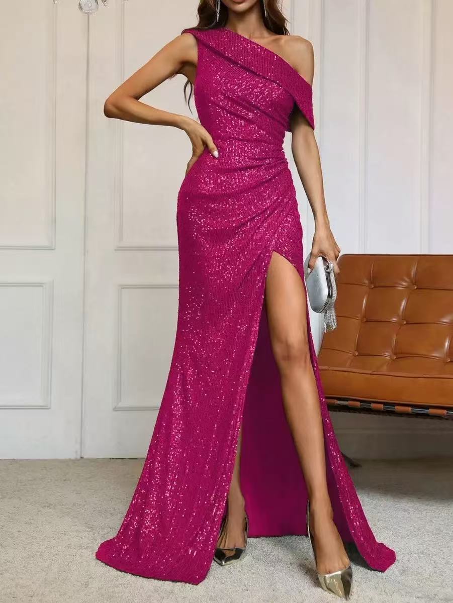2025 여름 유럽과 미국의 국경 간 대외 무역 스팽글 우아한 슬래시 넥 하이 슬릿 연예인 드레스 슬림 핏
