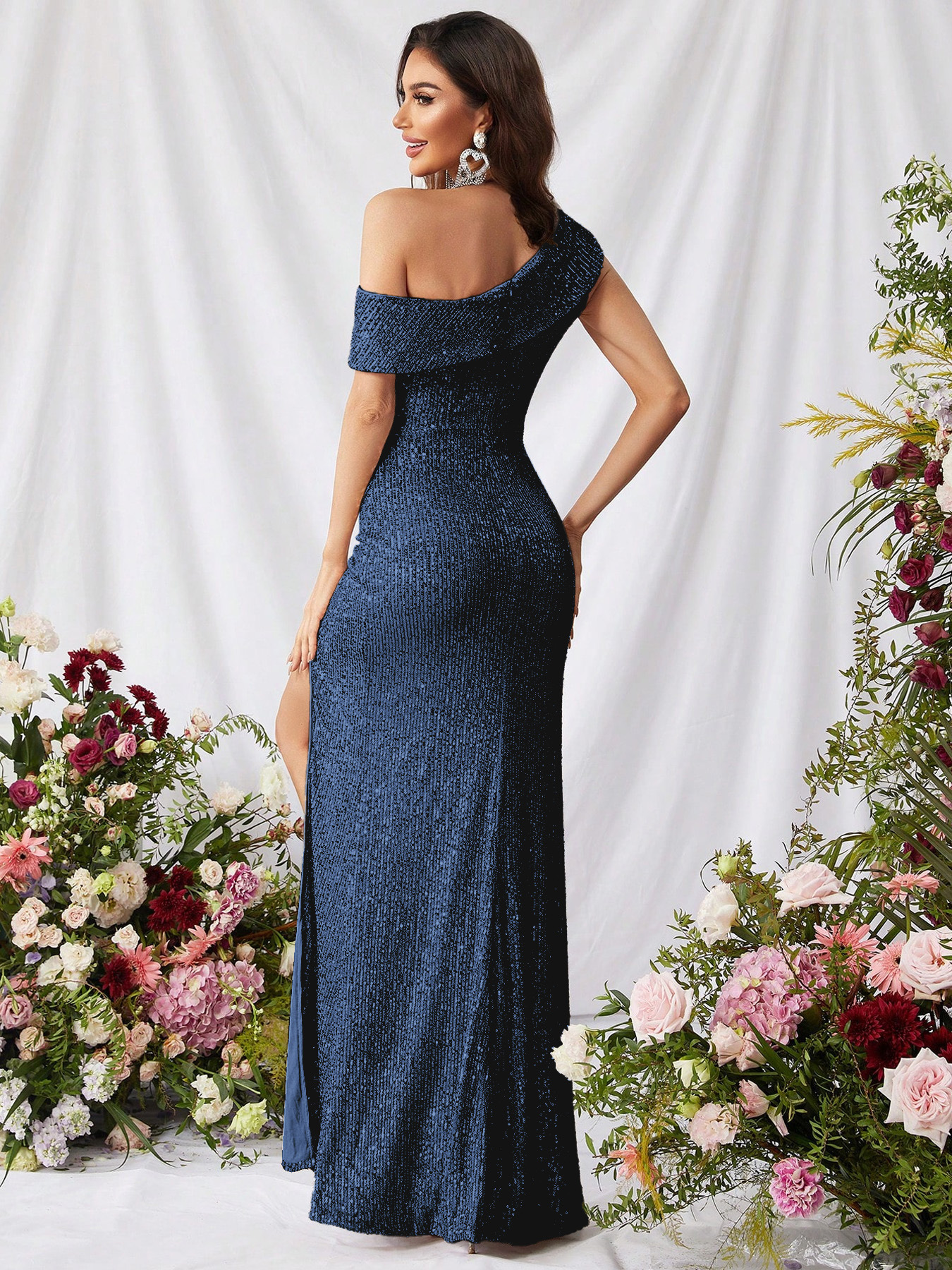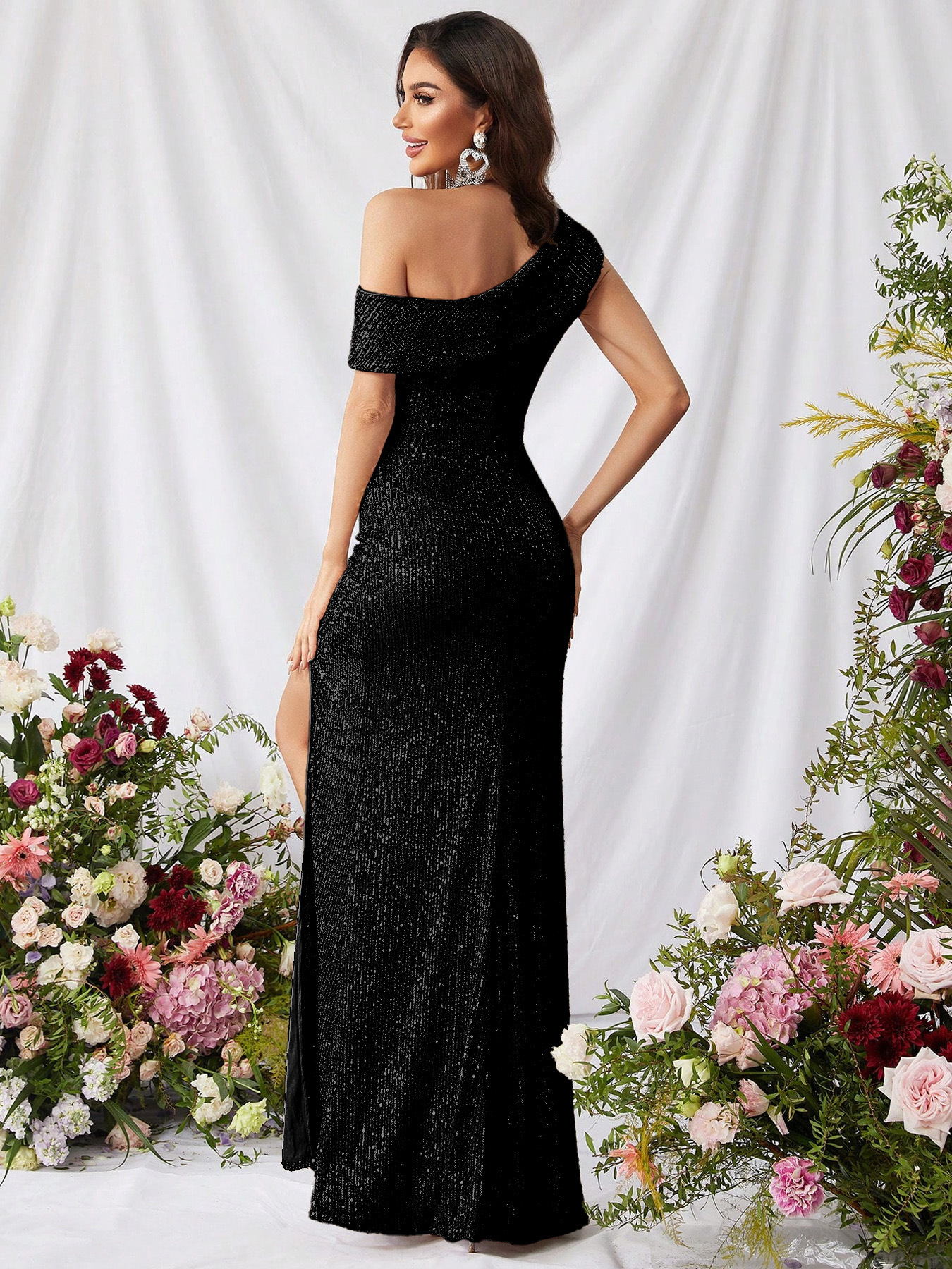 2025 여름 유럽과 미국의 국경 간 대외 무역 스팽글 우아한 슬래시 넥 하이 슬릿 연예인 드레스 슬림 핏스토어 가기