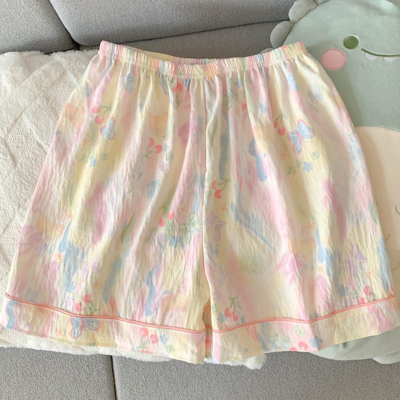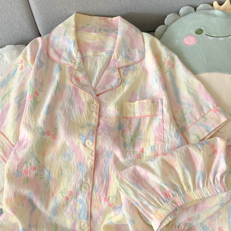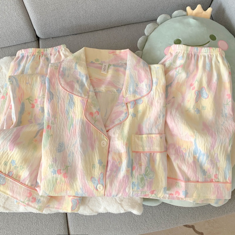 여성을위한 공장 도매 대형 핑크 잠옷 봄과 여름 반팔 달콤한 컬러 얼룩진 꽃 3 피스 세트 외부 착용 가능
