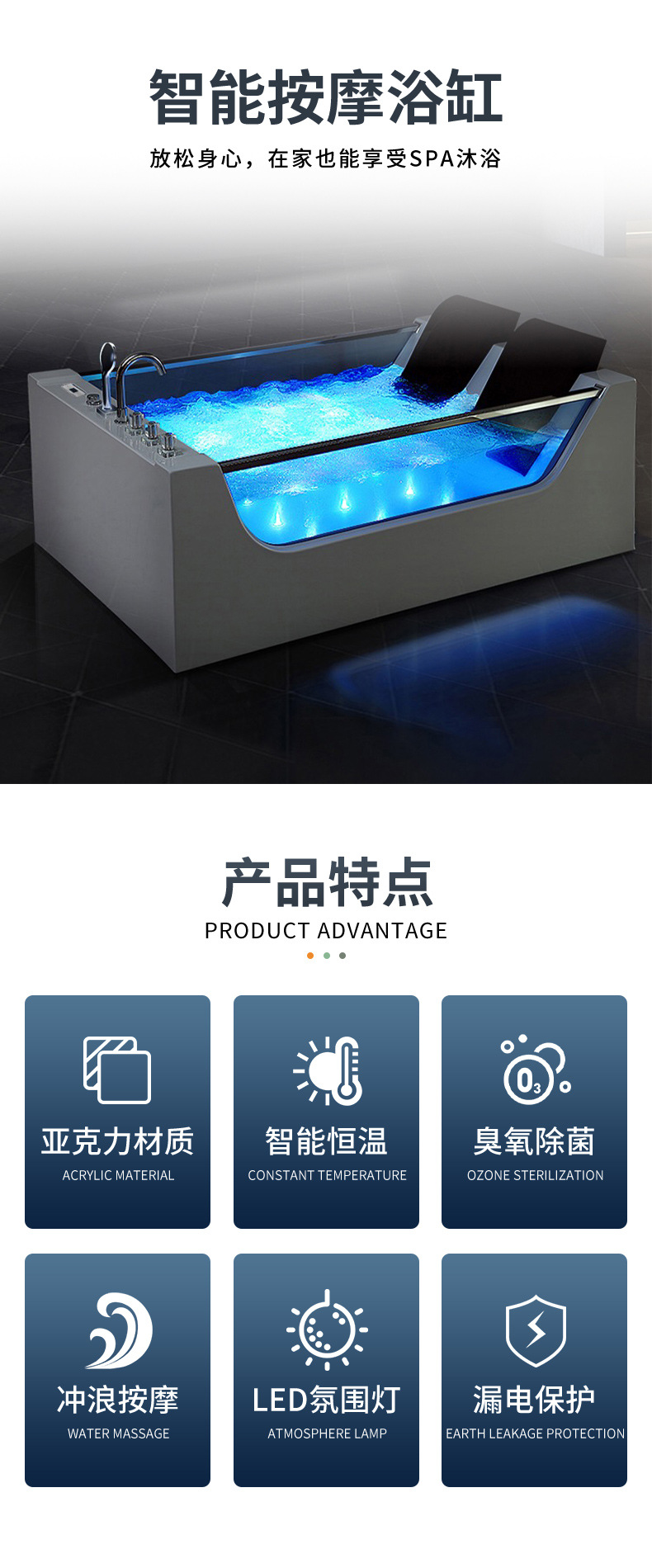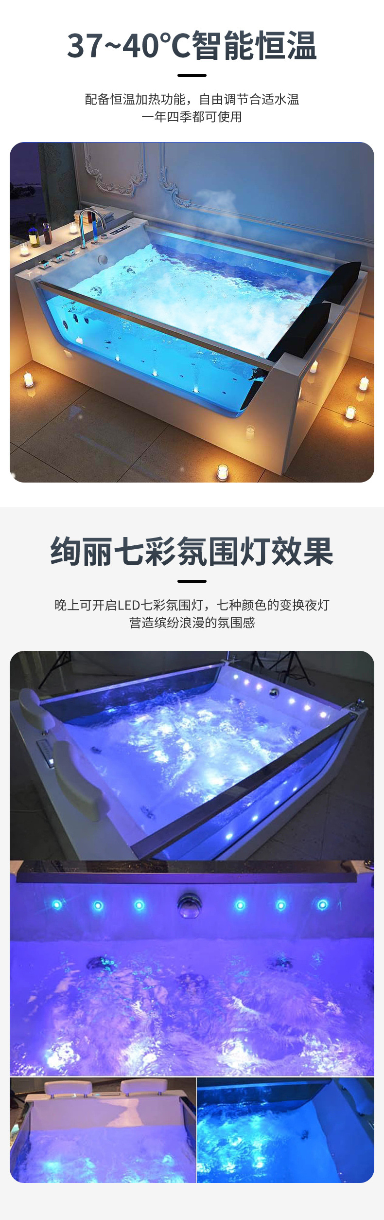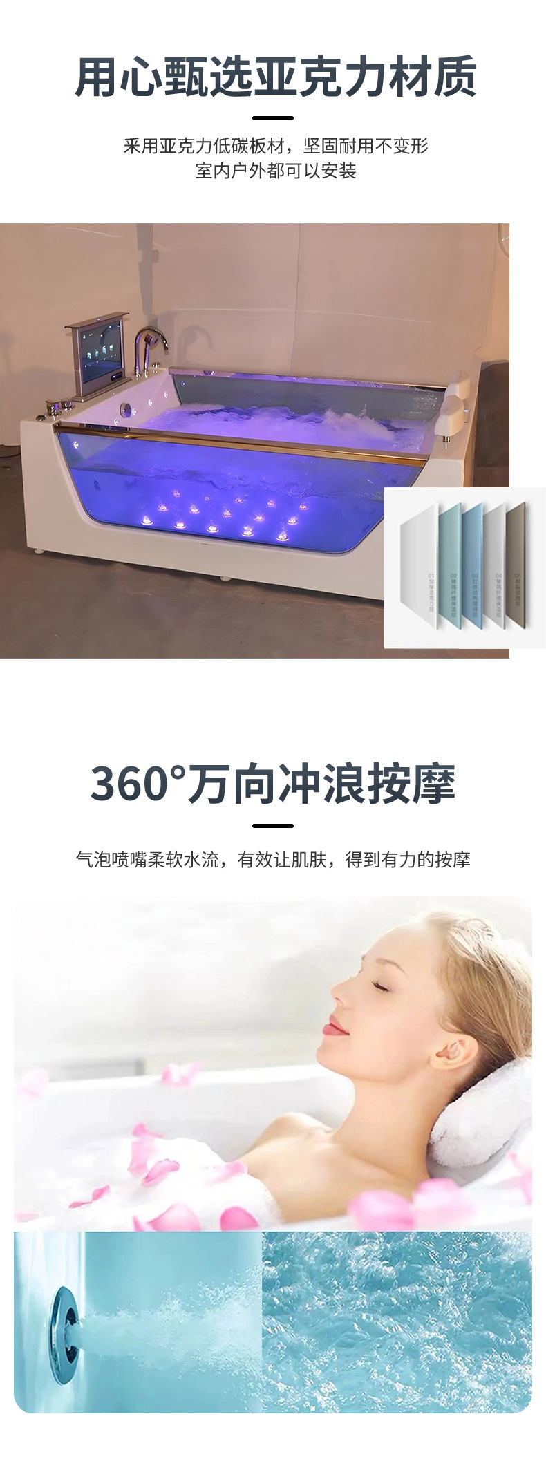 아크릴 독립형 마사지&서핑 기능 양면유리 더블 프렌치 쿠션 욕조, 해외 도매, 항온 가열스토어 가기